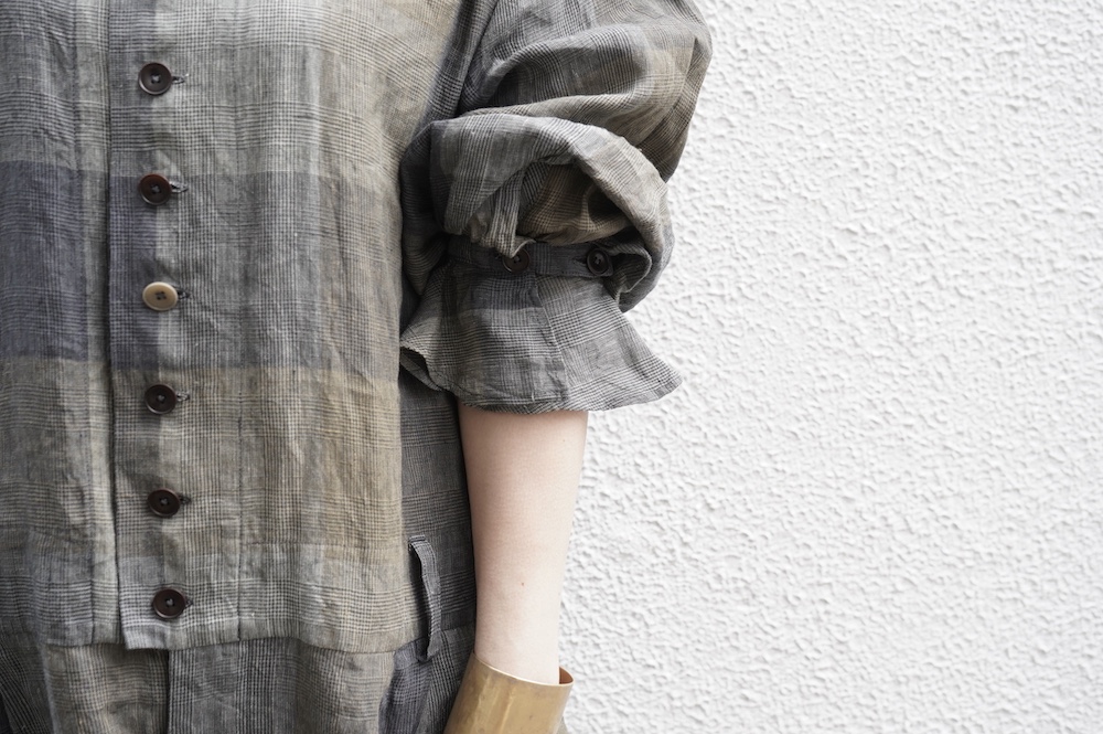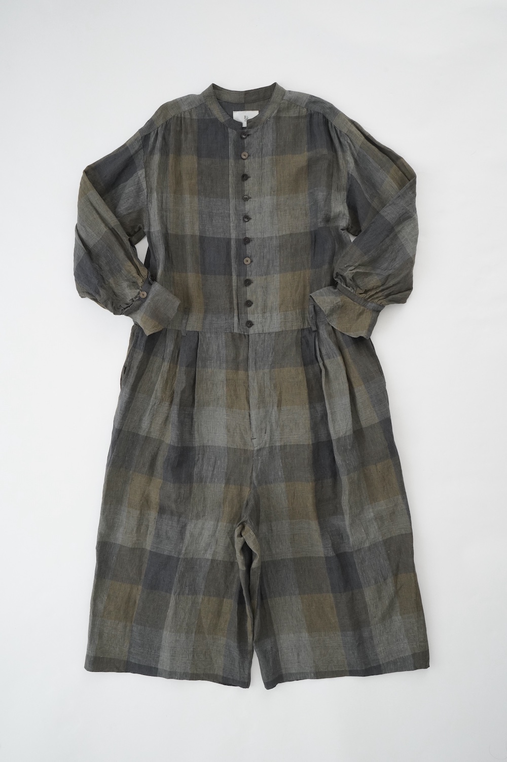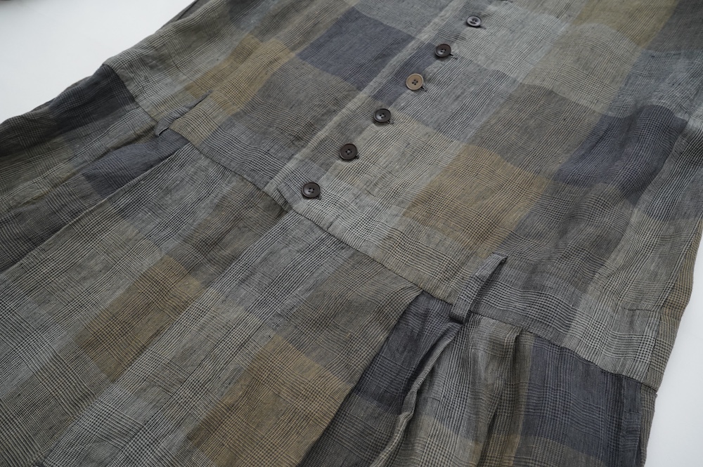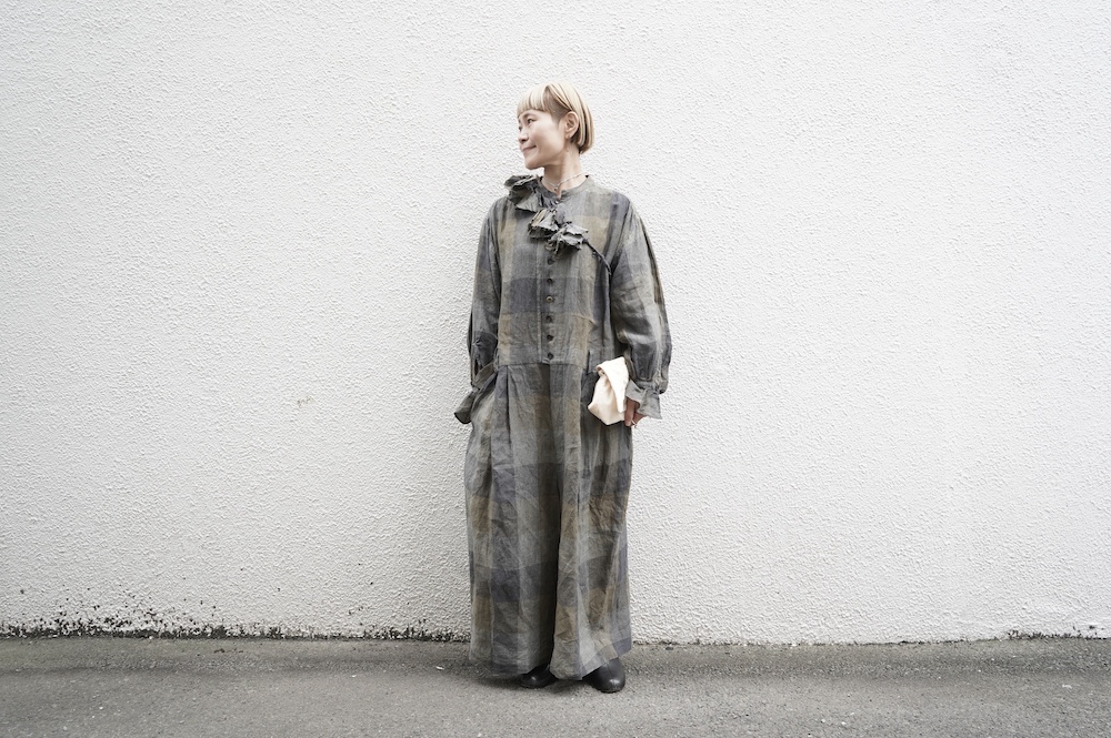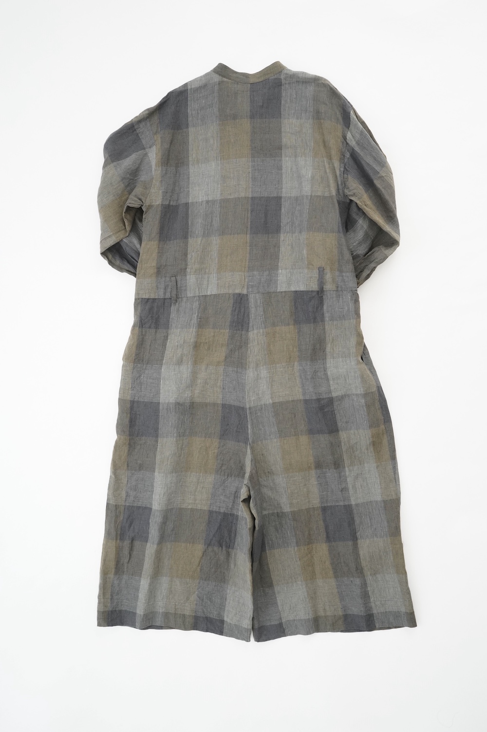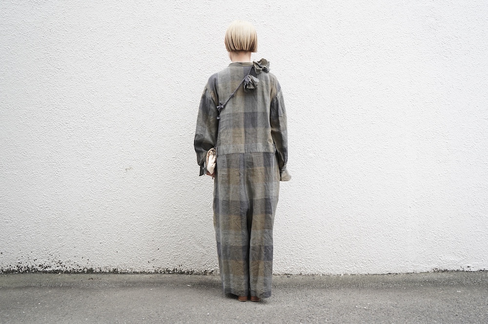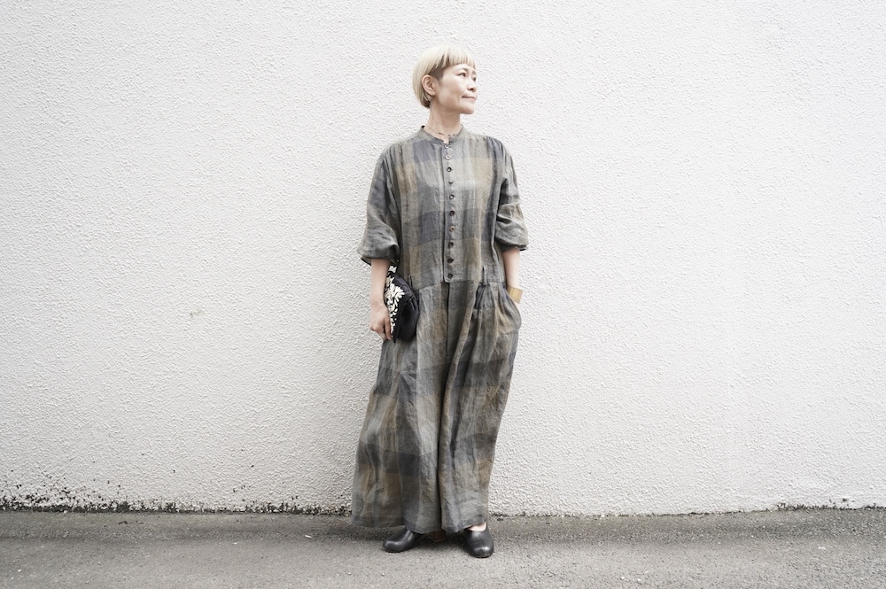 "GASA*"のコンビネゾン。大きなグラデーションチェックの中にグレンチェックが入った、オリジナルのリネン生地を使用。奥行きのある色使いのシックなチェック柄です。夏らしい、シャリっとした清涼感の中に高級感もあるリネン素材で涼しく着ていただけます。