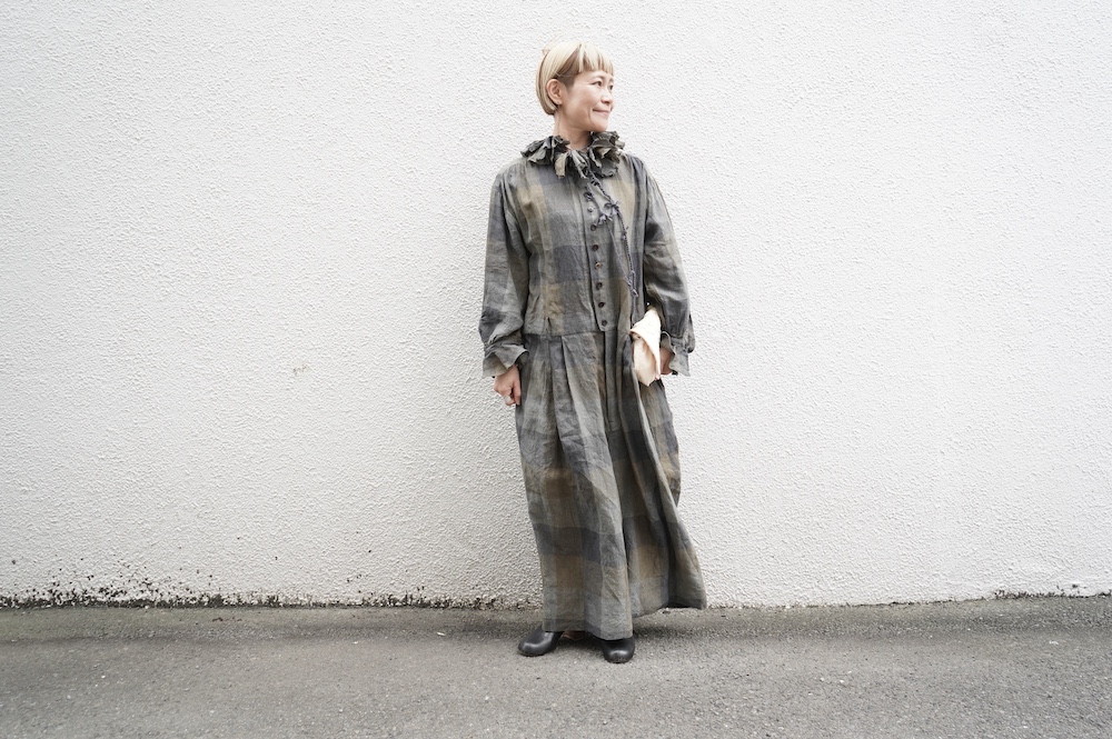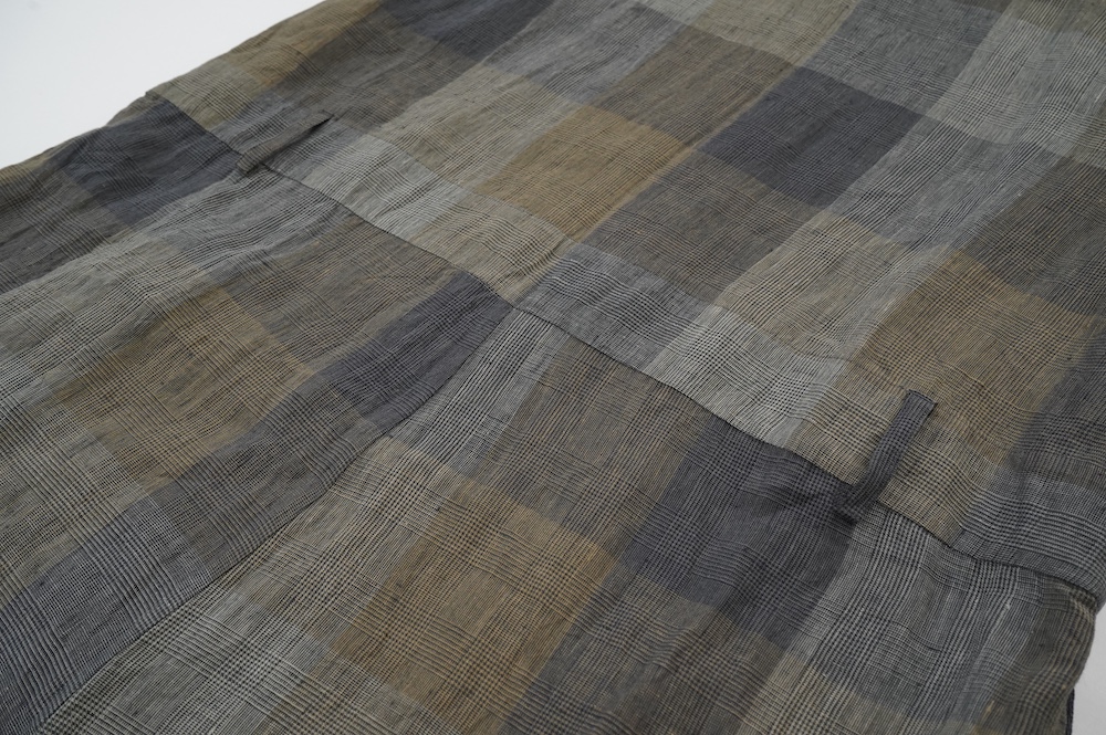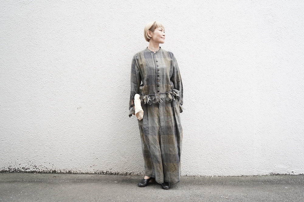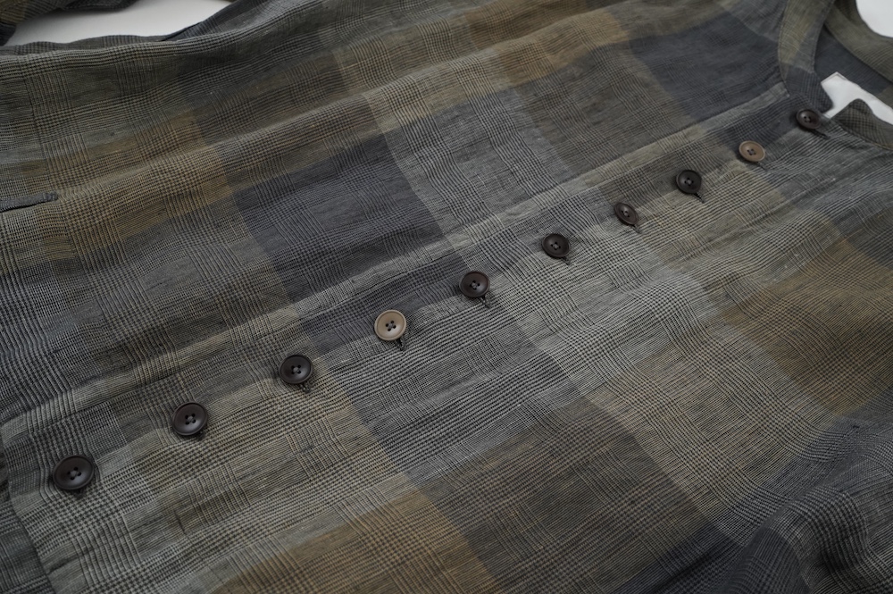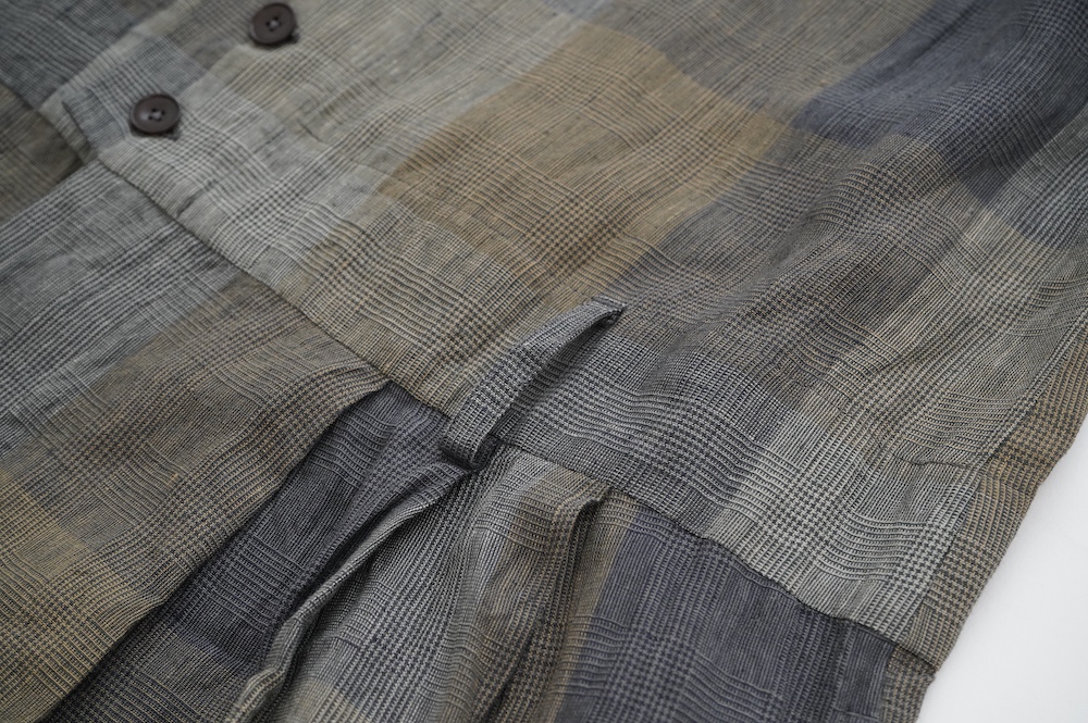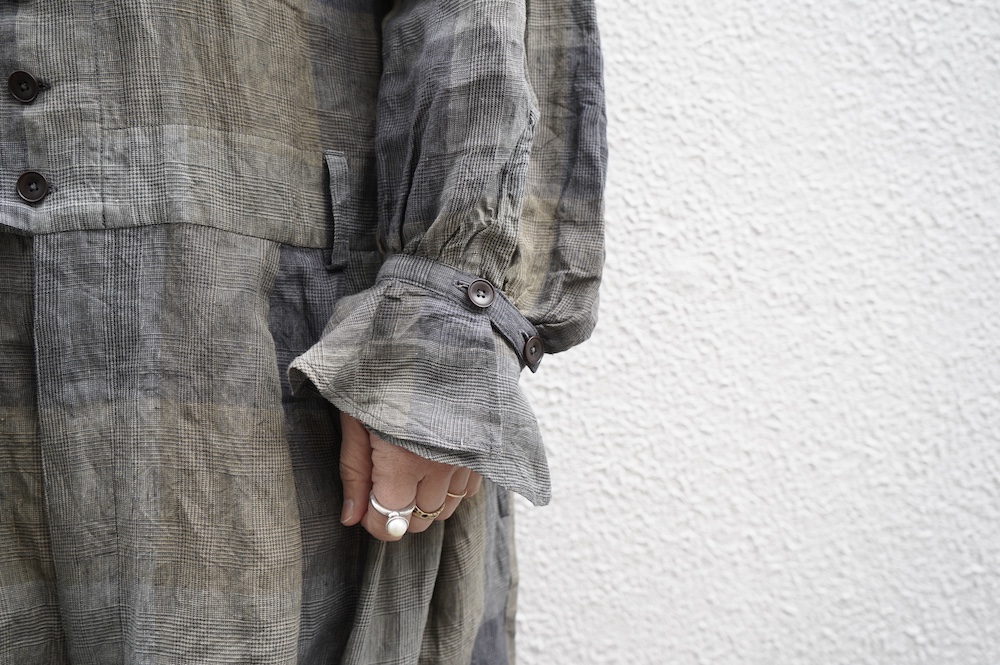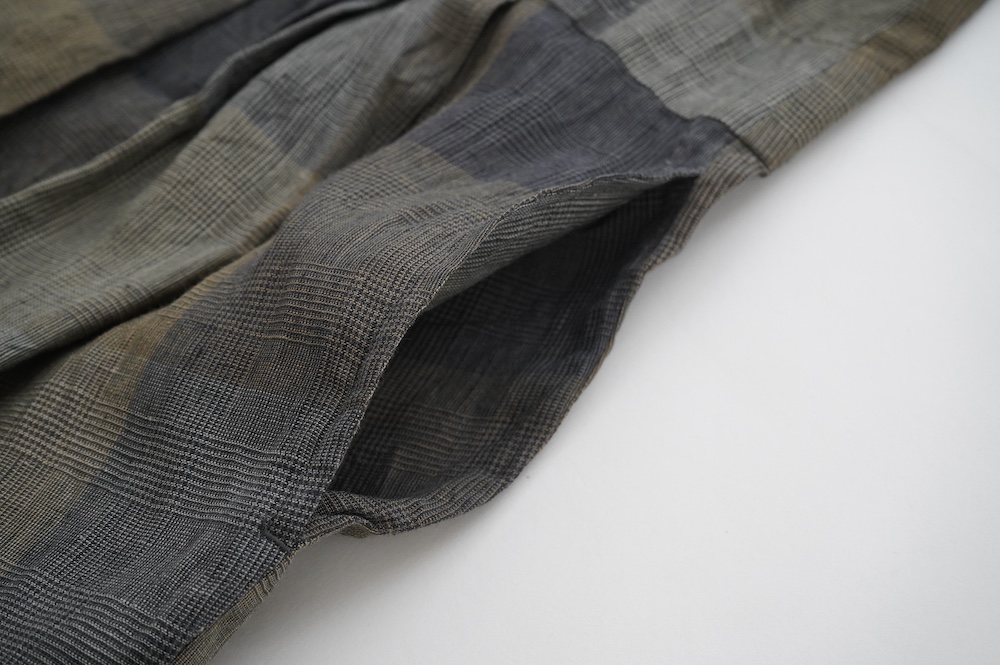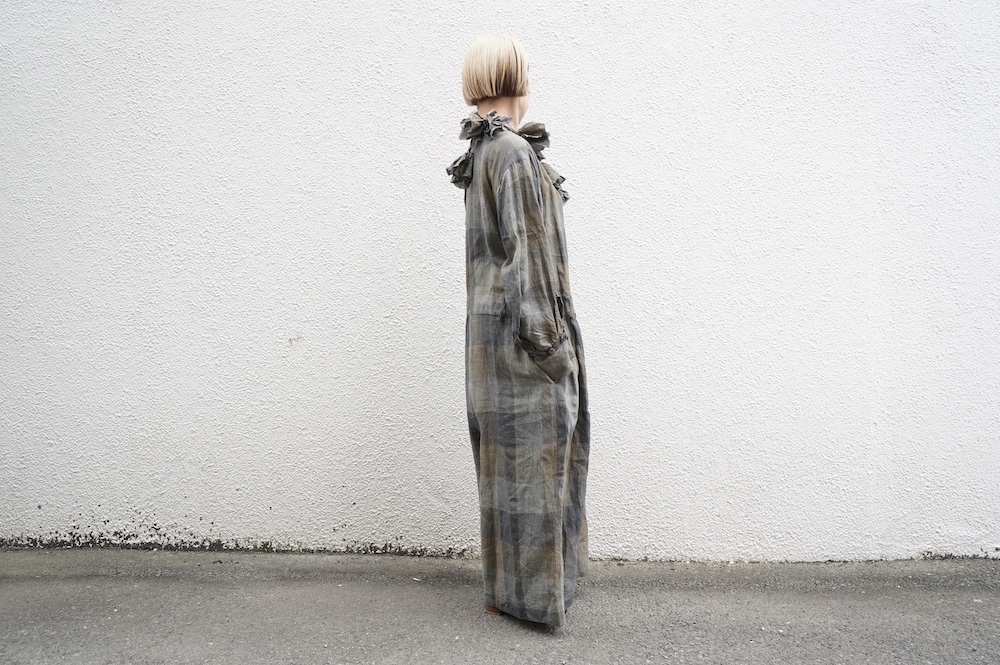 "GASA*"のコンビネゾン。大きなグラデーションチェックの中にグレンチェックが入った、オリジナルのリネン生地を使用。奥行きのある色使いのシックなチェック柄です。夏らしい、シャリっとした清涼感の中に高級感もあるリネン素材で涼しく着ていただけます。