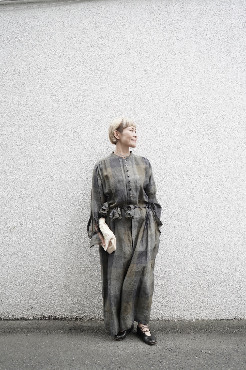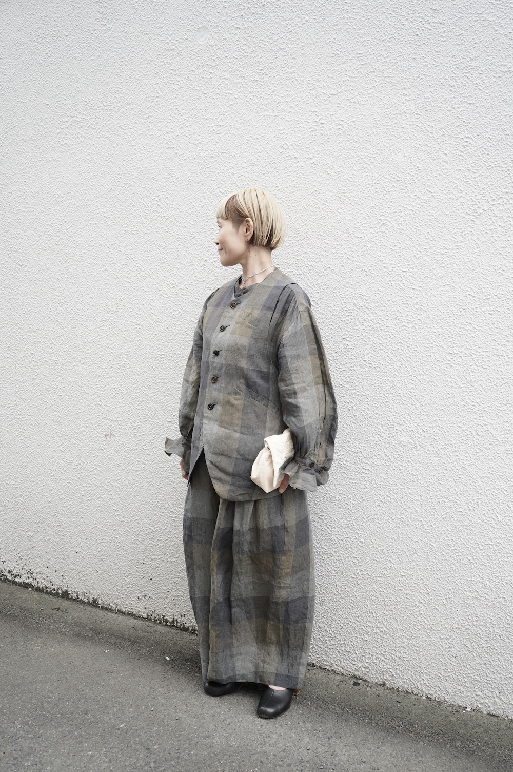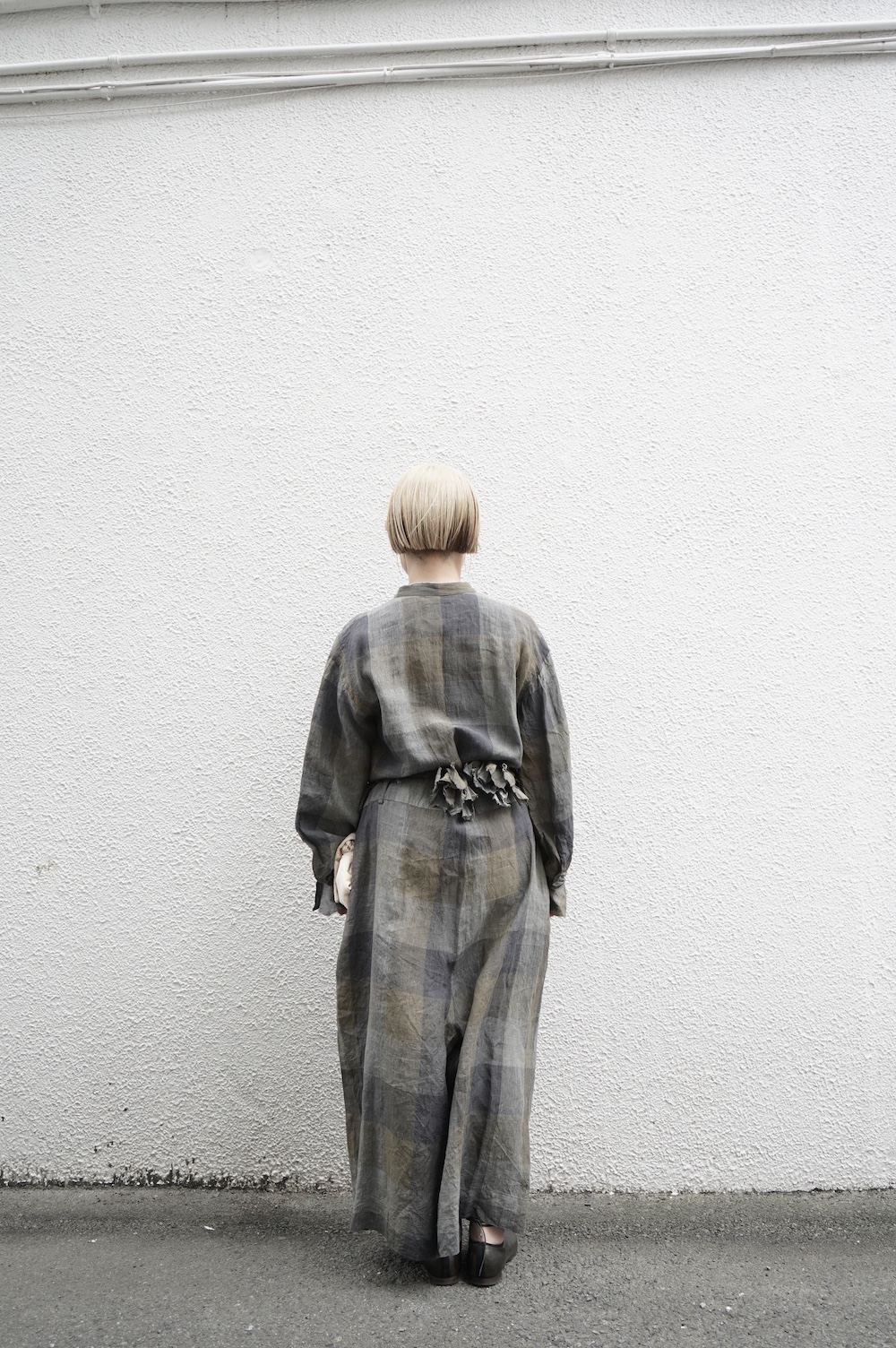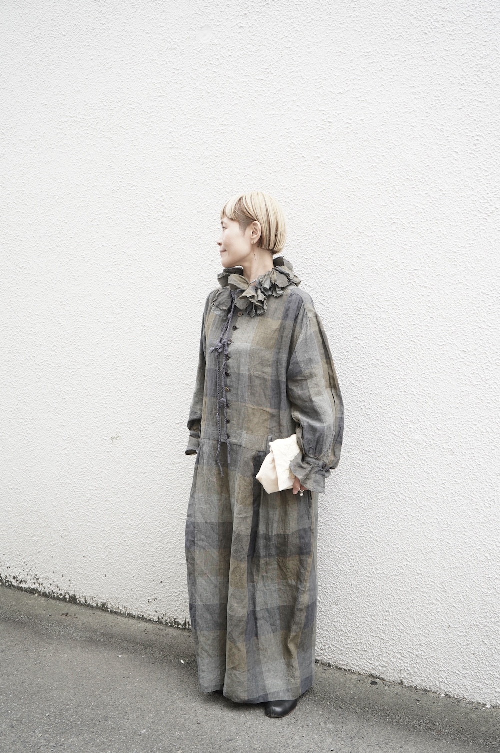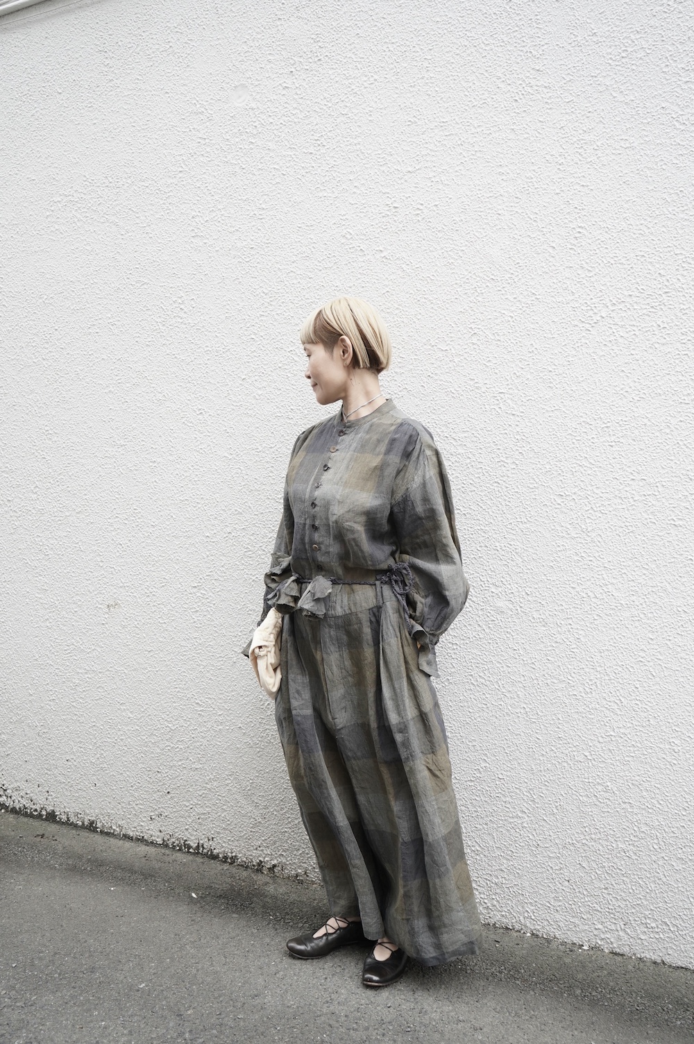 "GASA*"のコンビネゾン。大きなグラデーションチェックの中にグレンチェックが入った、オリジナルのリネン生地を使用。奥行きのある色使いのシックなチェック柄です。夏らしい、シャリっとした清涼感の中に高級感もあるリネン素材で涼しく着ていただけます。