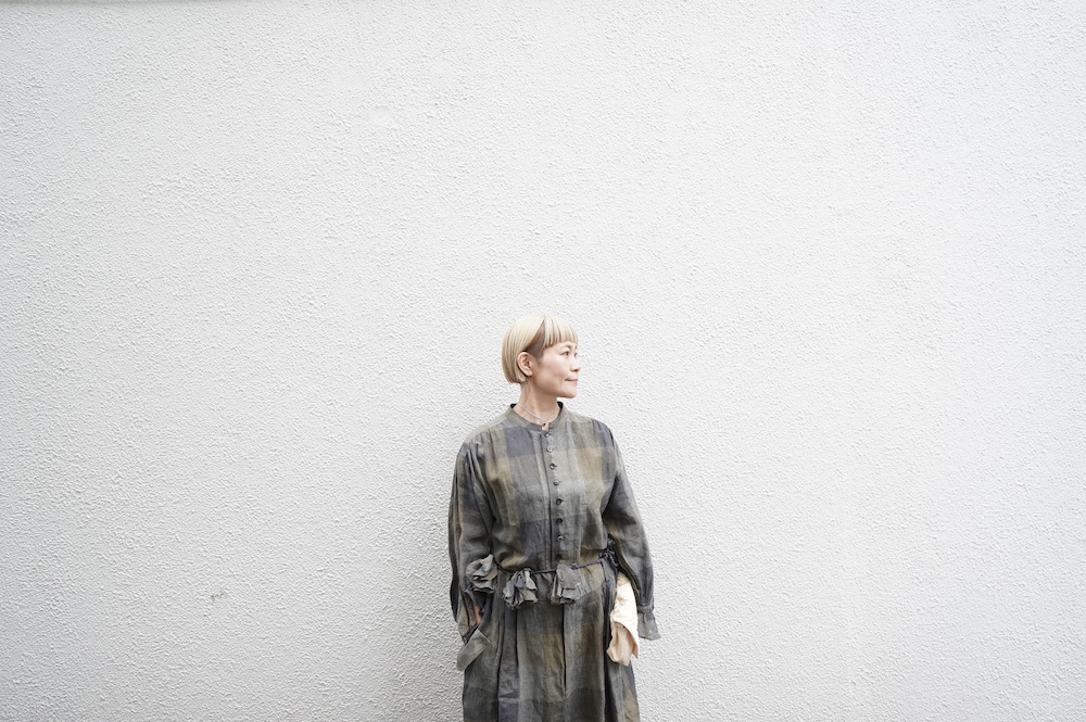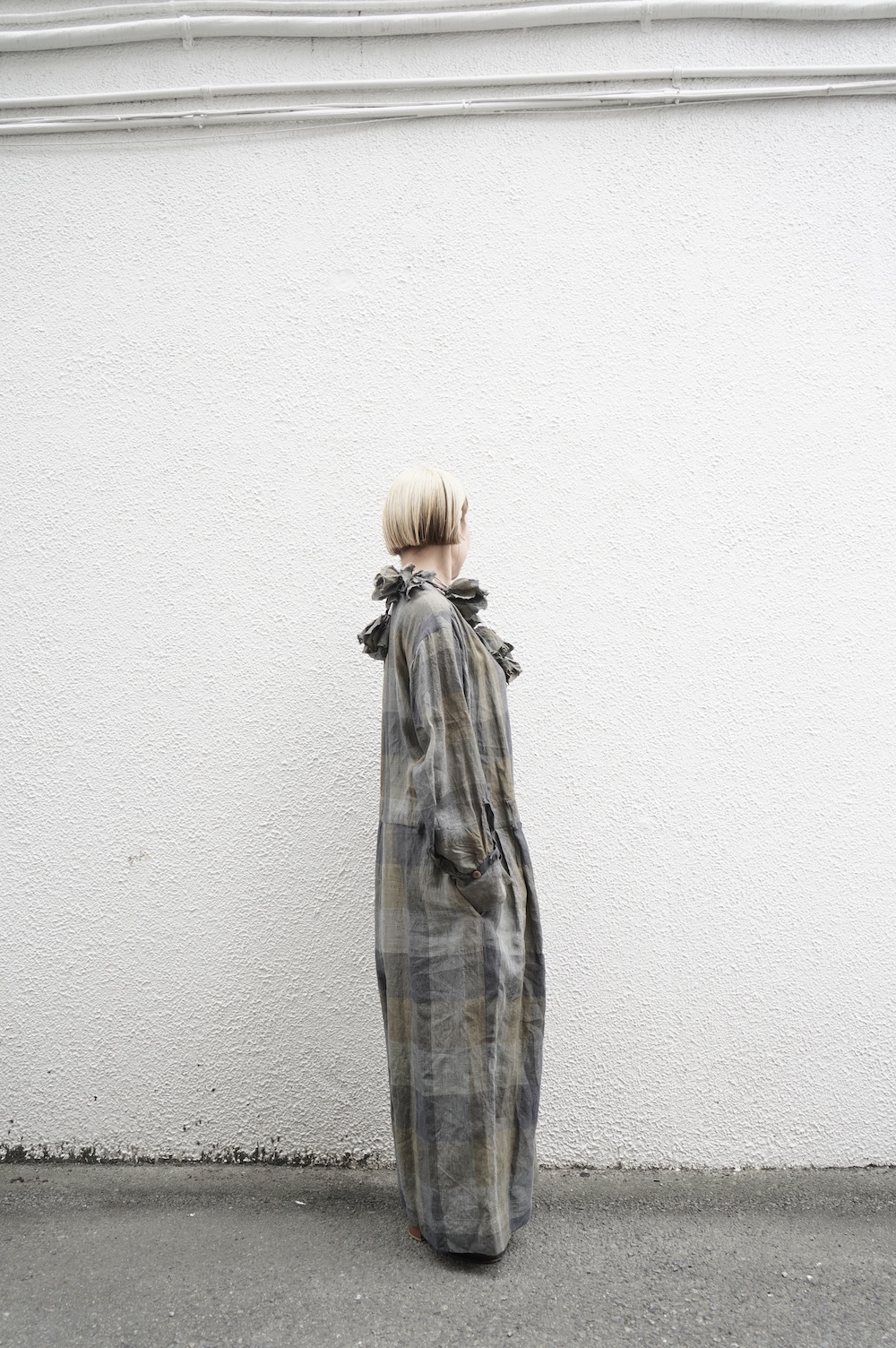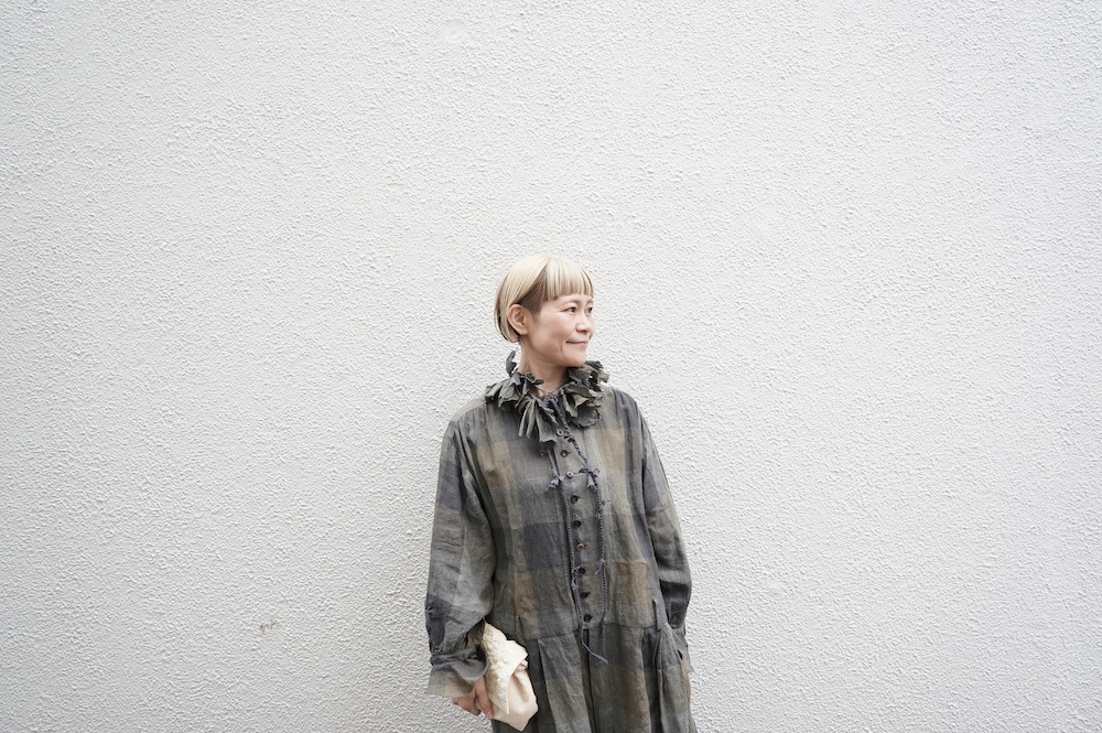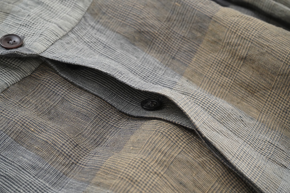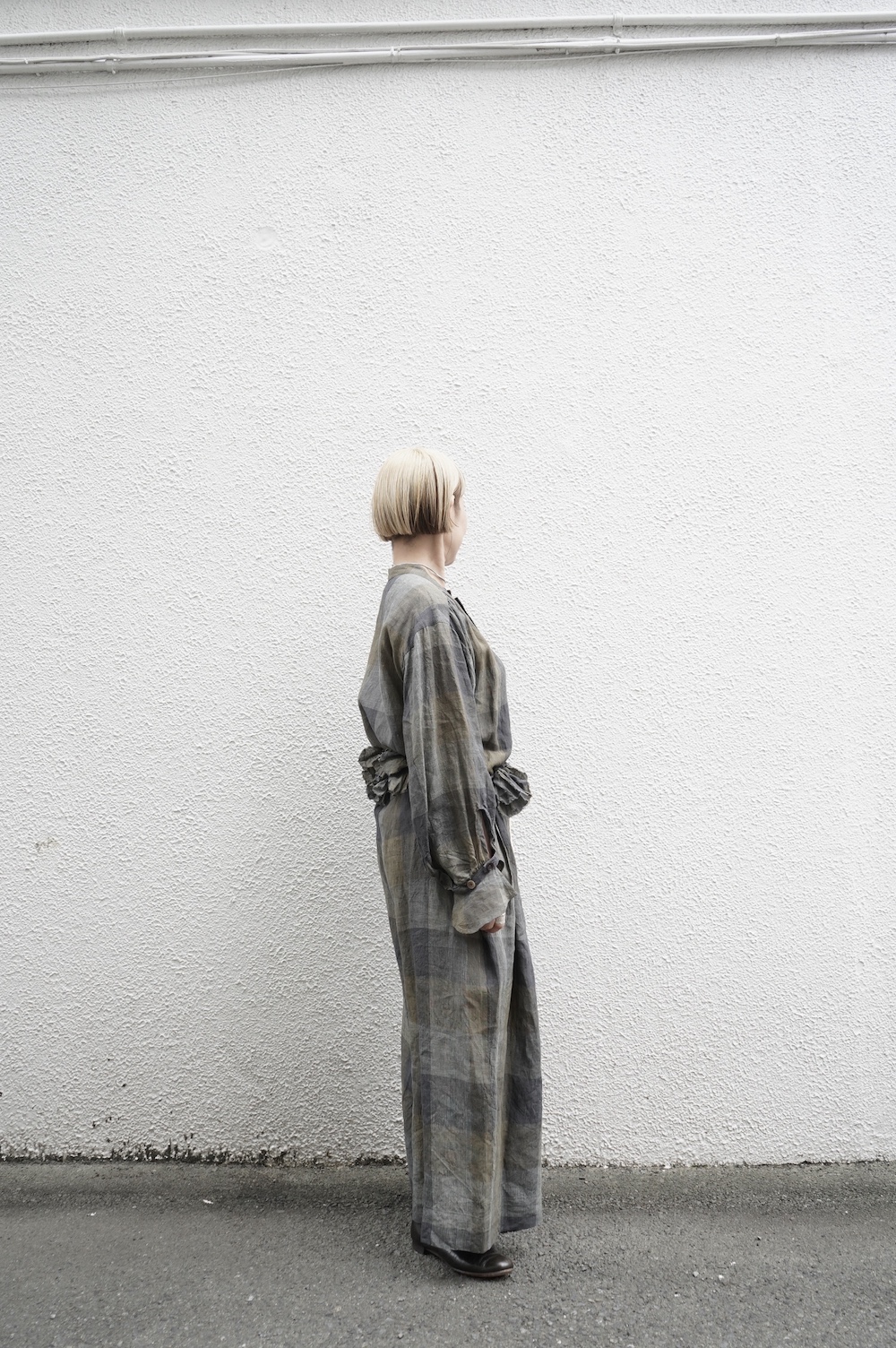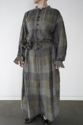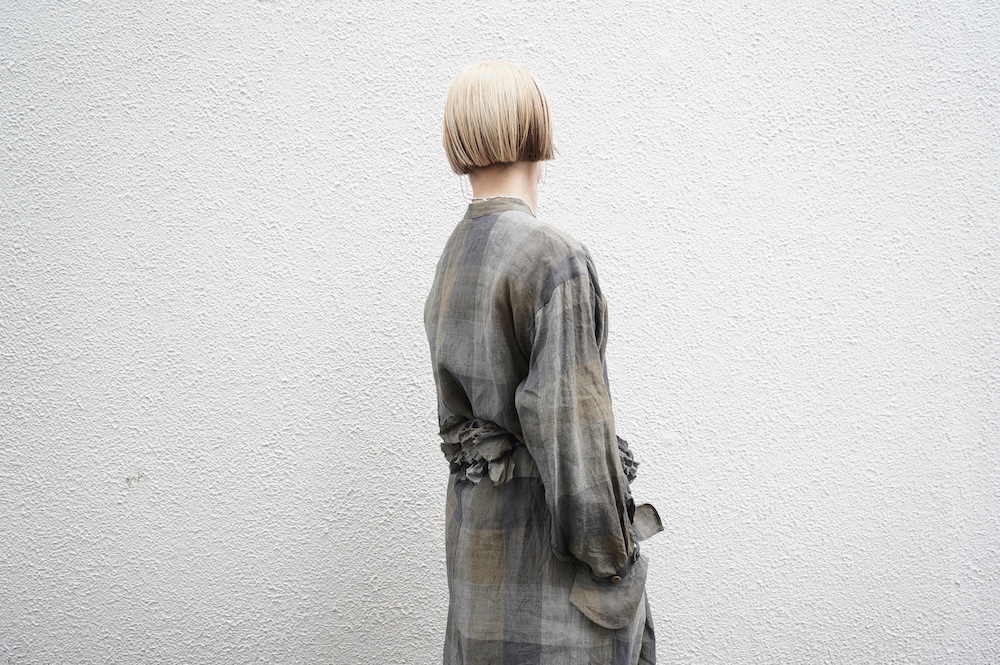 "GASA*"のコンビネゾン。大きなグラデーションチェックの中にグレンチェックが入った、オリジナルのリネン生地を使用。奥行きのある色使いのシックなチェック柄です。夏らしい、シャリっとした清涼感の中に高級感もあるリネン素材で涼しく着ていただけます。