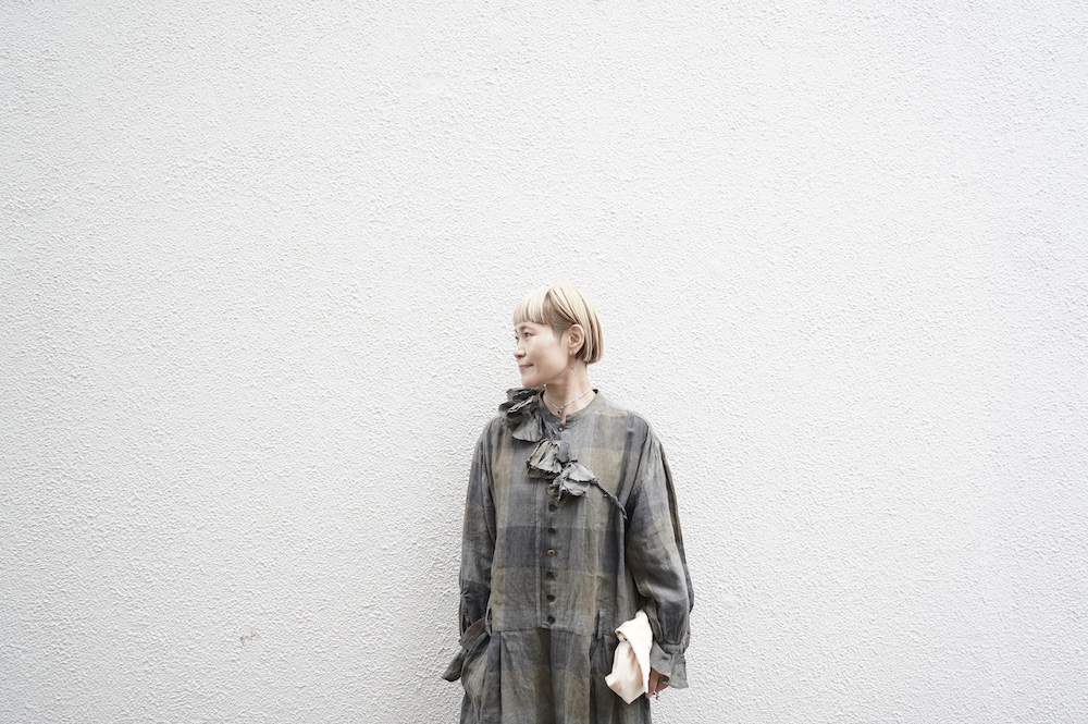 デザインはワイドシルエットのコンビネゾン。前立てとカフスに色の異なるボタンをランダムに使用しているのがアクセントになっています。フリルがついた袖もスタイリングのポイントに。ウエスト切り替え位置(やや下目)にはベルトループがついており、ベルトを使ってブラウジングするとシルエットが変わり、着丈長めですが小柄な方でも着用いただけます。モデルは155cmです。共布で作られたフラワーベルト(別売り)を合わせて、ベルトループに通したり、たすき掛けしてストールのようにポイント使いしても素敵です。