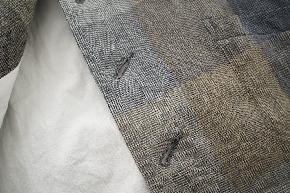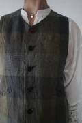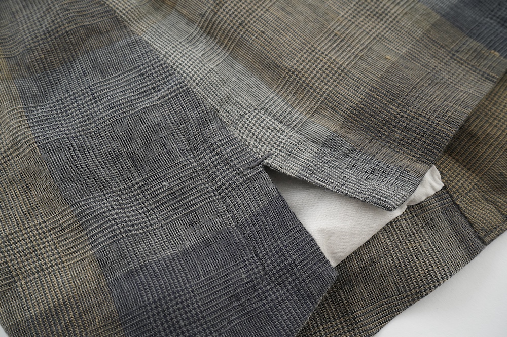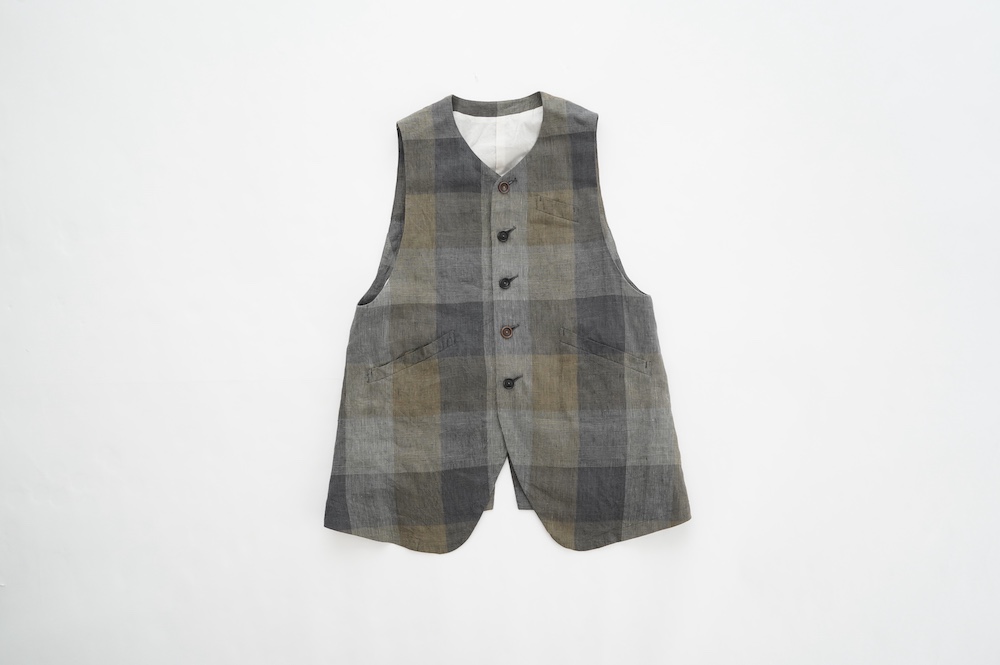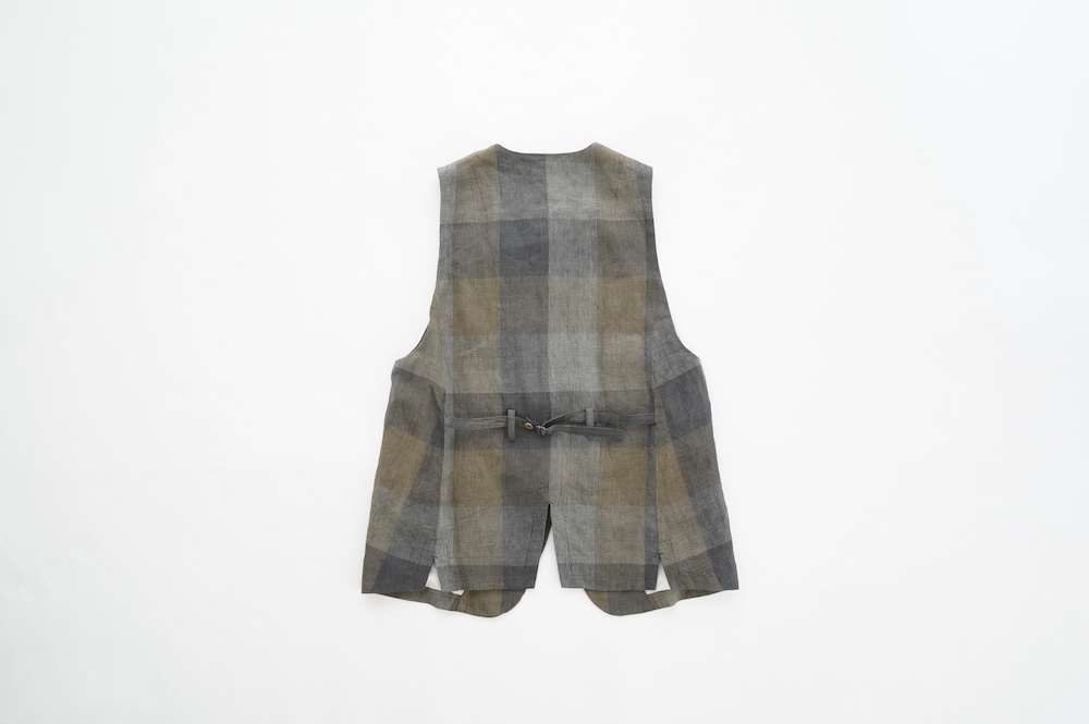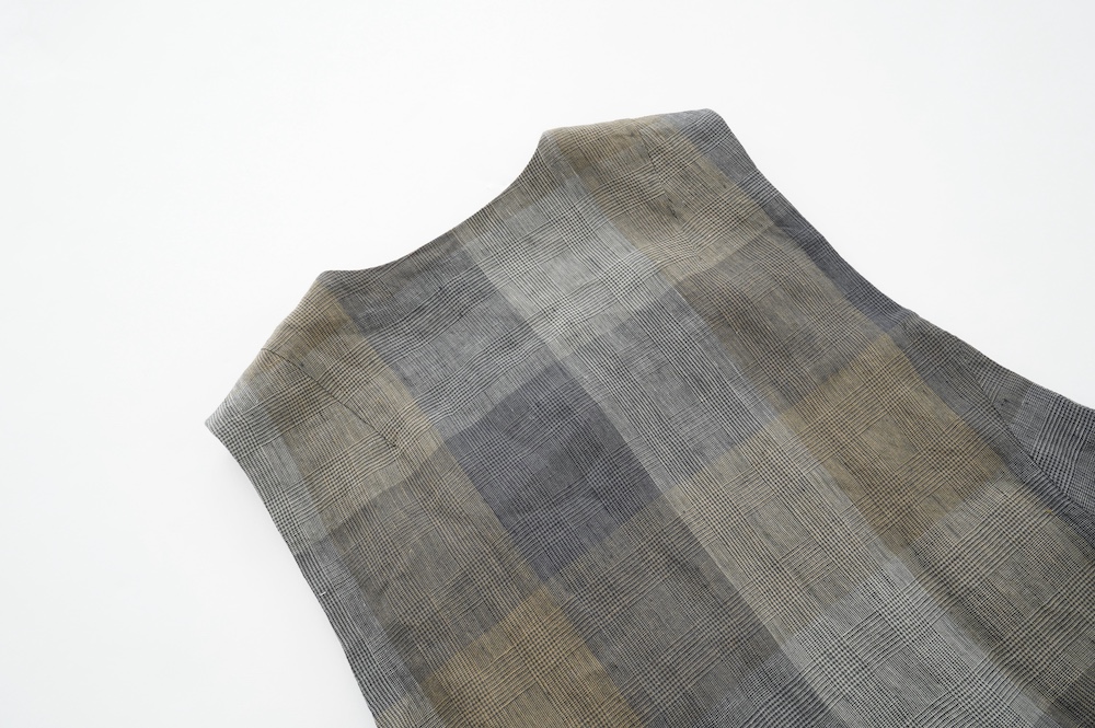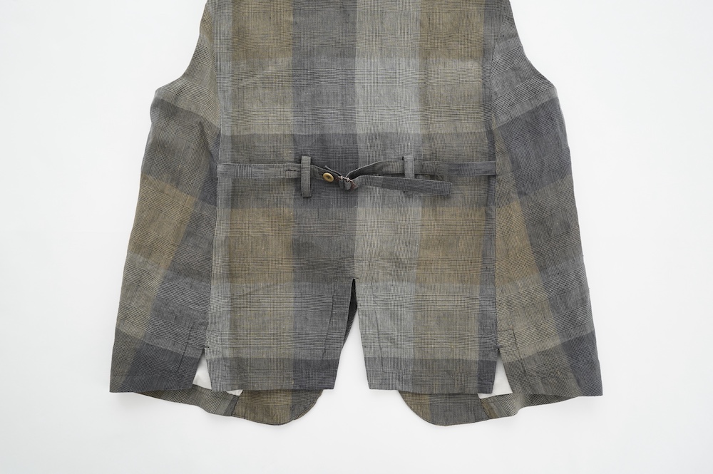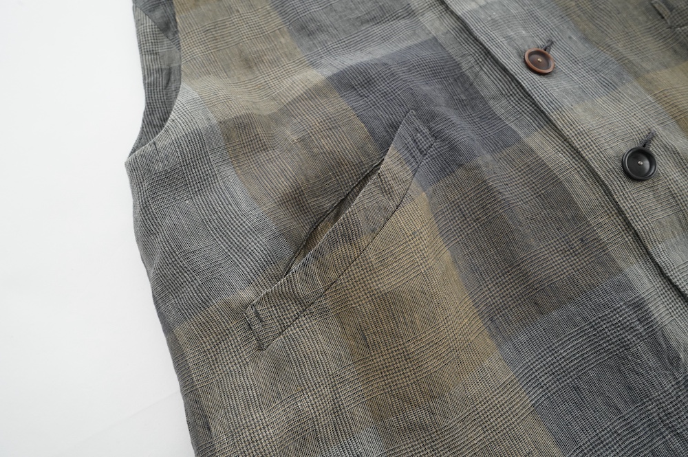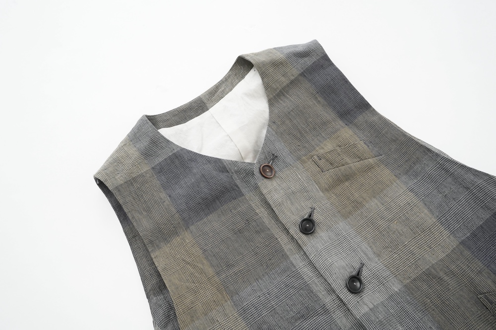 "GASA*"のベスト。大きなグラデーションチェックの中にグレンチェックが入った、オリジナルのリネン生地を使用。奥行きのある色使いのシックなチェック柄です。夏らしい、シャリっとした清涼感の中に高級感もあるリネン素材で涼しく着ていただけます。裏地にはコットン生地を使用しています。