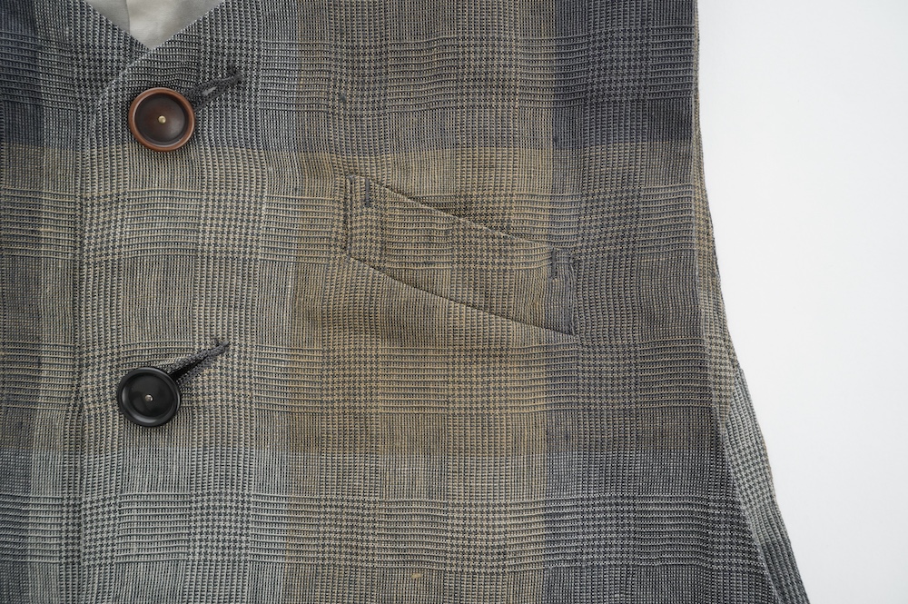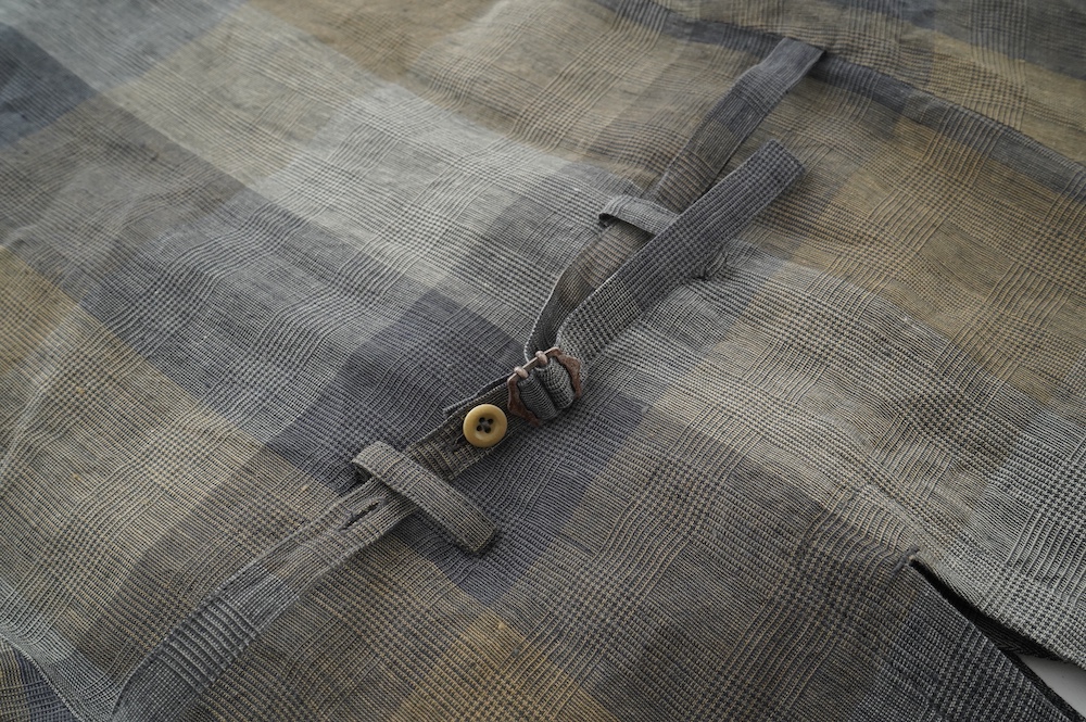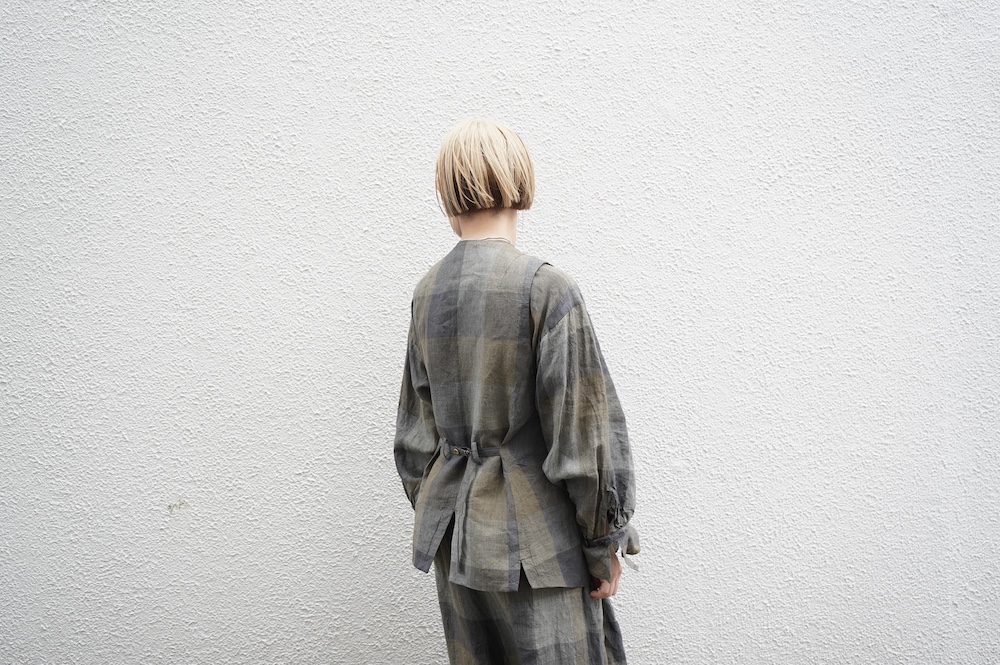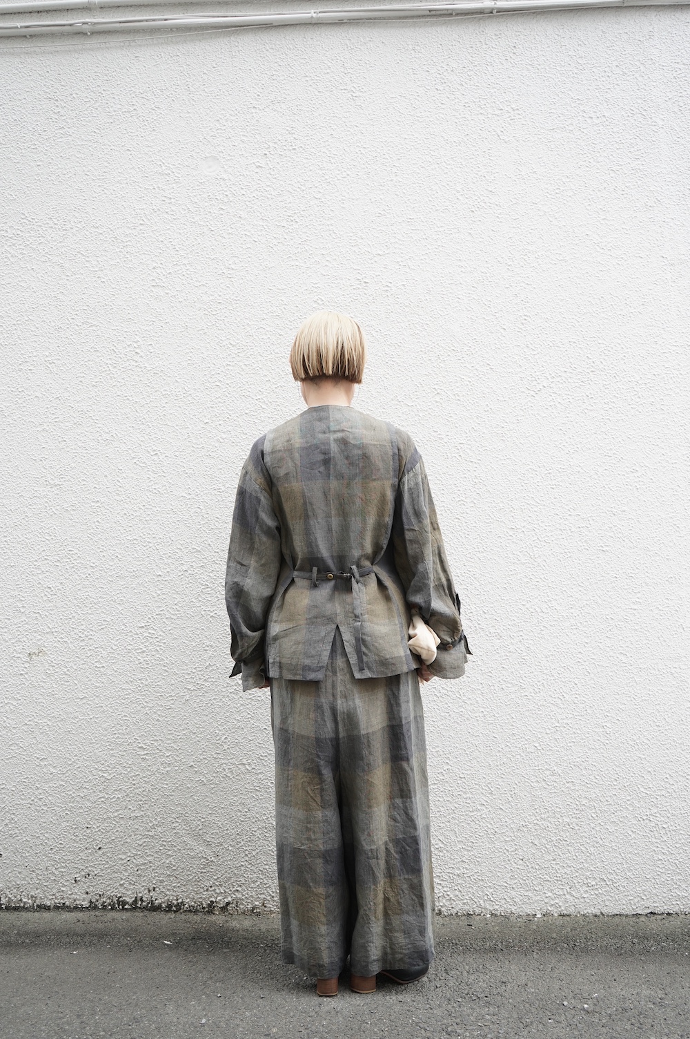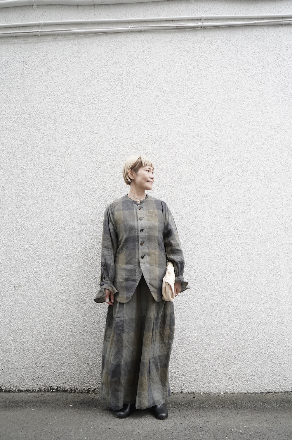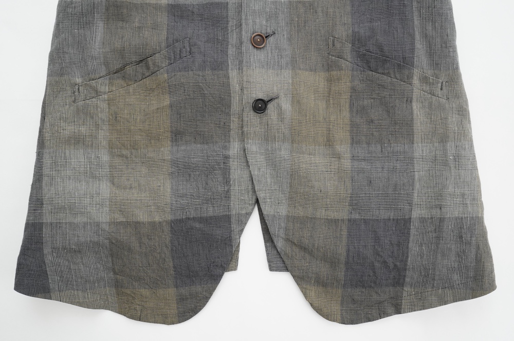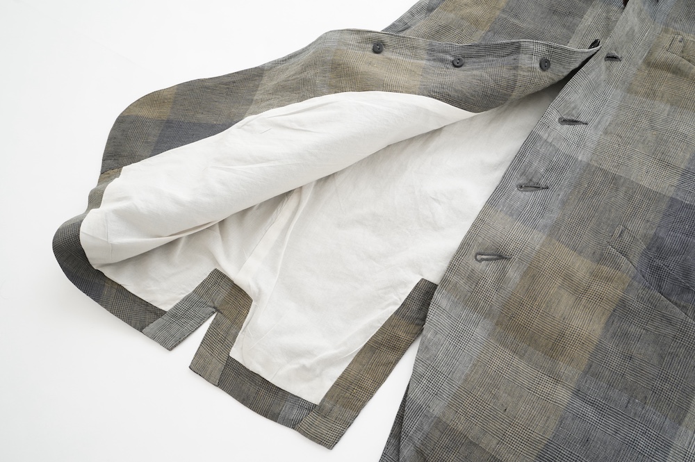 "GASA*"のベスト。大きなグラデーションチェックの中にグレンチェックが入った、オリジナルのリネン生地を使用。奥行きのある色使いのシックなチェック柄です。夏らしい、シャリっとした清涼感の中に高級感もあるリネン素材で涼しく着ていただけます。裏地にはコットン生地を使用しています。