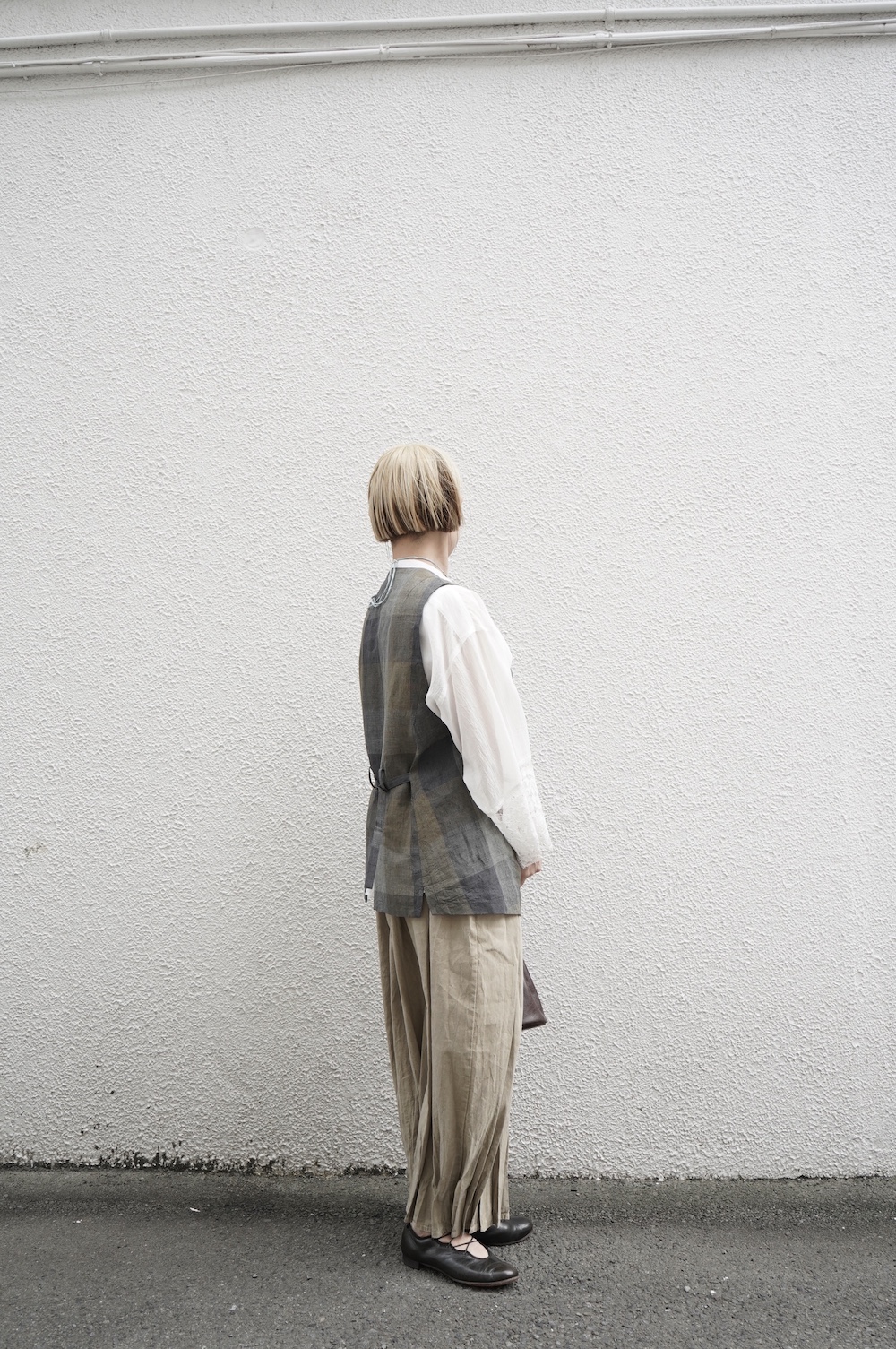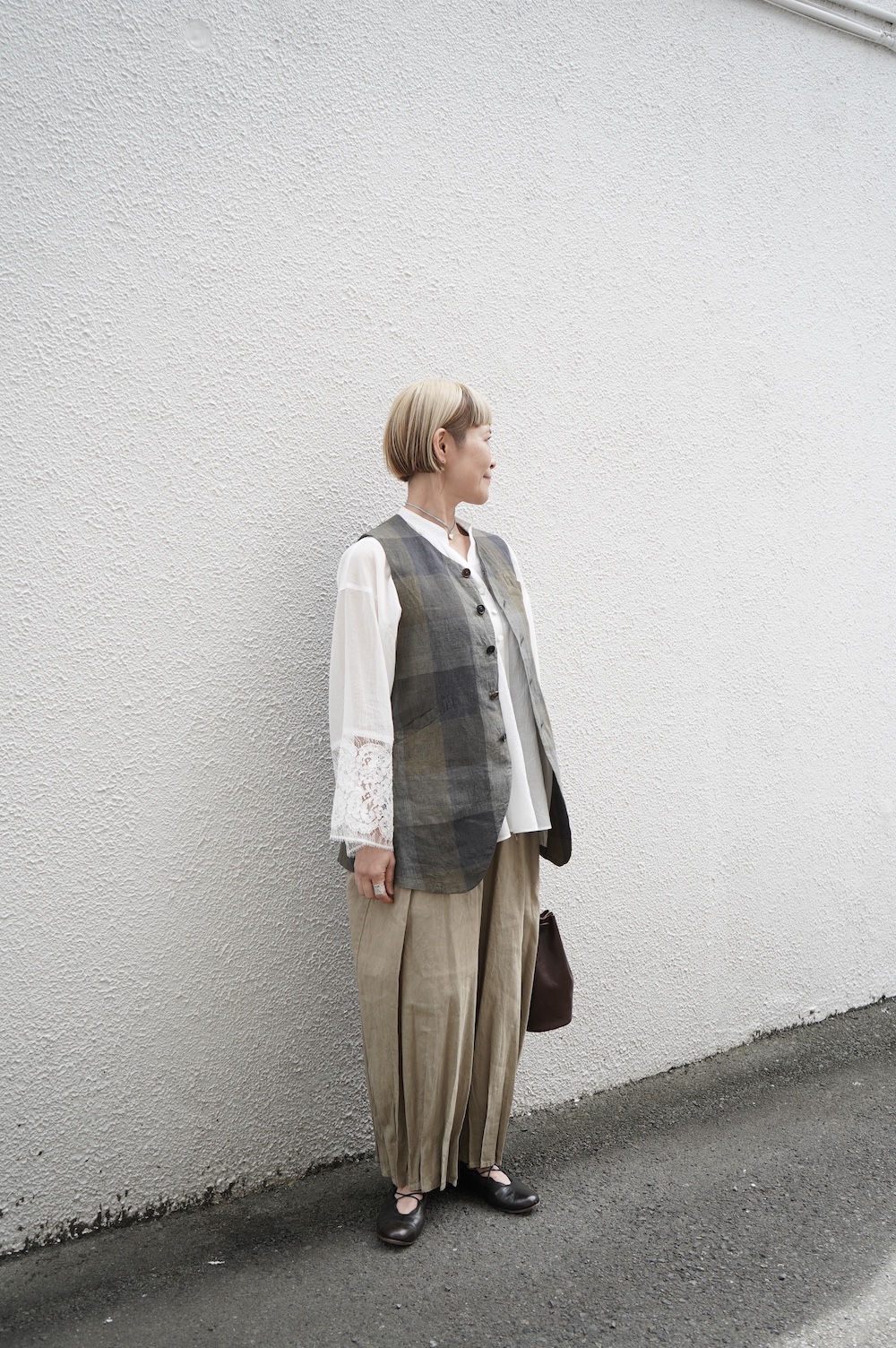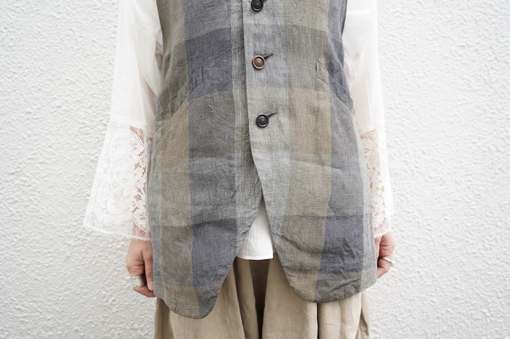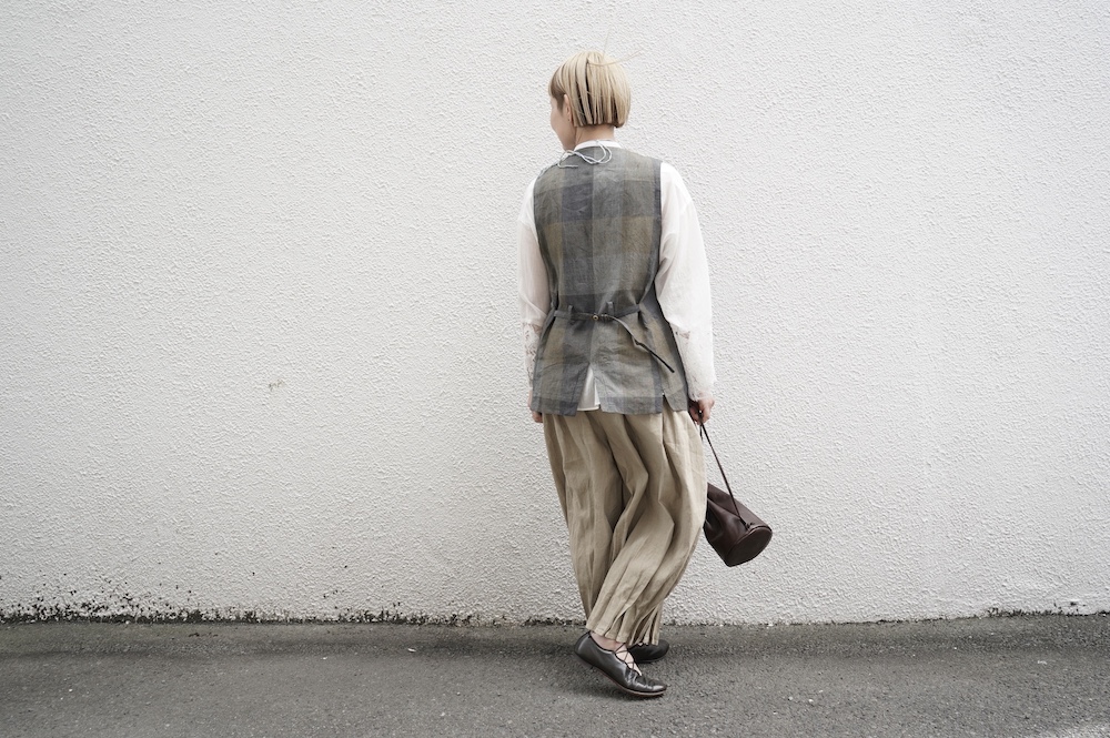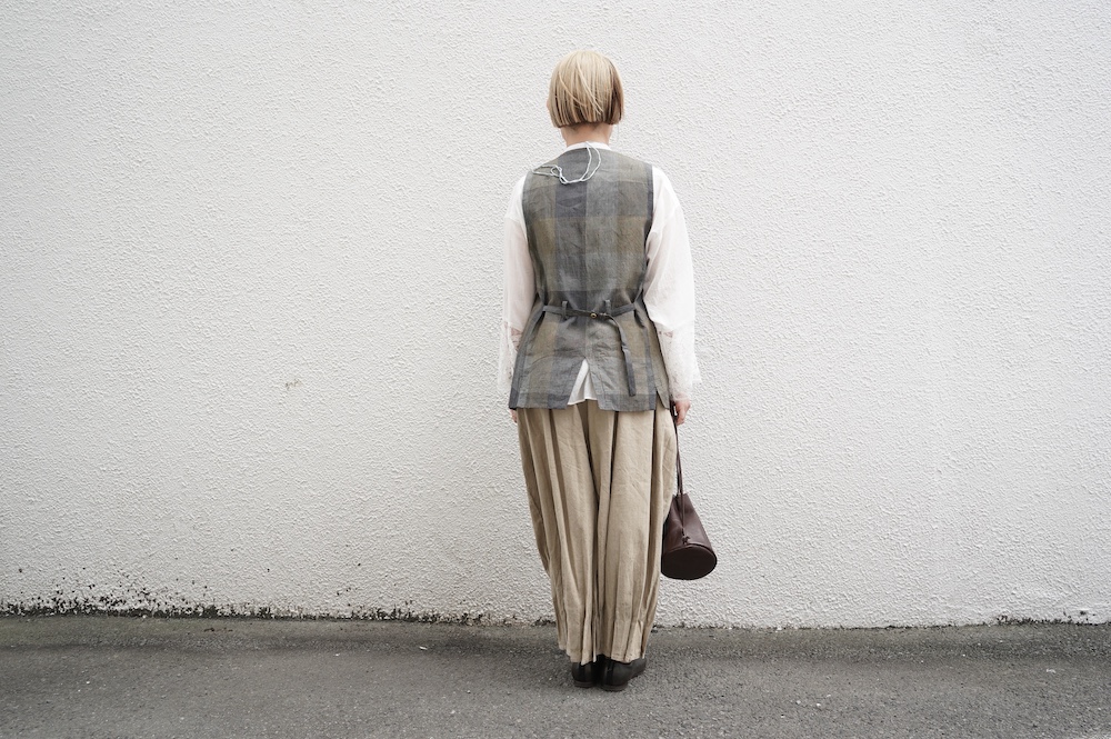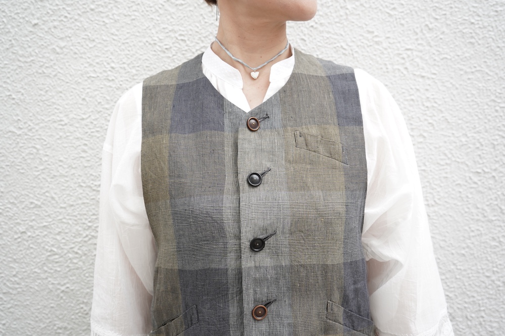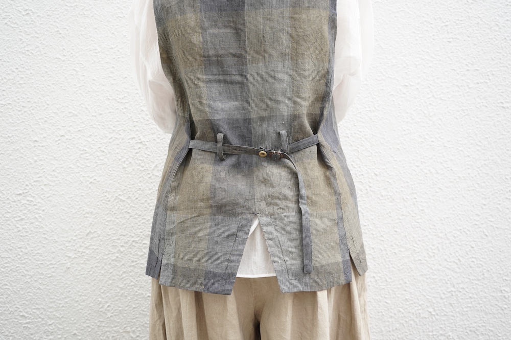 デザインは緩やかなAラインのシルエットで、着丈が少し長めのベスト。後ろ身頃にアジャスターベルトがついているので、シルエットを変えていただくことができます。裏地付きで、ポケットも両サイドと左胸に箱ポケットが付いていて、ジャケットのような丁寧な作りです。共布で作られたコンビネゾンと合わせてセットアップにしても素敵です。ブラウスやワンピース、またシンプルなTシャツにさらっとプラスするだけでもサマになる存在感のあるベストです。