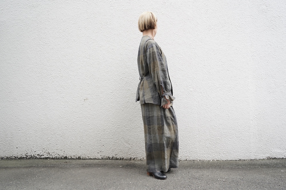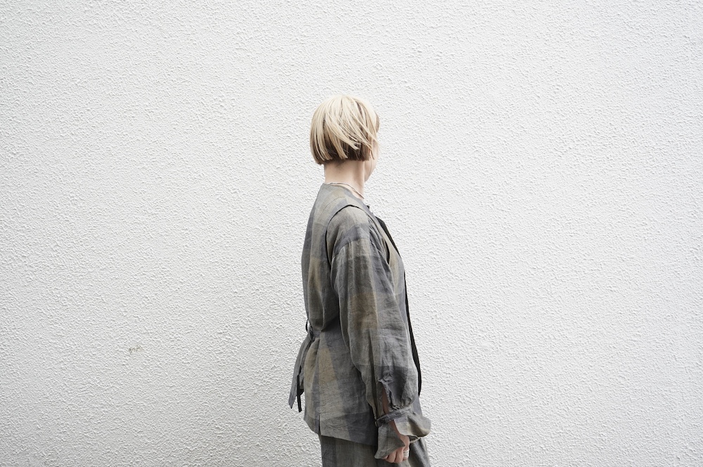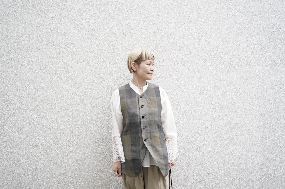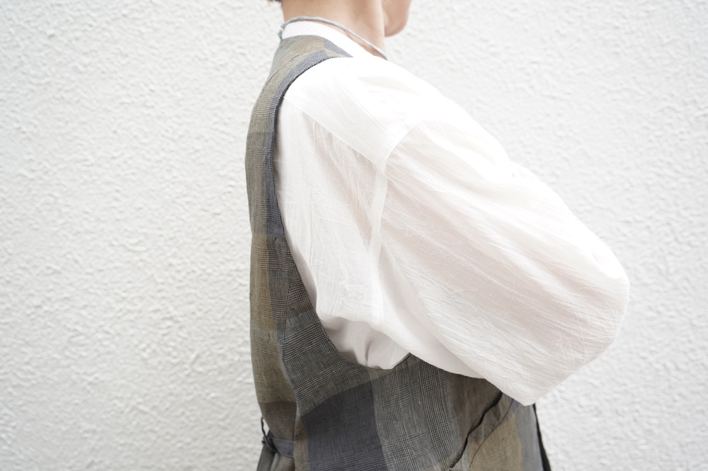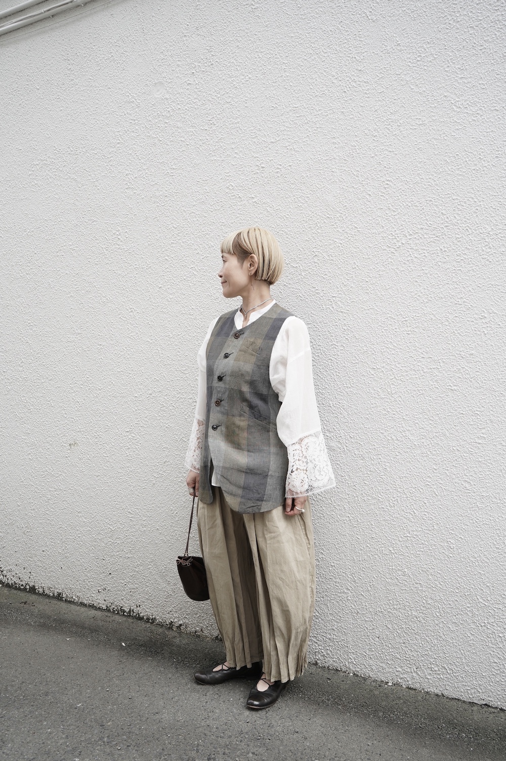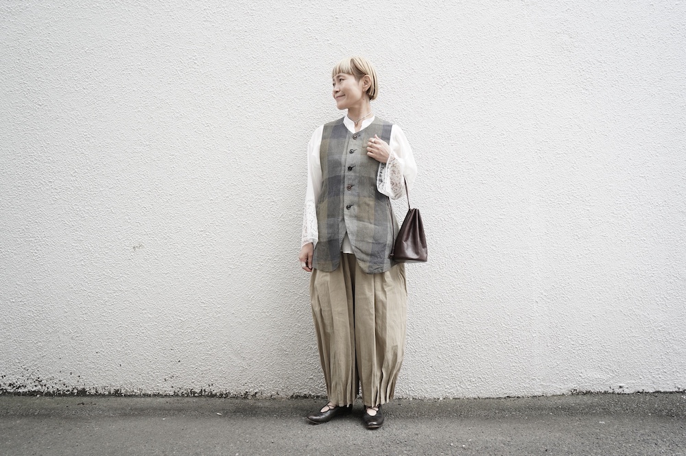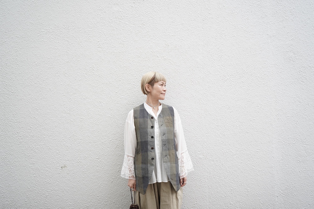 デザインは緩やかなAラインのシルエットで、着丈が少し長めのベスト。後ろ身頃にアジャスターベルトがついているので、シルエットを変えていただくことができます。裏地付きで、ポケットも両サイドと左胸に箱ポケットが付いていて、ジャケットのような丁寧な作りです。共布で作られたコンビネゾンと合わせてセットアップにしても素敵です。ブラウスやワンピース、またシンプルなTシャツにさらっとプラスするだけでもサマになる存在感のあるベストです。
