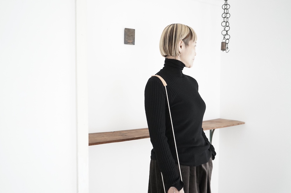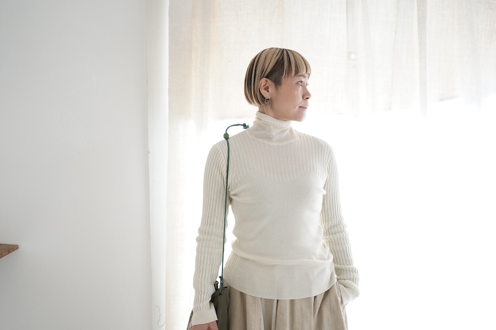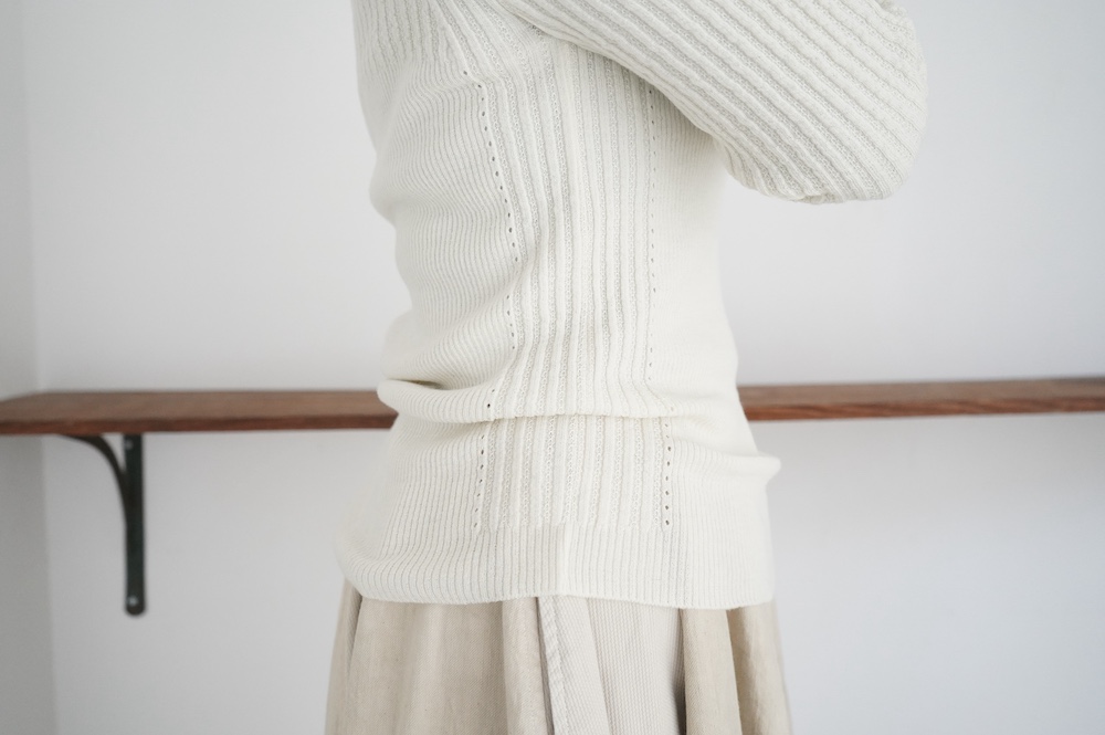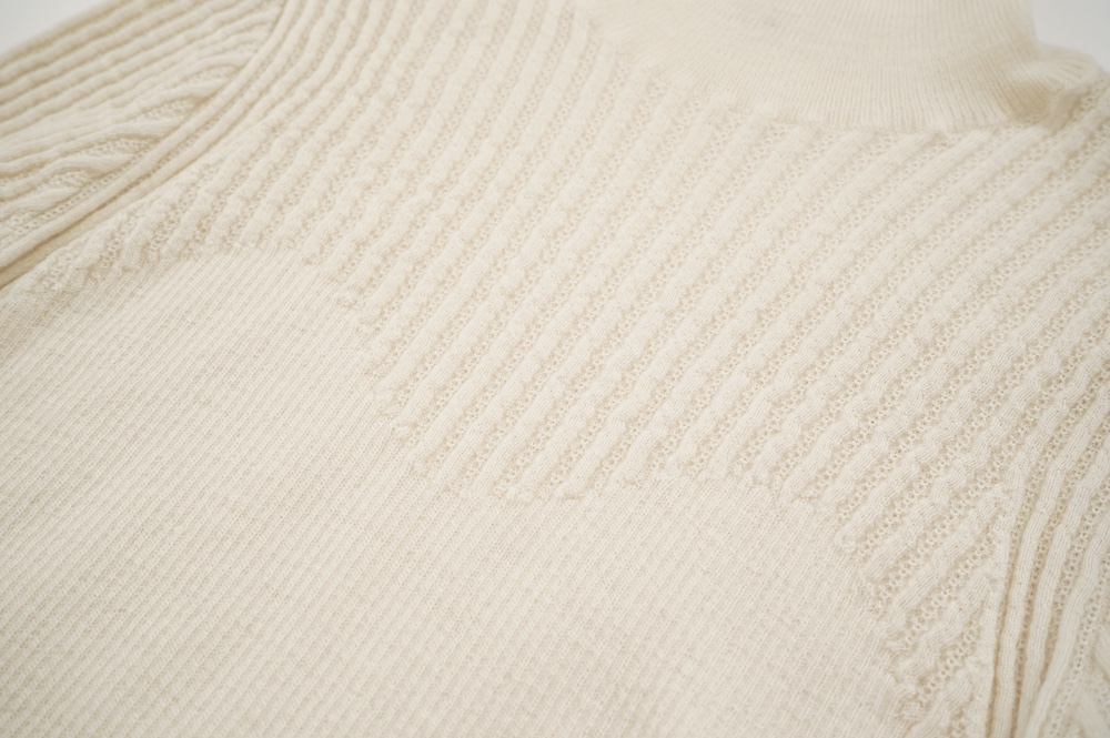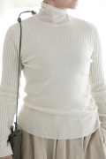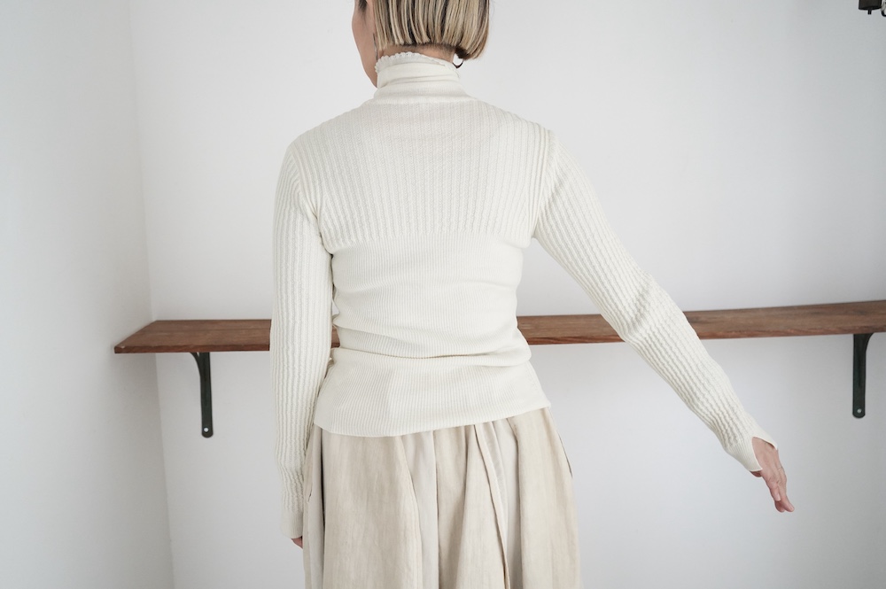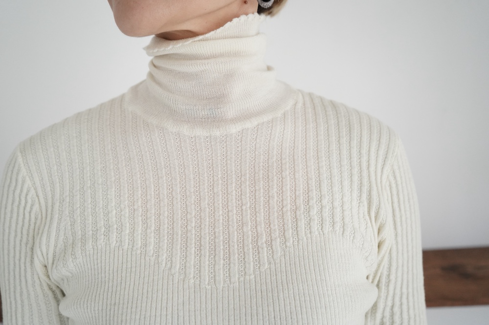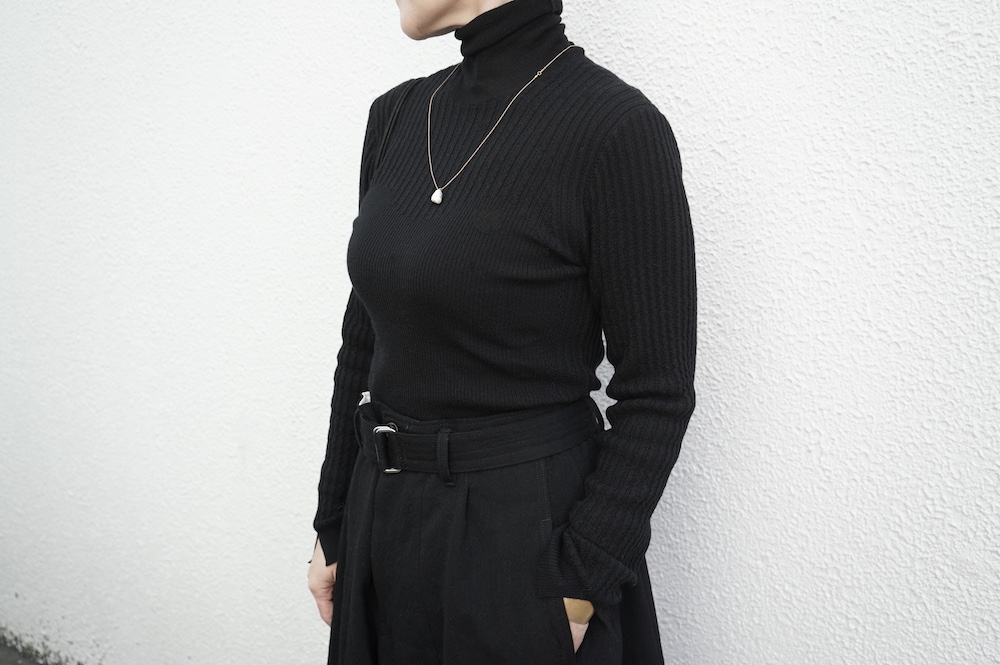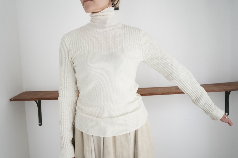 ハイゲージの上質な薄手のセーターは、着用時のフィット感が驚くほどの優しさです。体へのフィッティングは高いものの、張り付く感じや線を強調することなくよいバランスで着用していただけるニットだと感じます。首元にフィットするタートルネックで袖、着丈はやや長めです。上から着る物に合わせてタックインもしていただけます。デザイン的にはバストラインの編み地の切り替えが特徴的で、女性らしいラインが素敵です。ネックをくしゅくしゅさせても、また折り返しても着ていただけます。またサイドウィーブのような脇の切り替えも洋服好きの気持ちを揺さぶります。袖口は軽めのリブ編みで小さなスリットも効いています。ジャンパースカートやワンピースのインナーとして、またこの季節のブルゾンやジャケット、薄手の羽織のインナーとしても素敵です。カットソーとは一線を画した上質感をお楽しみください。