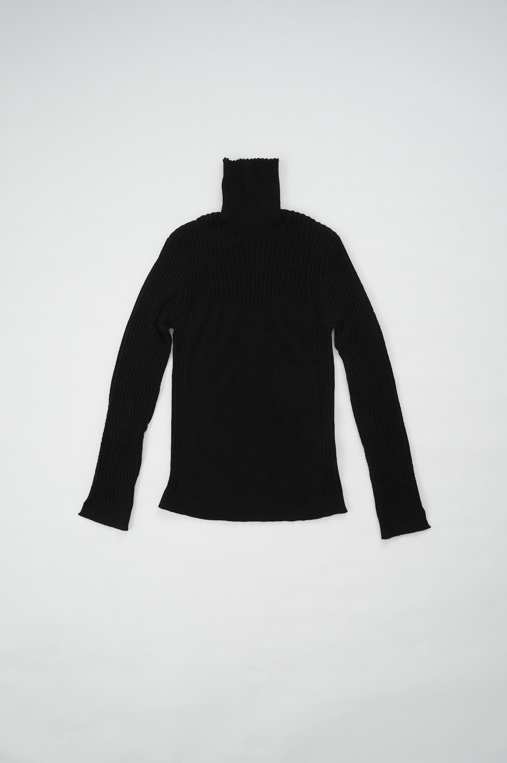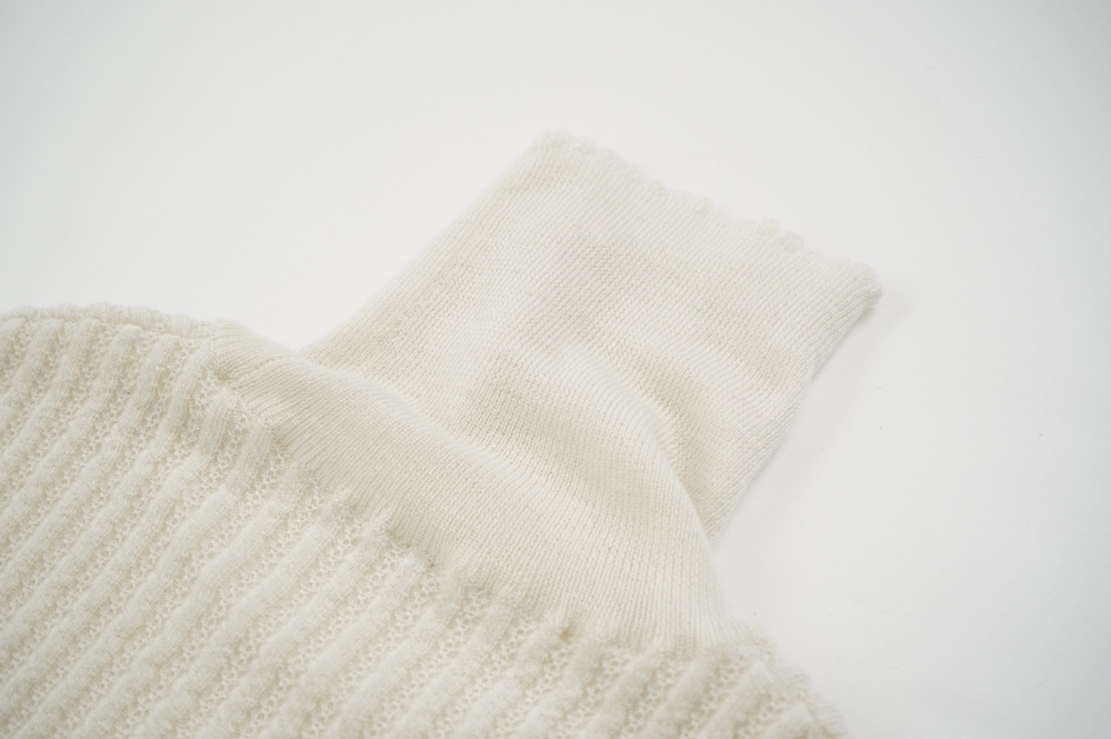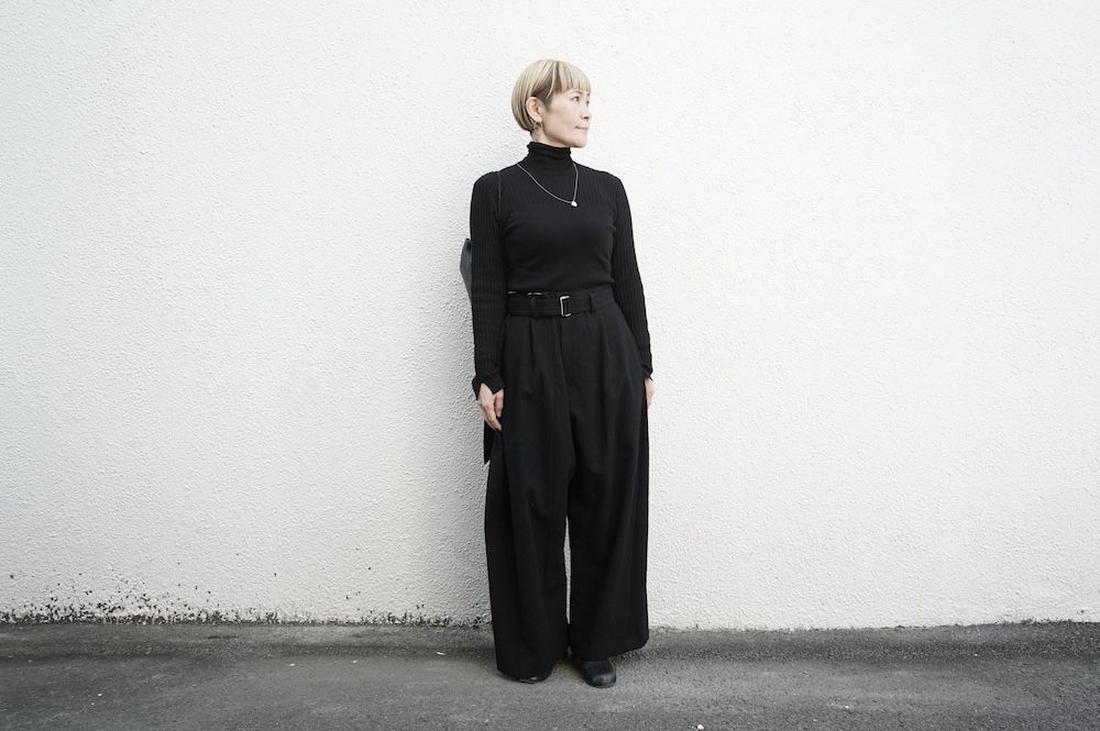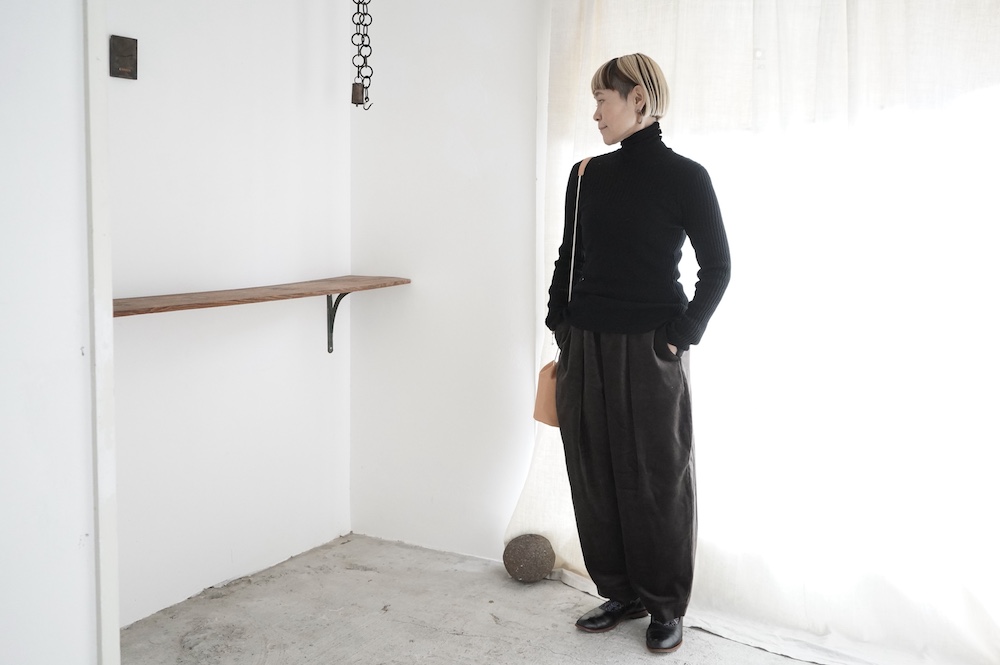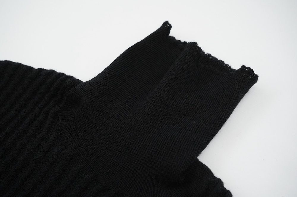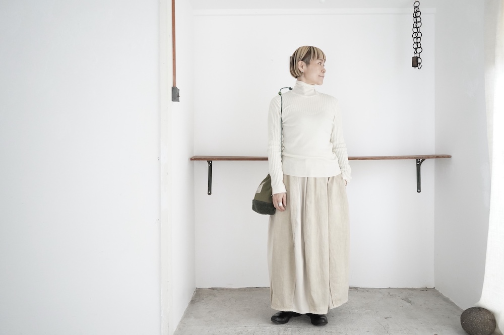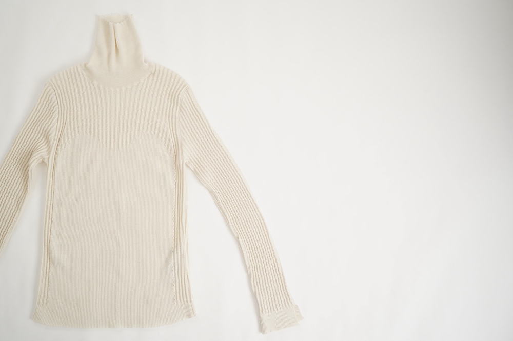 ハイゲージの上質な薄手のセーターは、着用時のフィット感が驚くほどの優しさです。体へのフィッティングは高いものの、張り付く感じや線を強調することなくよいバランスで着用していただけるニットだと感じます。首元にフィットするタートルネックで袖、着丈はやや長めです。上から着る物に合わせてタックインもしていただけます。デザイン的にはバストラインの編み地の切り替えが特徴的で、女性らしいラインが素敵です。ネックをくしゅくしゅさせても、また折り返しても着ていただけます。またサイドウィーブのような脇の切り替えも洋服好きの気持ちを揺さぶります。袖口は軽めのリブ編みで小さなスリットも効いています。ジャンパースカートやワンピースのインナーとして、またこの季節のブルゾンやジャケット、薄手の羽織のインナーとしても素敵です。カットソーとは一線を画した上質感をお楽しみください。