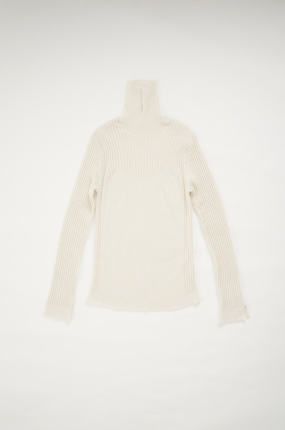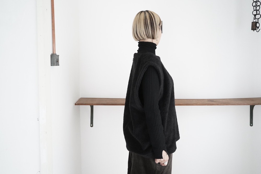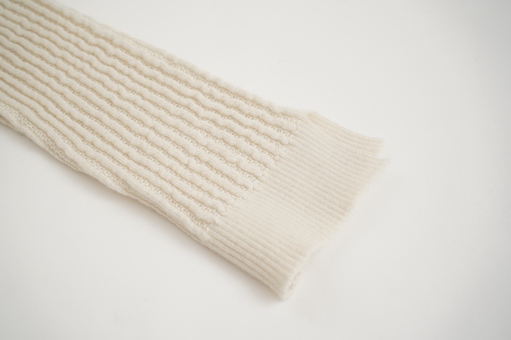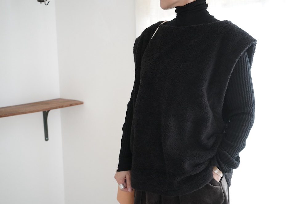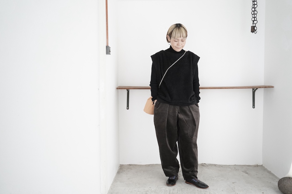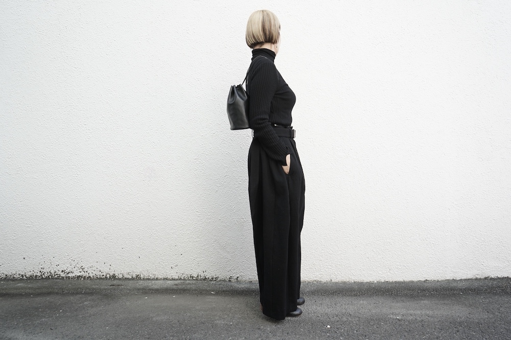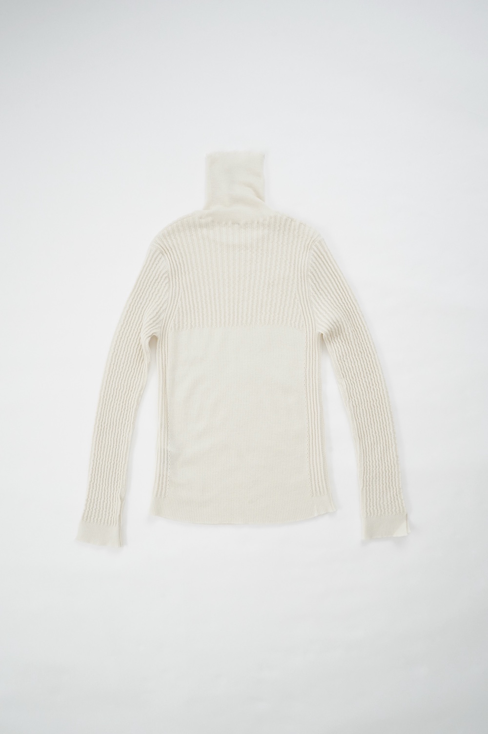 ハイゲージの上質な薄手のセーターは、着用時のフィット感が驚くほどの優しさです。体へのフィッティングは高いものの、張り付く感じや線を強調することなくよいバランスで着用していただけるニットだと感じます。首元にフィットするタートルネックで袖、着丈はやや長めです。上から着る物に合わせてタックインもしていただけます。デザイン的にはバストラインの編み地の切り替えが特徴的で、女性らしいラインが素敵です。ネックをくしゅくしゅさせても、また折り返しても着ていただけます。またサイドウィーブのような脇の切り替えも洋服好きの気持ちを揺さぶります。袖口は軽めのリブ編みで小さなスリットも効いています。ジャンパースカートやワンピースのインナーとして、またこの季節のブルゾンやジャケット、薄手の羽織のインナーとしても素敵です。カットソーとは一線を画した上質感をお楽しみください。