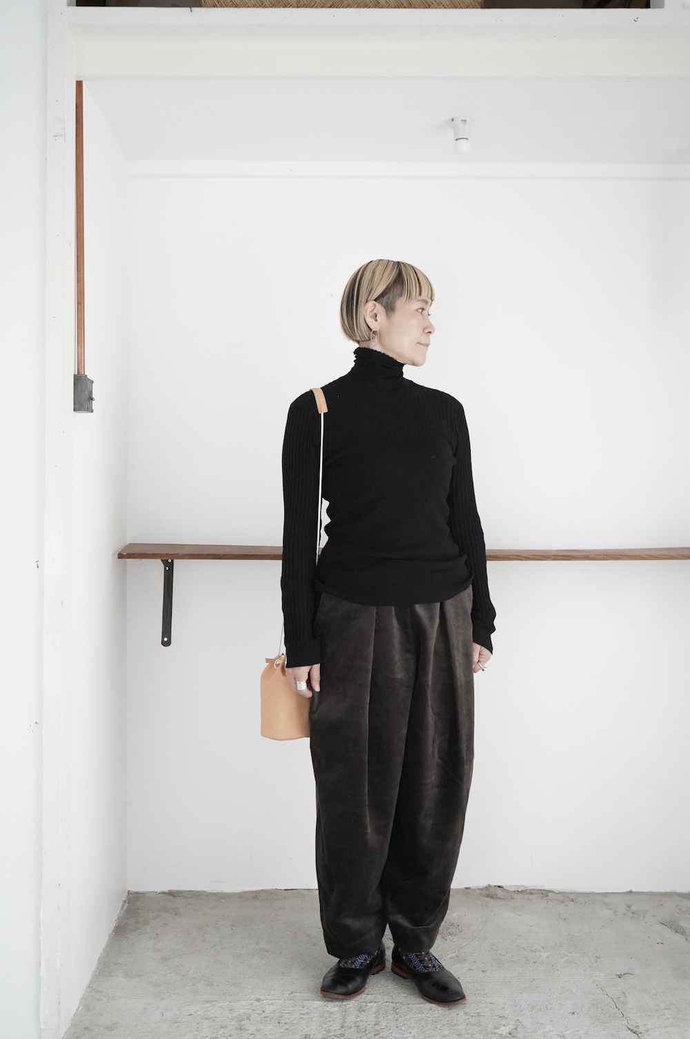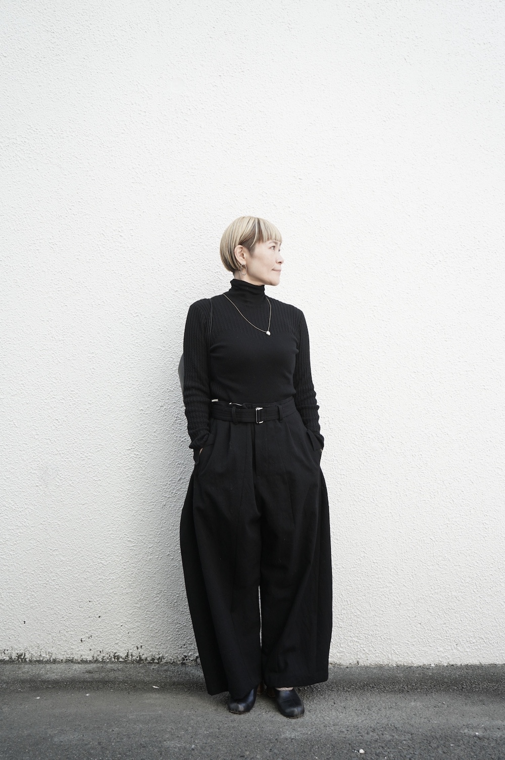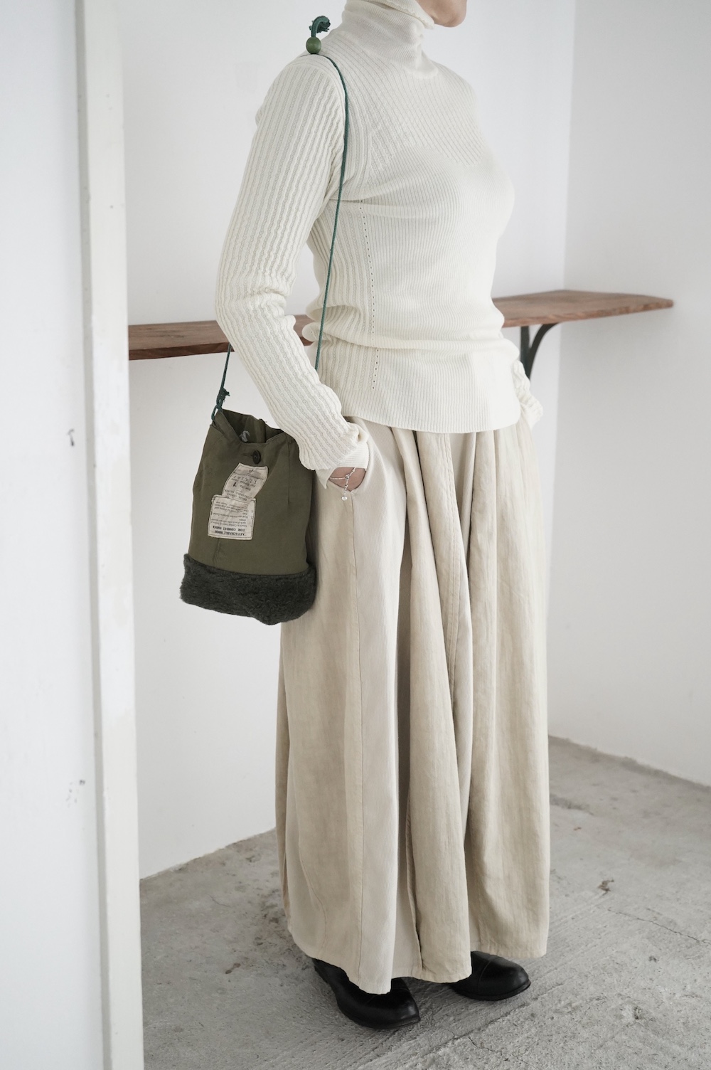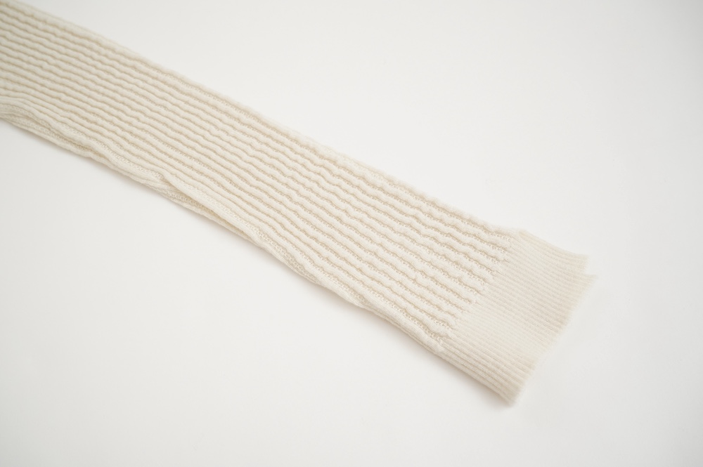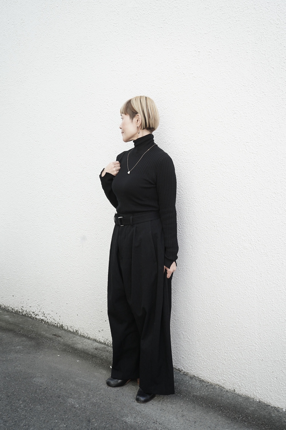 ハイゲージの上質な薄手のセーターは、着用時のフィット感が驚くほどの優しさです。体へのフィッティングは高いものの、張り付く感じや線を強調することなくよいバランスで着用していただけるニットだと感じます。首元にフィットするタートルネックで袖、着丈はやや長めです。上から着る物に合わせてタックインもしていただけます。デザイン的にはバストラインの編み地の切り替えが特徴的で、女性らしいラインが素敵です。ネックをくしゅくしゅさせても、また折り返しても着ていただけます。またサイドウィーブのような脇の切り替えも洋服好きの気持ちを揺さぶります。袖口は軽めのリブ編みで小さなスリットも効いています。ジャンパースカートやワンピースのインナーとして、またこの季節のブルゾンやジャケット、薄手の羽織のインナーとしても素敵です。カットソーとは一線を画した上質感をお楽しみください。