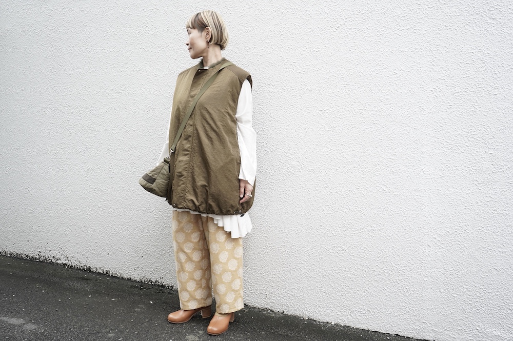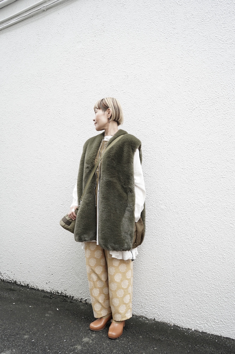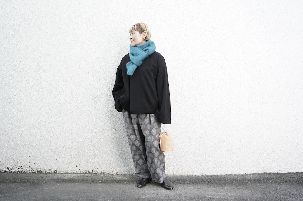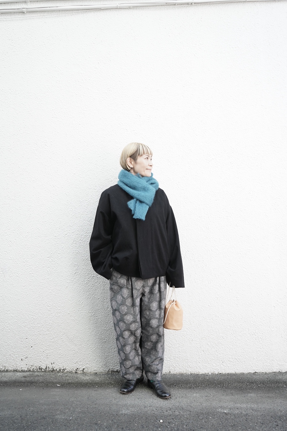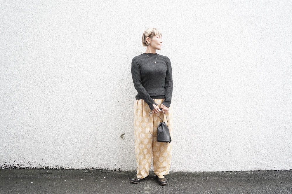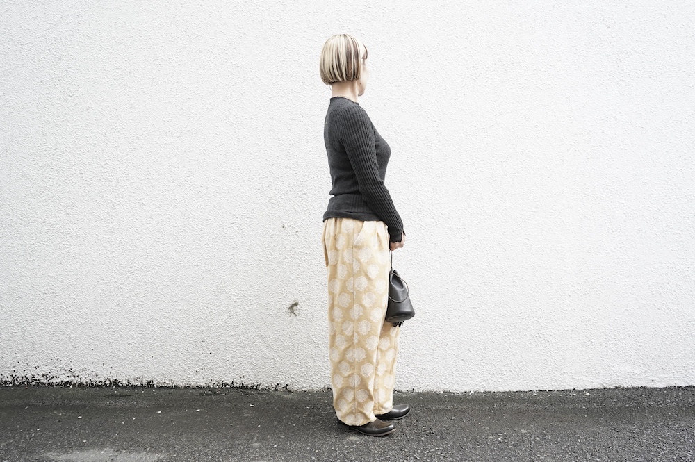デザインは裾にかけてやや細くテーパードがかかったパンツ。フロントには3タックが施されており、後ろはウエストが半周ゴムになっています。ウエストの内側にアジャスターがついており、ゴム部分にボタンホールがついているのでベルト無しで小さくすることが可能です。裾まで裏地がついています。上品なジャガード生地がスタイリングの主役になり、ロング丈のアウターからチラッと覗かせるだけでも存在感も放つ、シルエットの綺麗なパンツです。