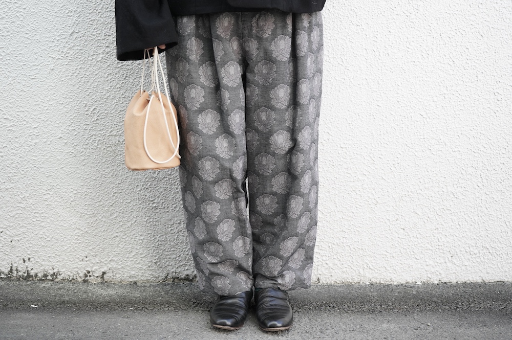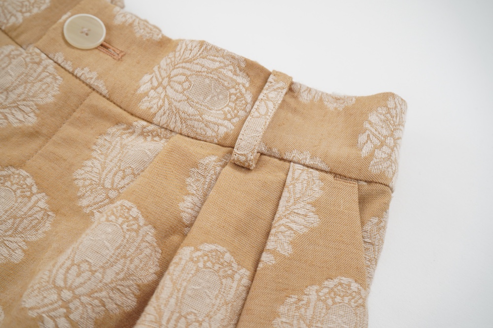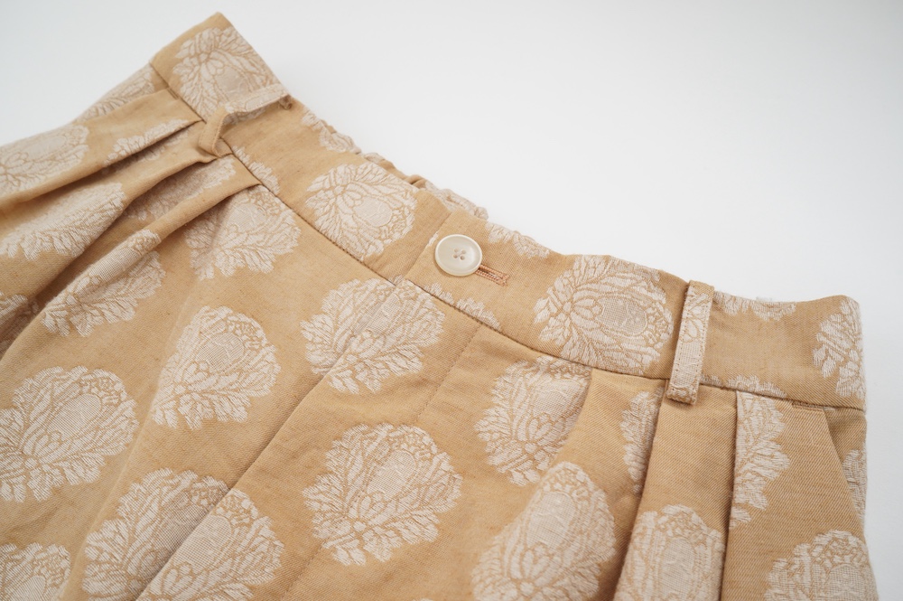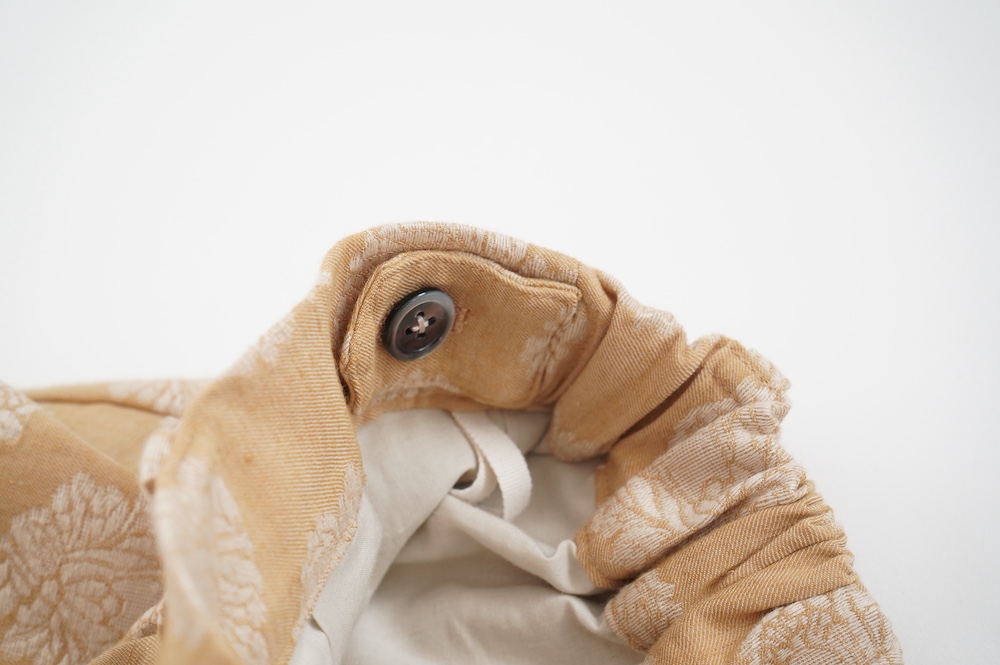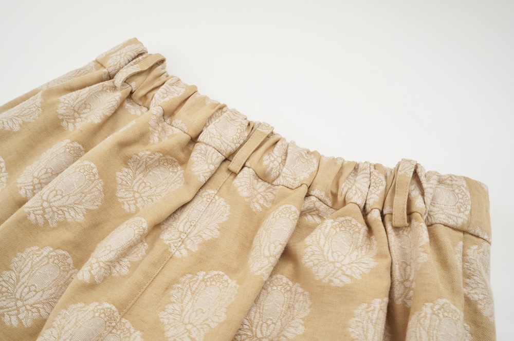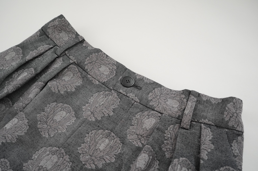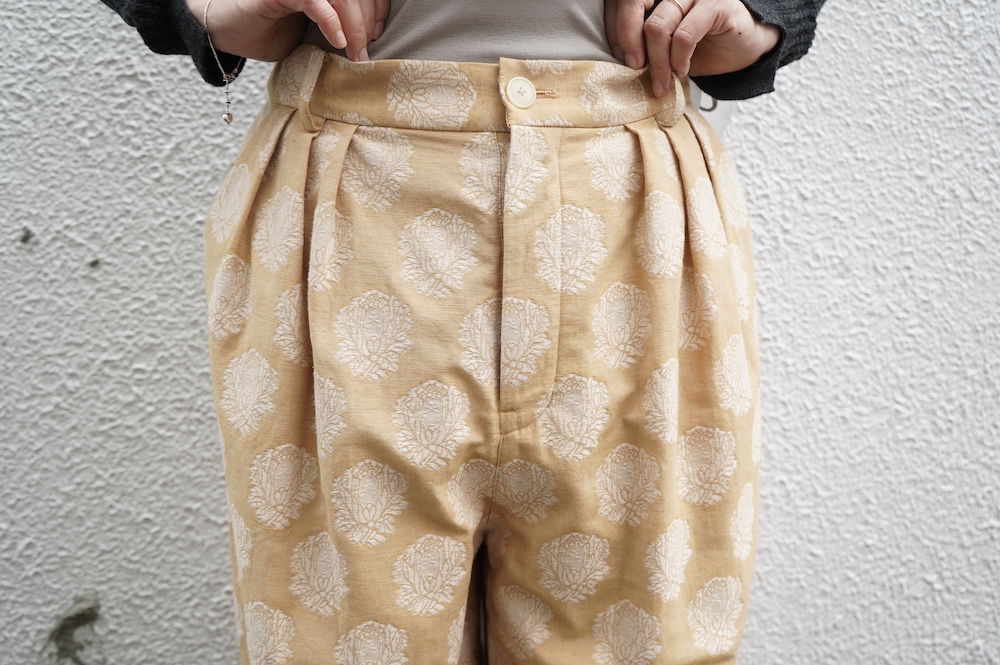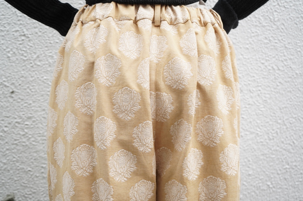 "GASA*"のパンツ。ラミーが入った綿麻素材のカットジャガード生地を使用。和と洋の織り交ぜたオリエンタルなモチーフのオリジナルジャガード生地になります。ほんのりと光沢のある、上品な素材です。