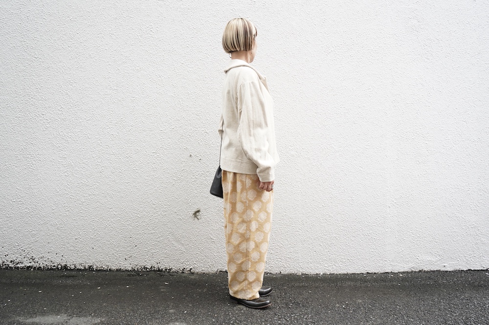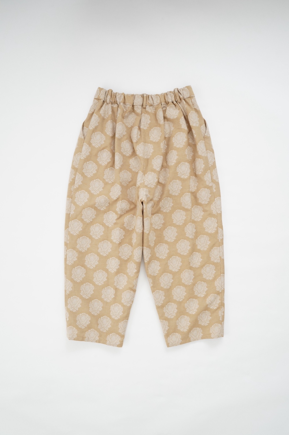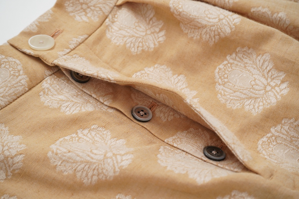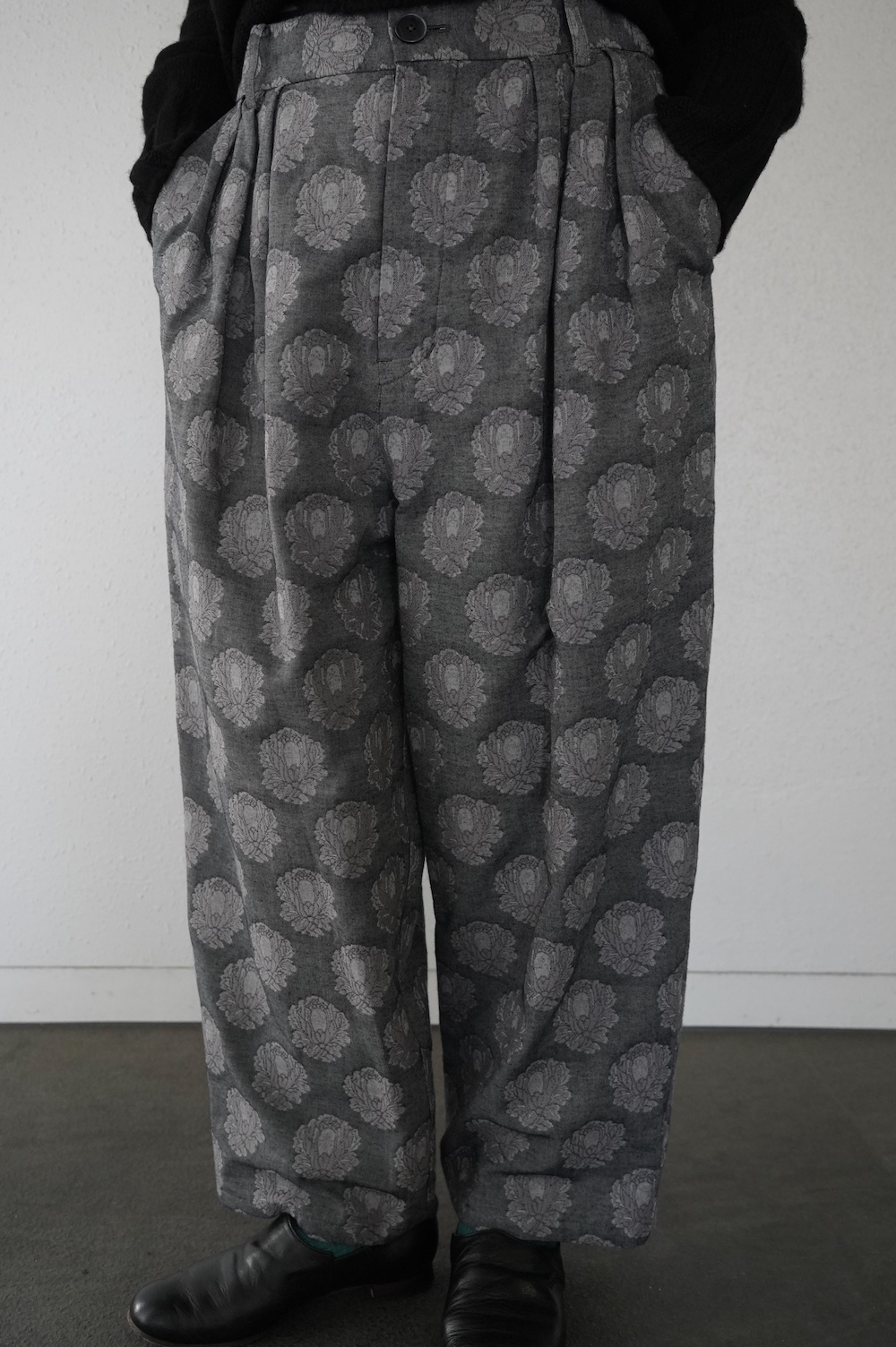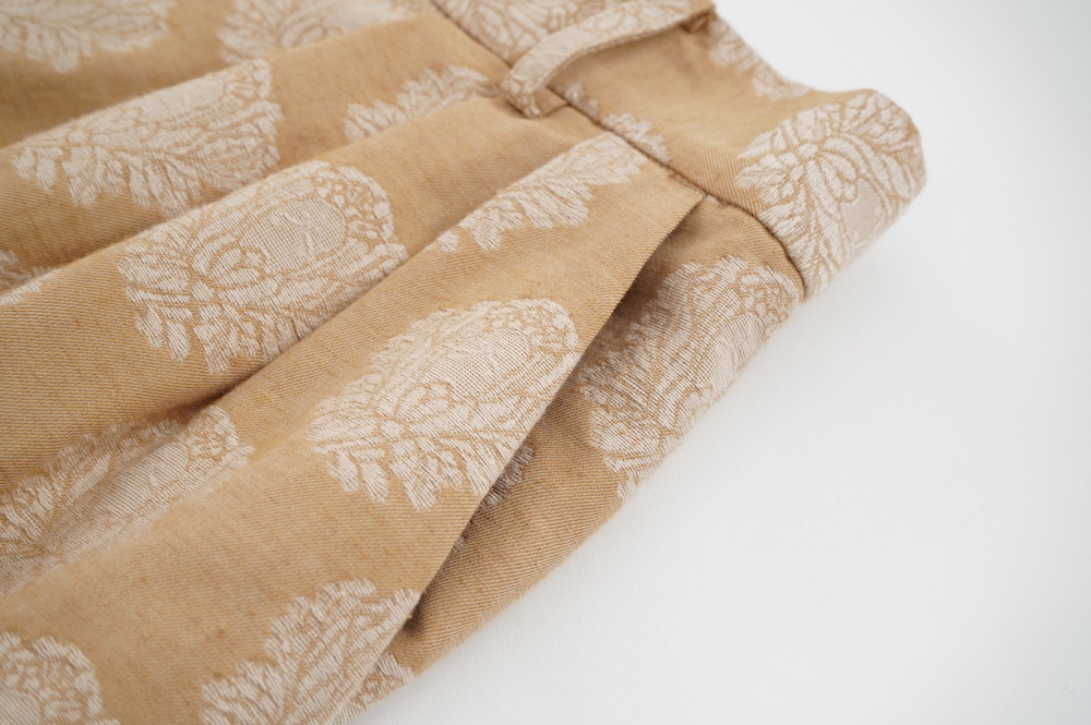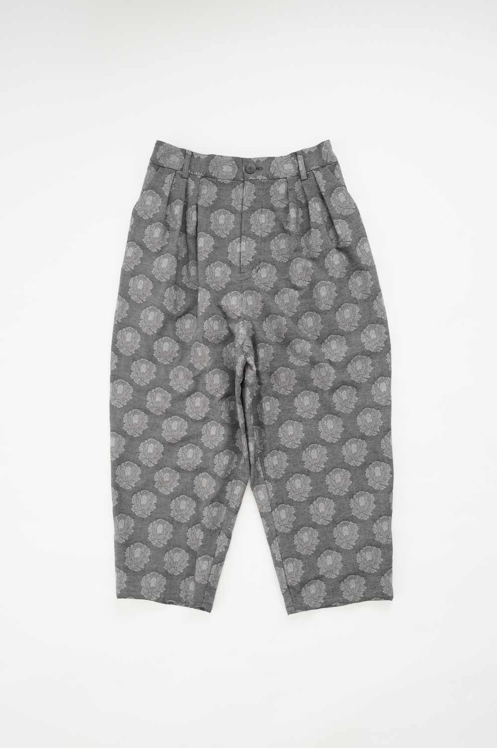 "GASA*"のパンツ。ラミーが入った綿麻素材のカットジャガード生地を使用。和と洋の織り交ぜたオリエンタルなモチーフのオリジナルジャガード生地になります。ほんのりと光沢のある、上品な素材です。