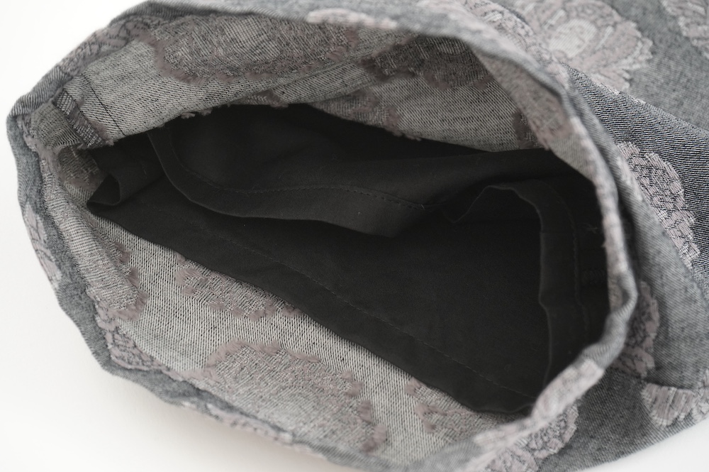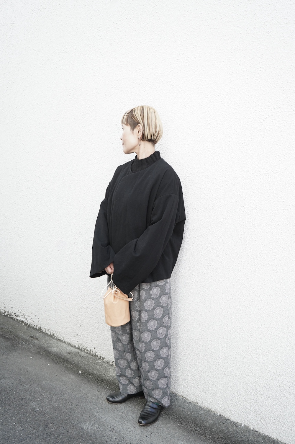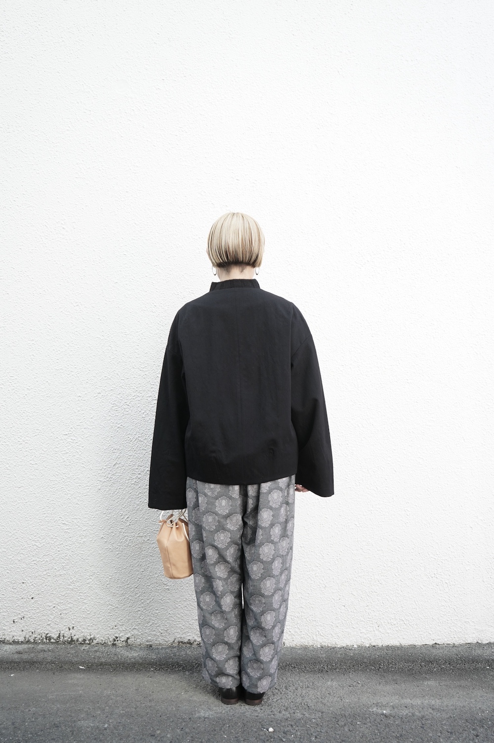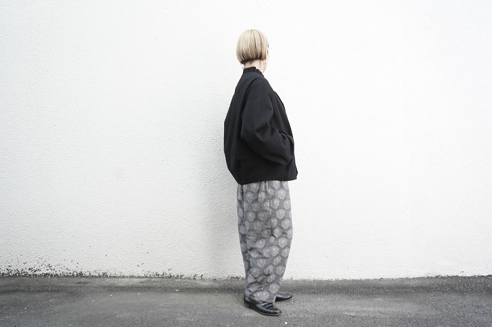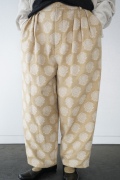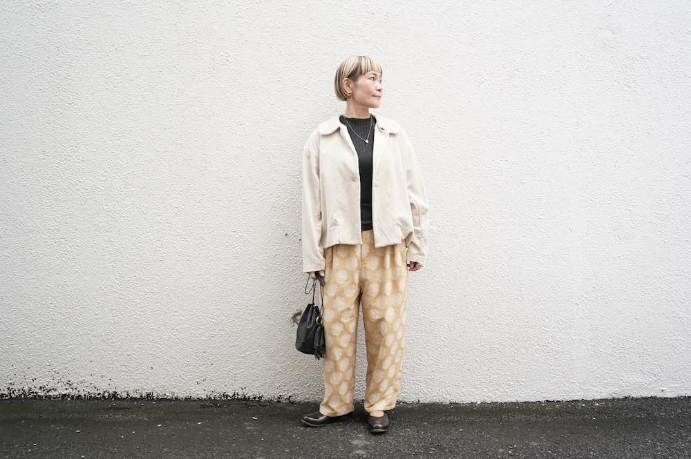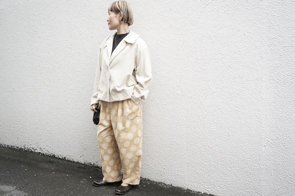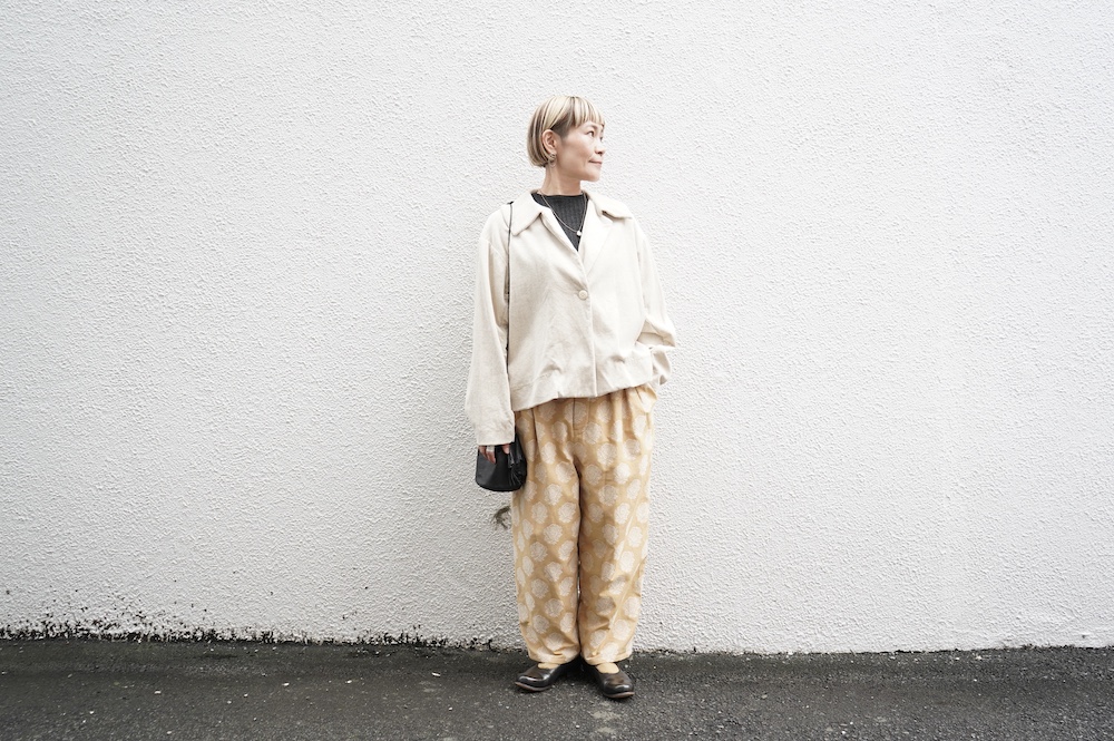 "GASA*"のパンツ。ラミーが入った綿麻素材のカットジャガード生地を使用。和と洋の織り交ぜたオリエンタルなモチーフのオリジナルジャガード生地になります。ほんのりと光沢のある、上品な素材です。