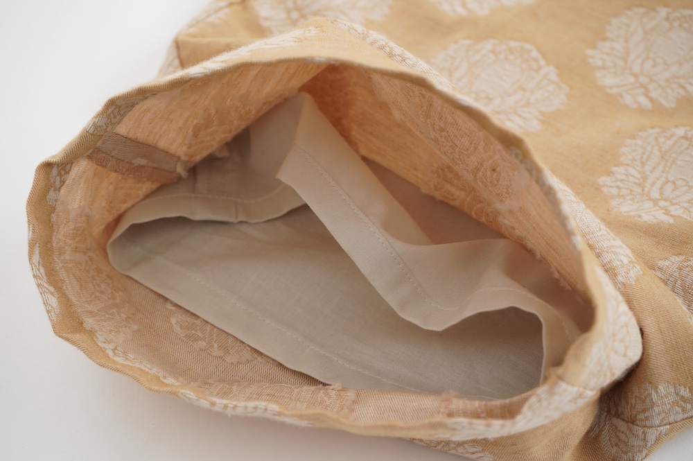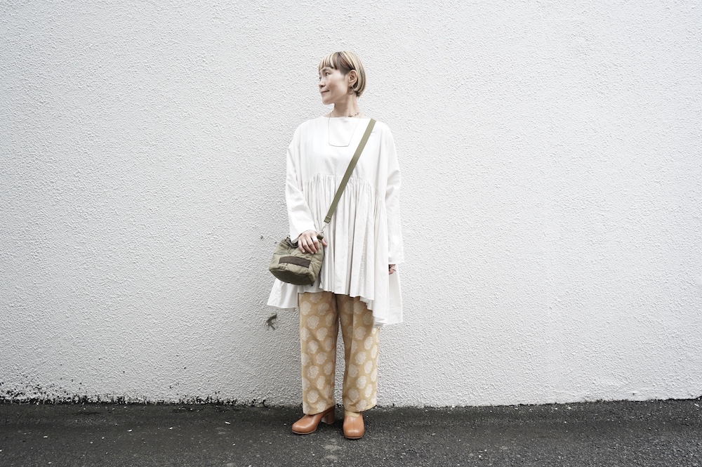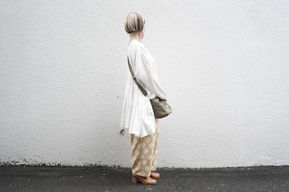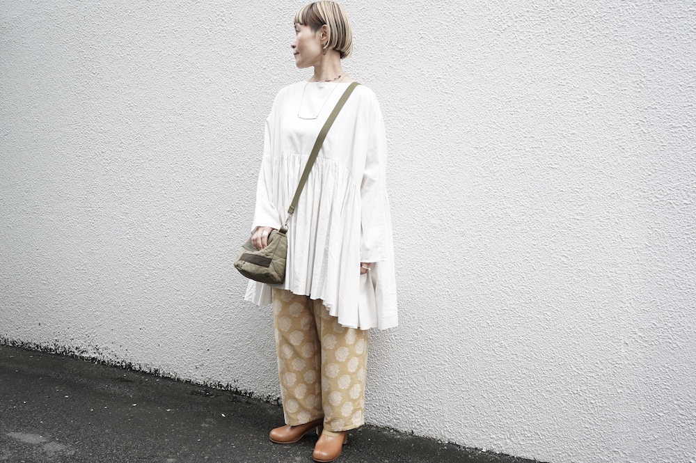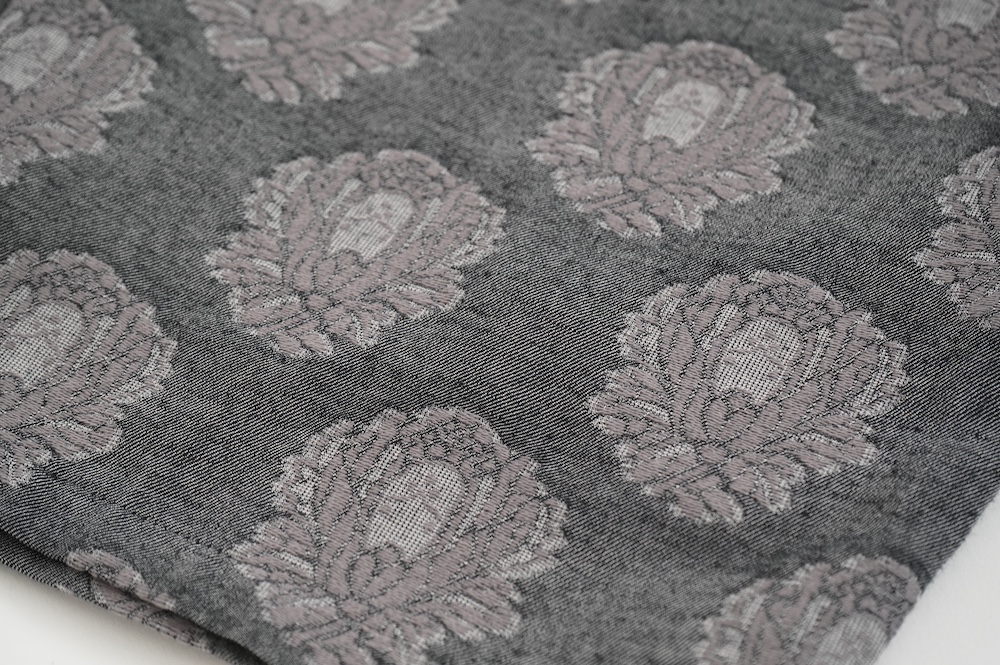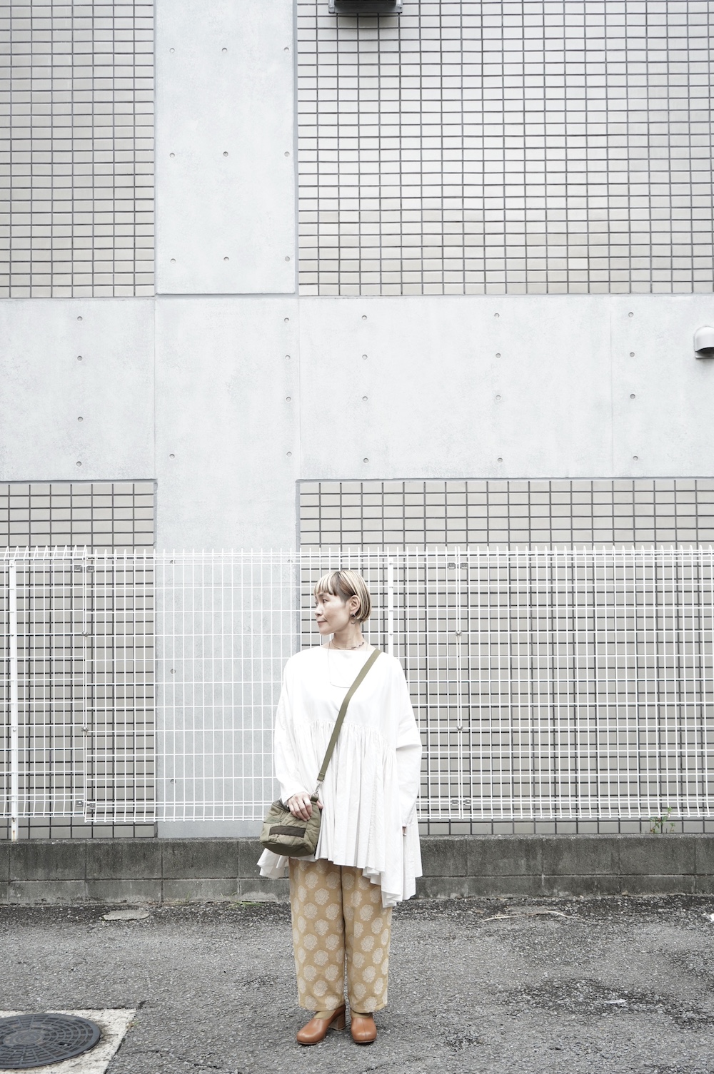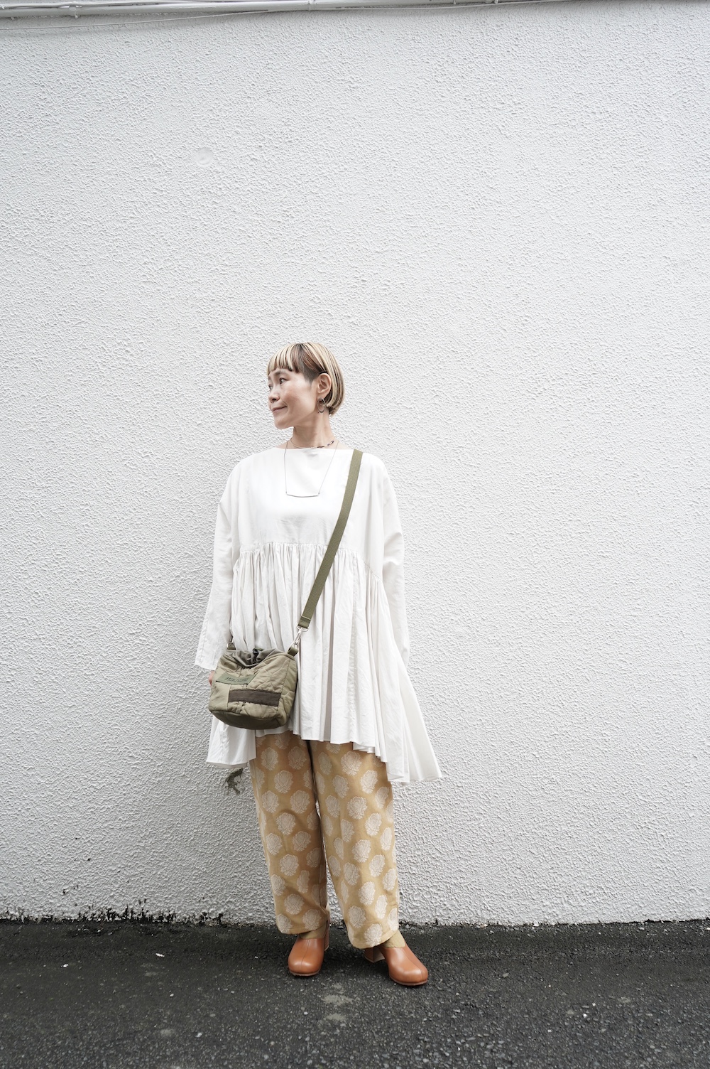"GASA*"のパンツ。ラミーが入った綿麻素材のカットジャガード生地を使用。和と洋の織り交ぜたオリエンタルなモチーフのオリジナルジャガード生地になります。ほんのりと光沢のある、上品な素材です。