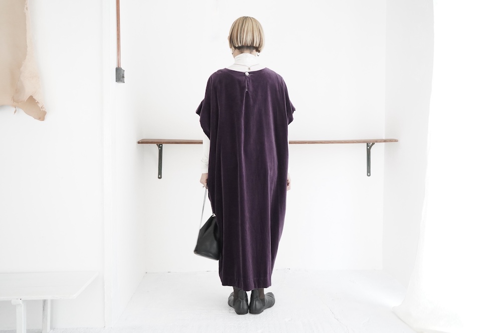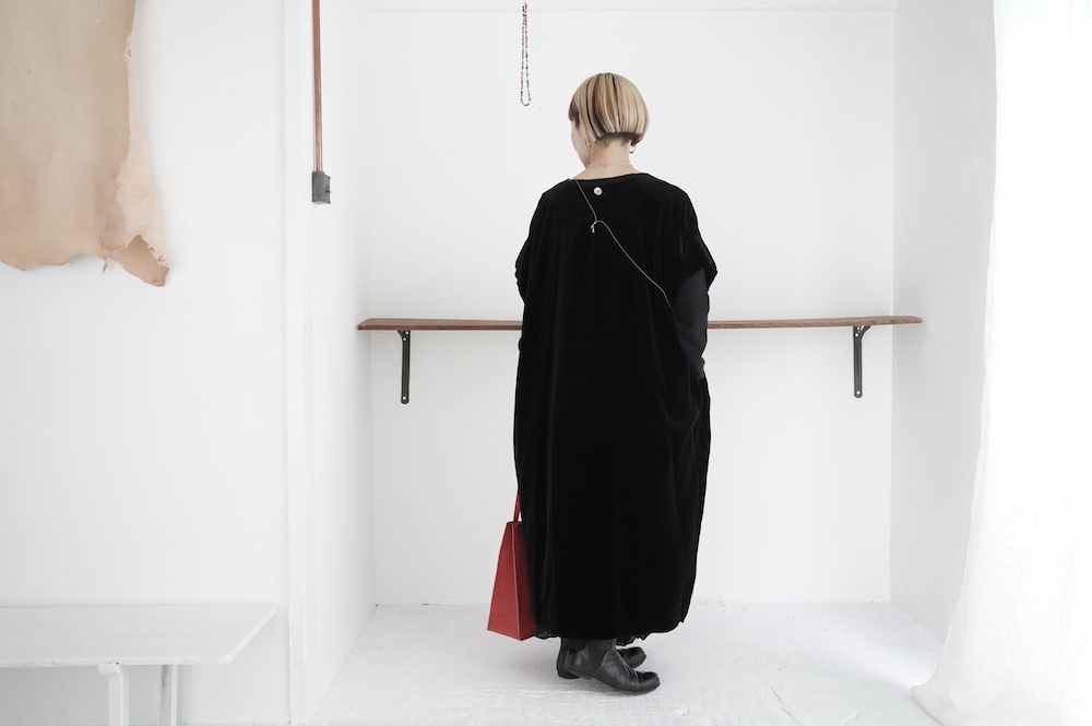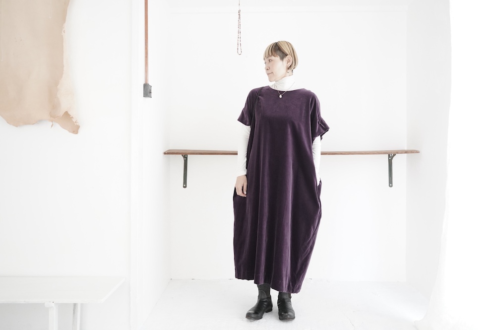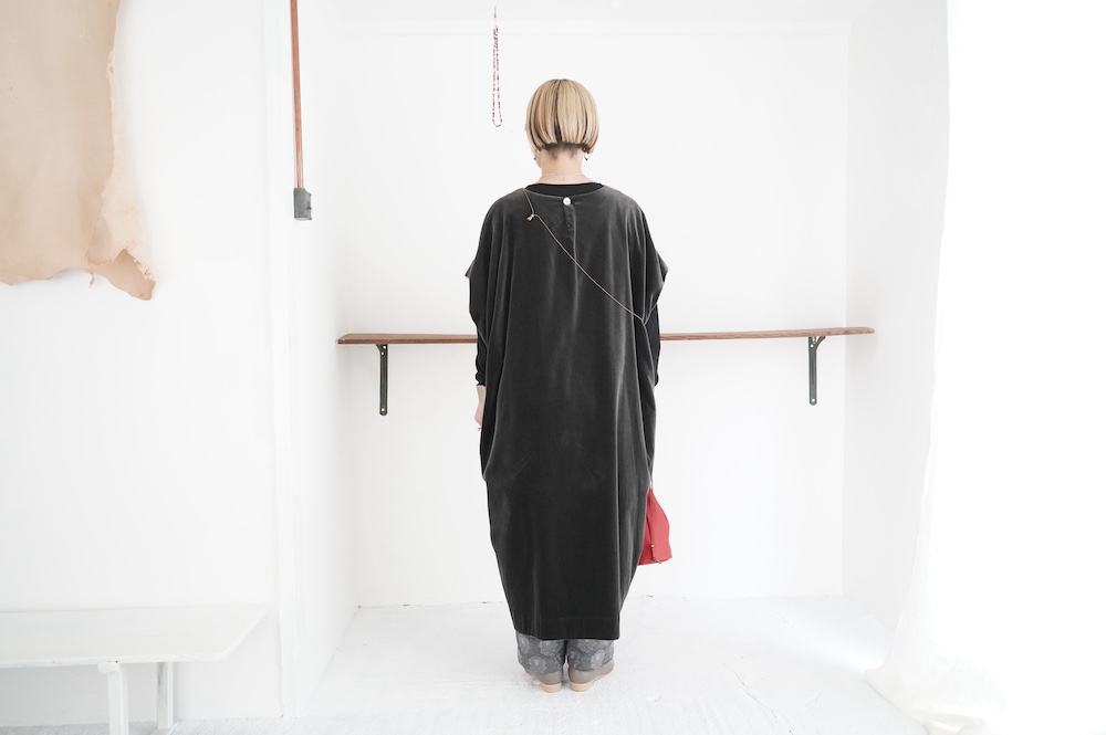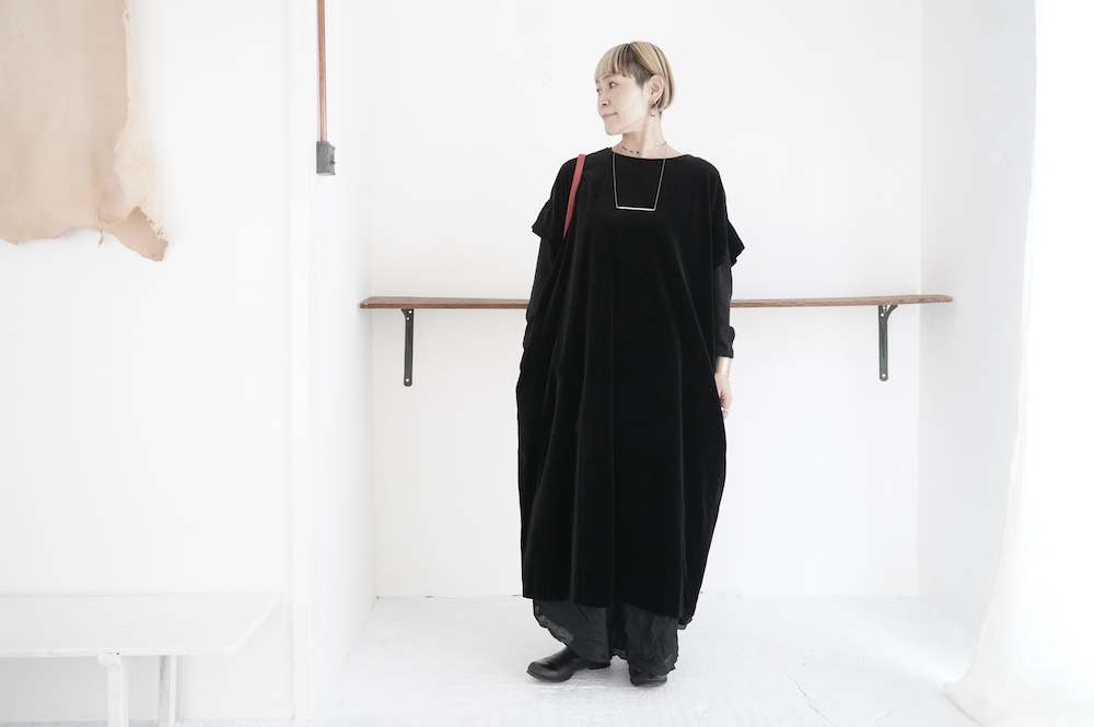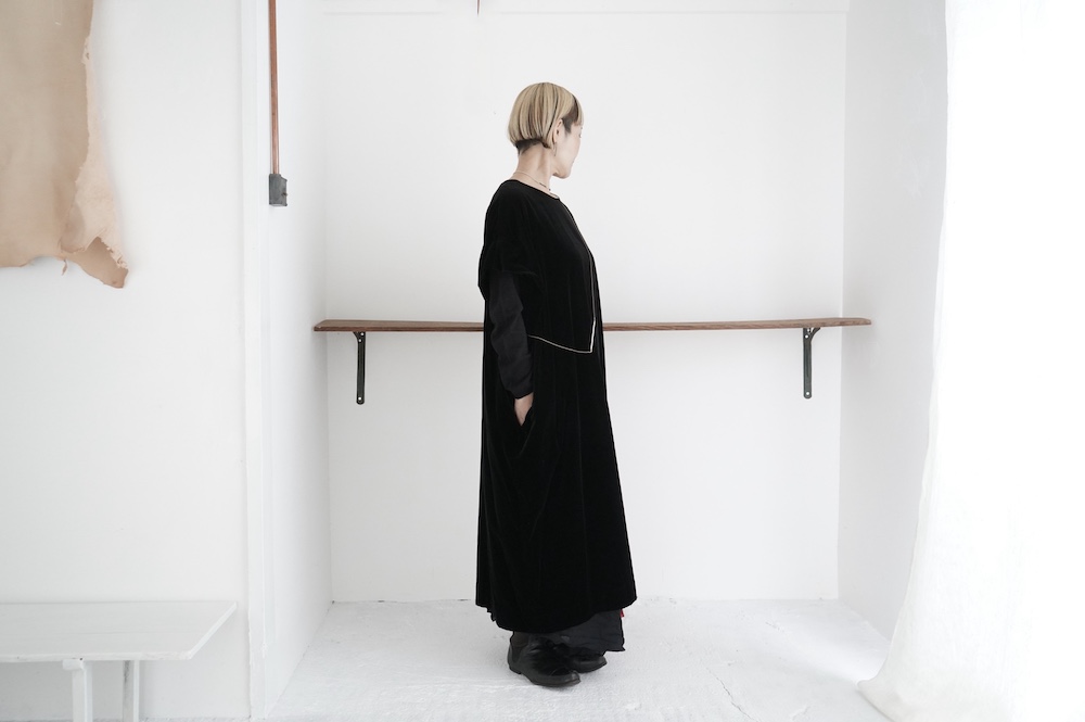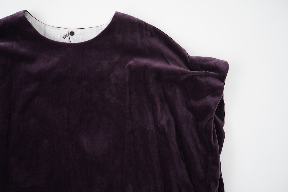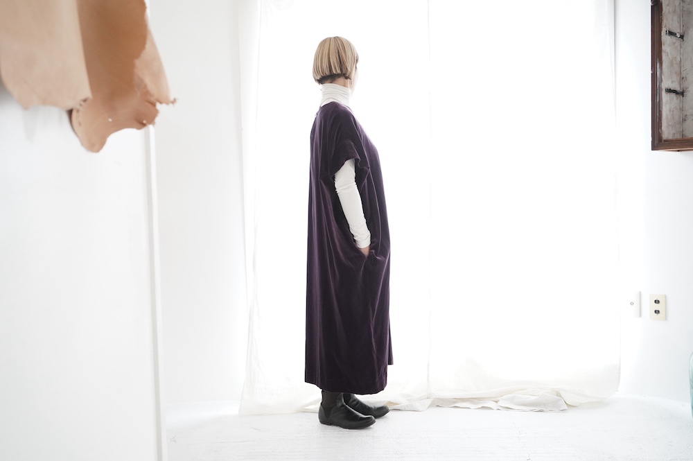 "GASA*"のドレス。ベルベットに洗い加工を施し、ワッシャー感のあるヴィンテージのような趣きを感じさせる素材です。上品な光沢感があり、カジュアルからフォーマルな装いにも着ていただける、華やかさがあります。レーヨン混で柔らかく、ゴワゴワ感のないベルベット生地です。