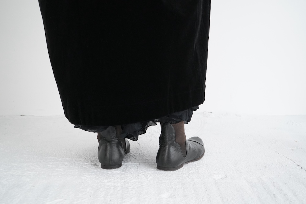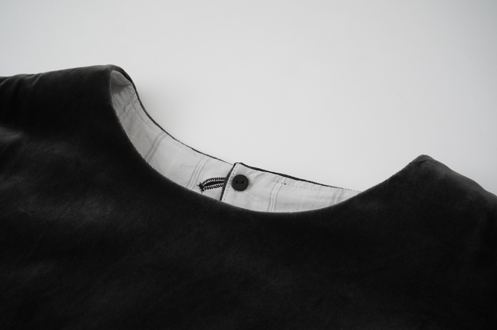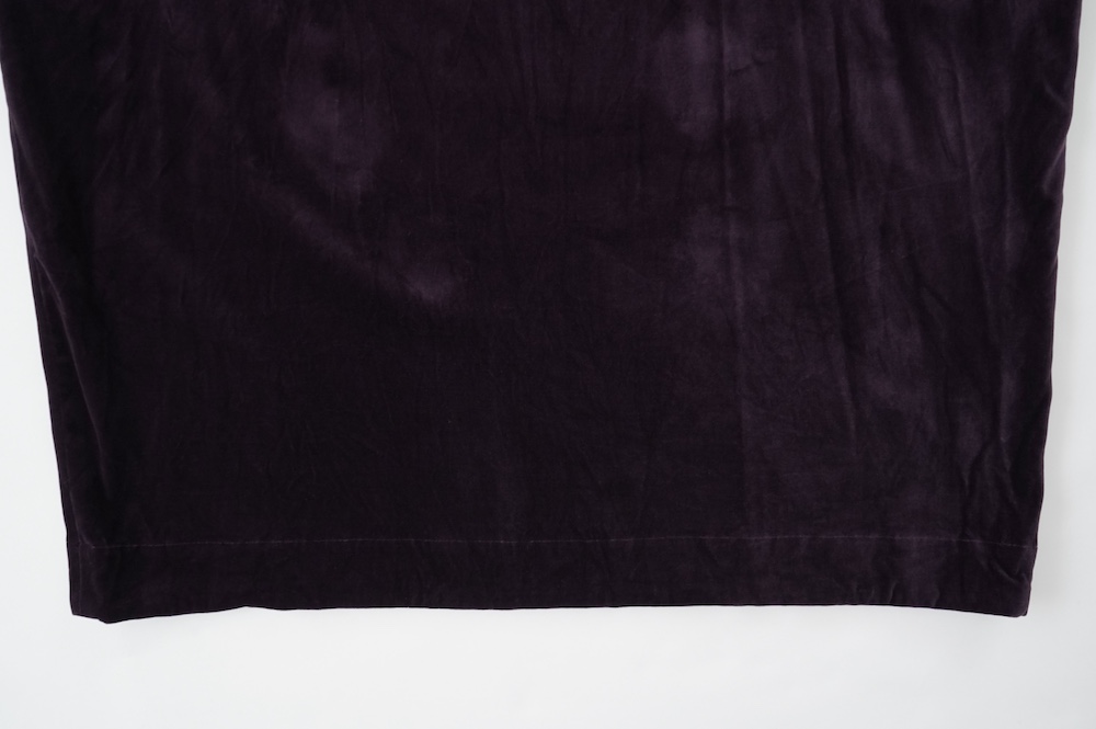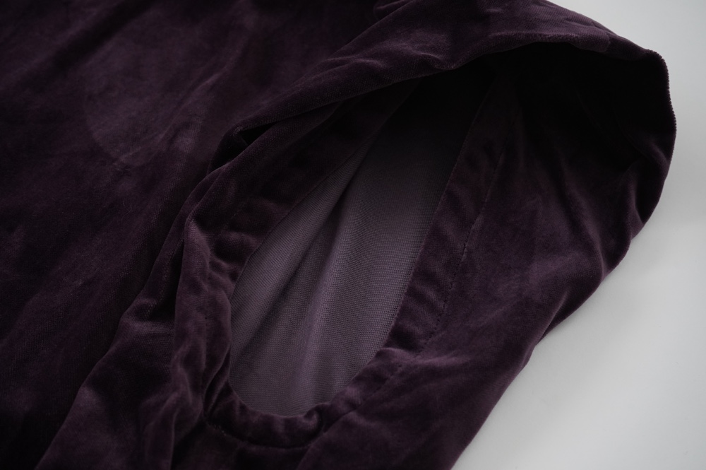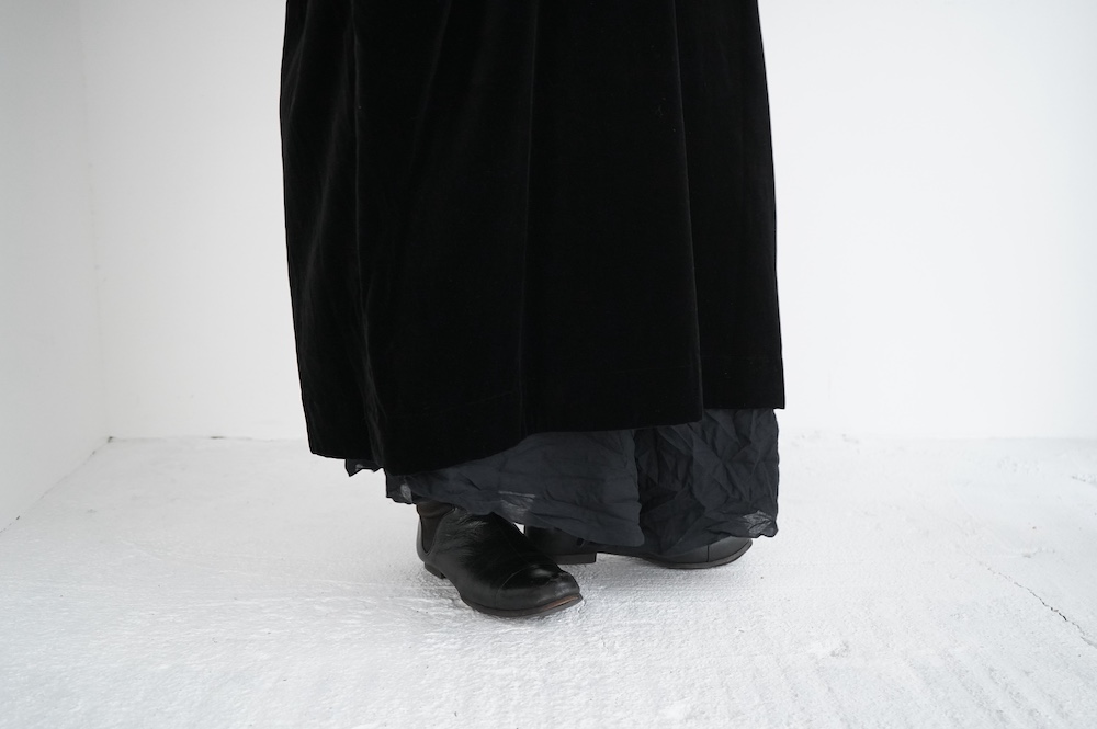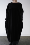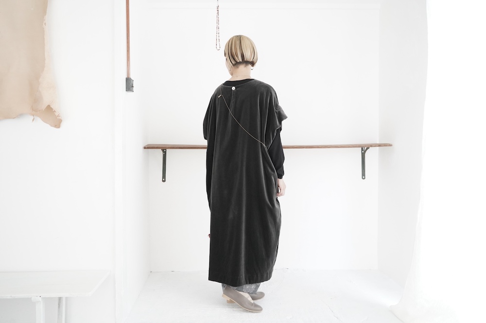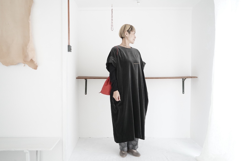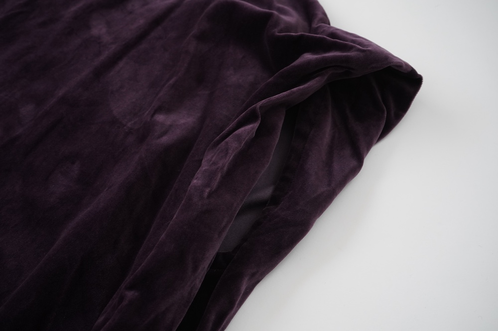 "GASA*"のドレス。ベルベットに洗い加工を施し、ワッシャー感のあるヴィンテージのような趣きを感じさせる素材です。上品な光沢感があり、カジュアルからフォーマルな装いにも着ていただける、華やかさがあります。レーヨン混で柔らかく、ゴワゴワ感のないベルベット生地です。
