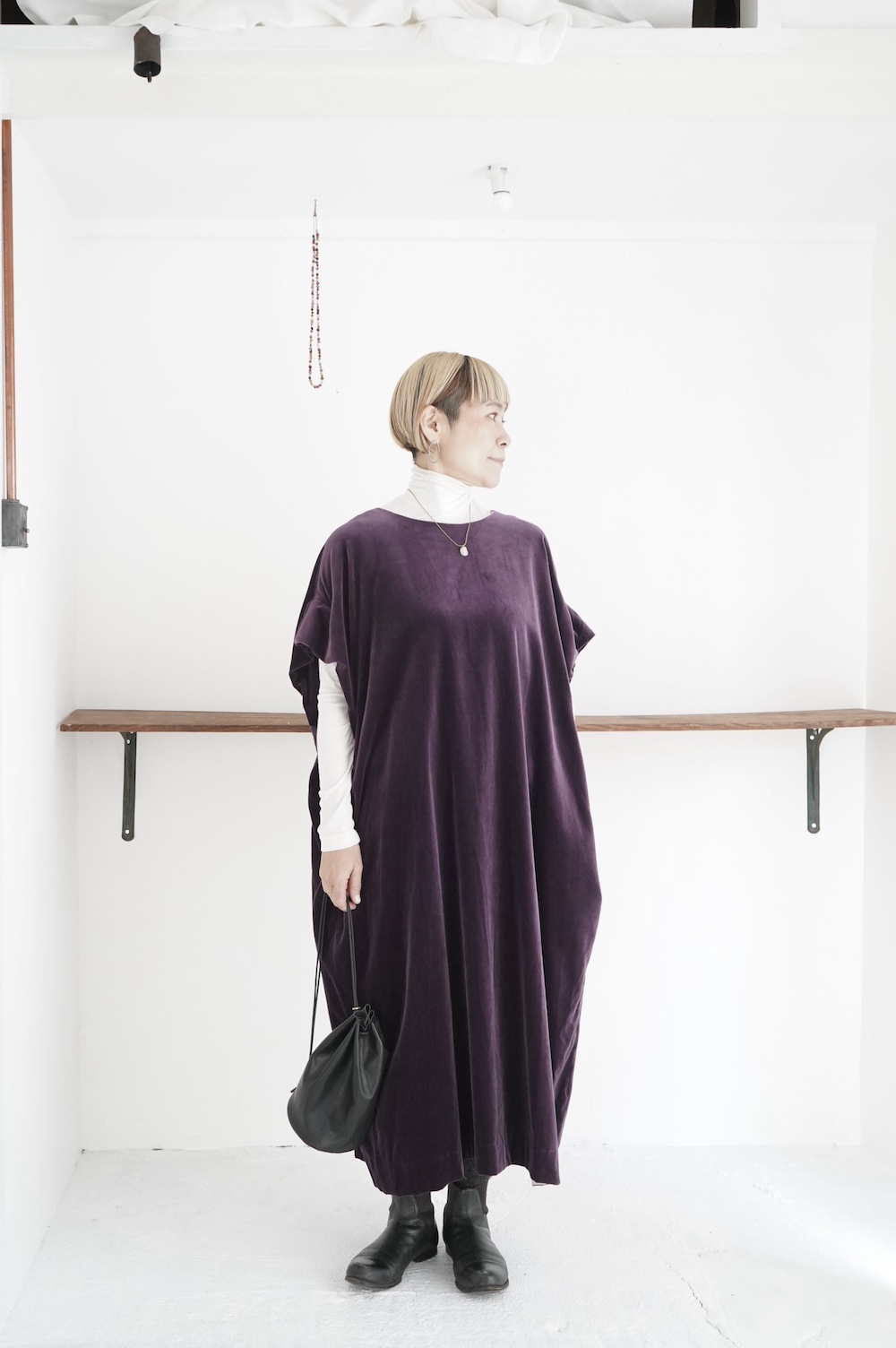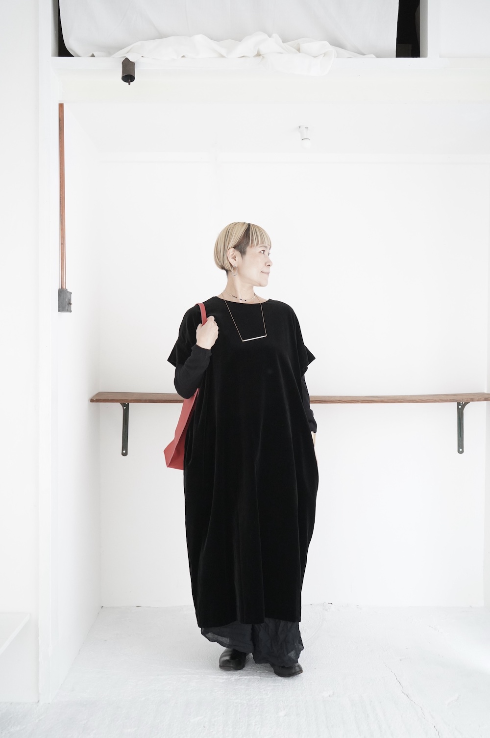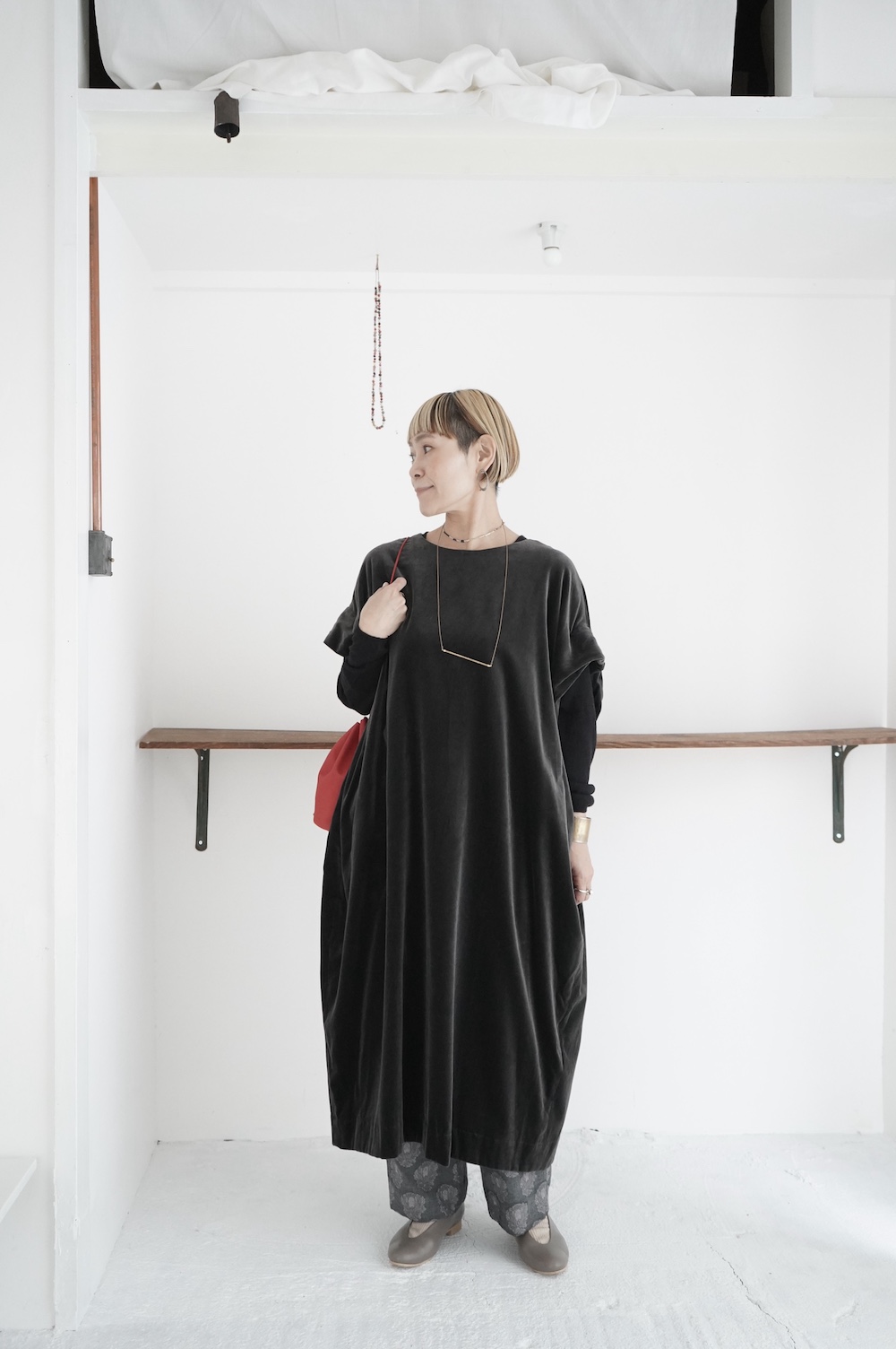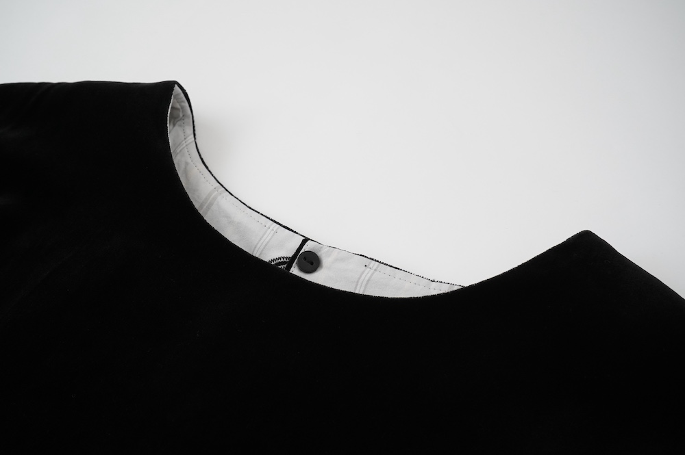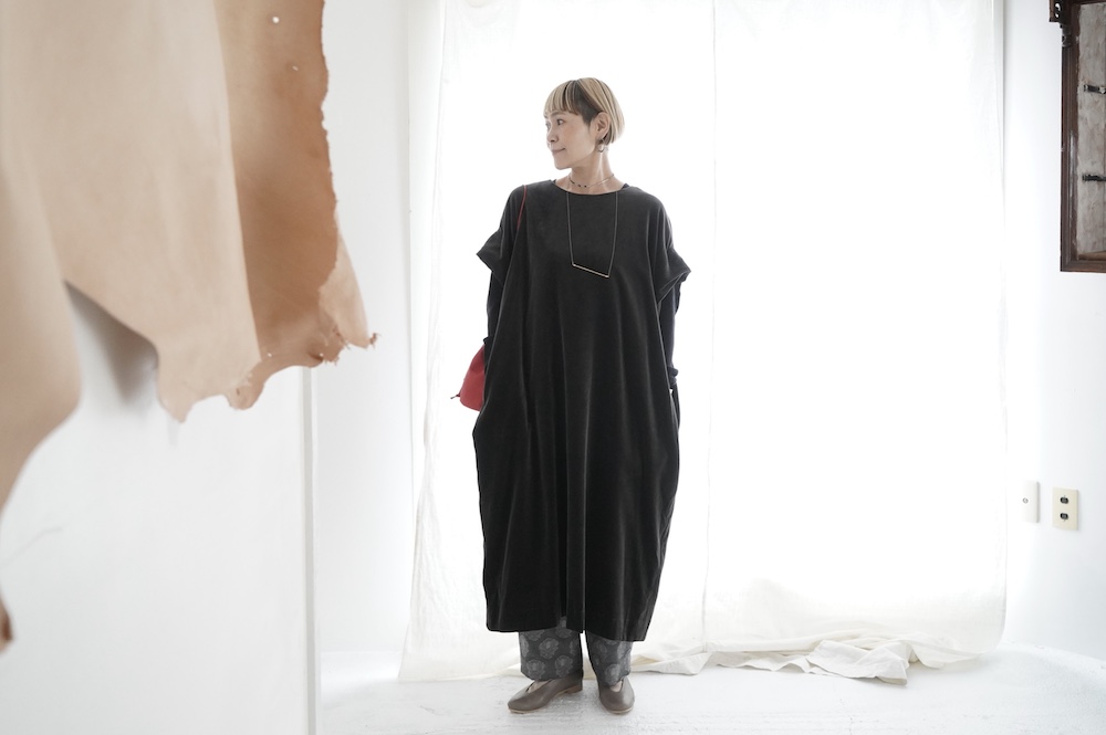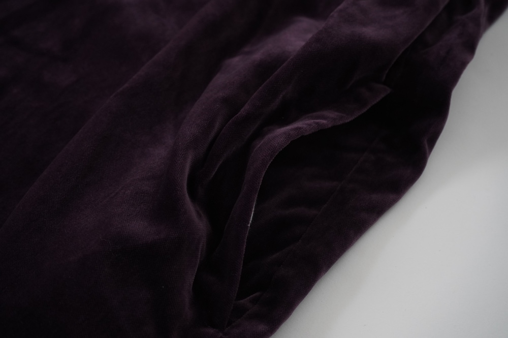 "GASA*"のドレス。ベルベットに洗い加工を施し、ワッシャー感のあるヴィンテージのような趣きを感じさせる素材です。上品な光沢感があり、カジュアルからフォーマルな装いにも着ていただける、華やかさがあります。レーヨン混で柔らかく、ゴワゴワ感のないベルベット生地です。