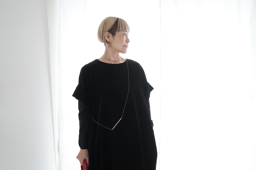 デザインはドロップショルダーのワンピース。ノースリーブでゆとりがあるので、中にニットやブラウスなどの重ね着も可能。着用するシーンに合わせて、中に合わせるアイテムで変化をつけて楽しめます。お祝いの席や、卒業入学などの式典の装いにも素敵です。様々なスタイリングでお楽しみいただけるワンピースです。