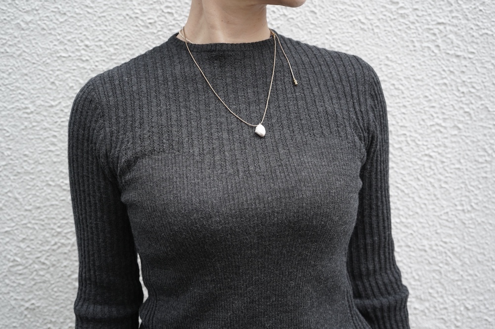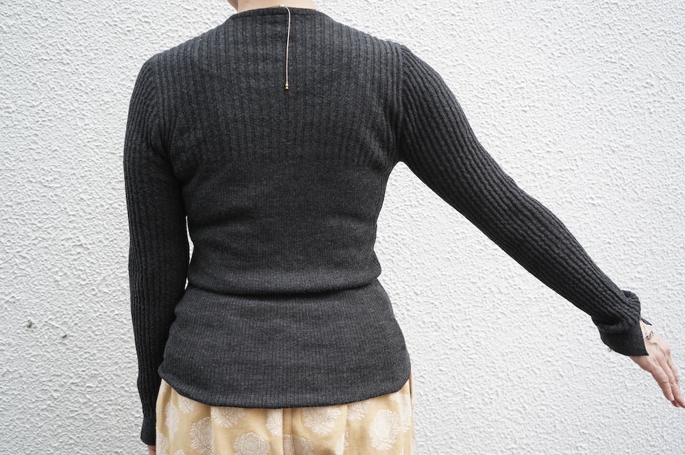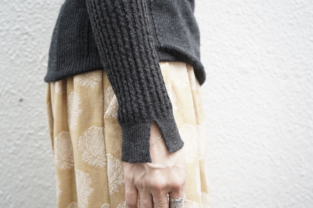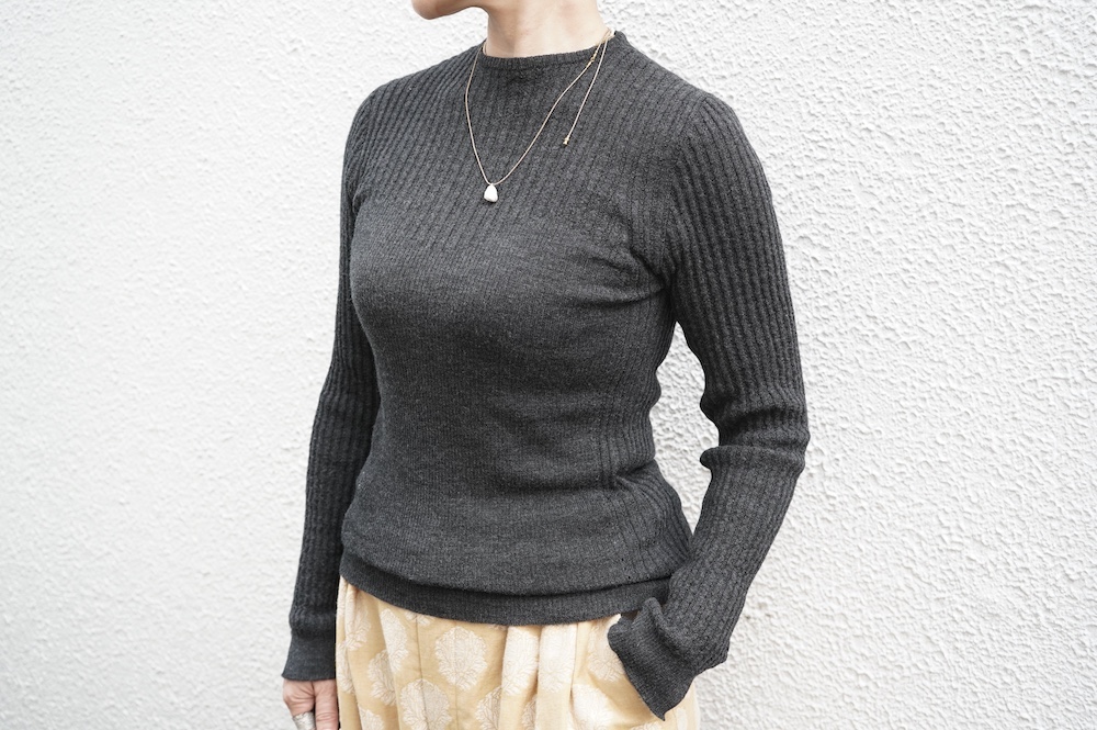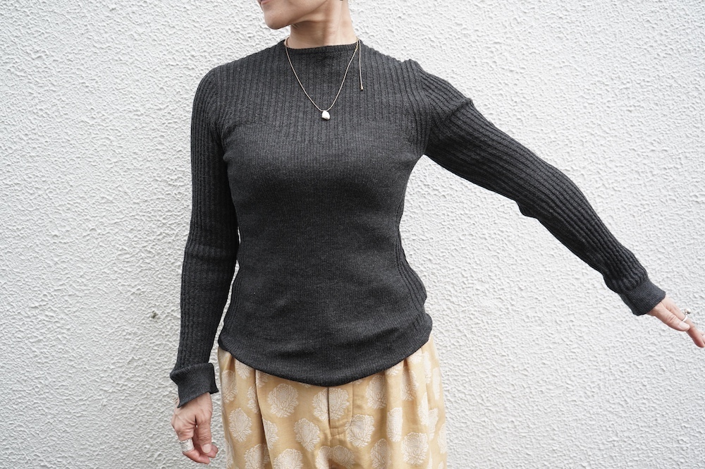 体へのフィッティングは高いものの、張り付く感じや線を強調することなくよいバランスで着用していただけるニットだと感じます。襟は小さめのクルーネックで袖、着丈はやや長めです。上から着る物に合わせてタックインもしていただけます。デザイン的にはバストラインの編み地の切り替えが特徴的で、女性らしいラインが素敵です。またサイドウィーブのような脇の切り替えも洋服好きの気持ちを揺さぶります。袖口は軽めのリブ編みで小さなスリットも効いています。ジャンパースカートやワンピースのインナーとして、またこの季節のブルゾンやジャケット、薄手の羽織のインナーとしても素敵です。カットソーとは一線を画した上質感をお楽しみください。