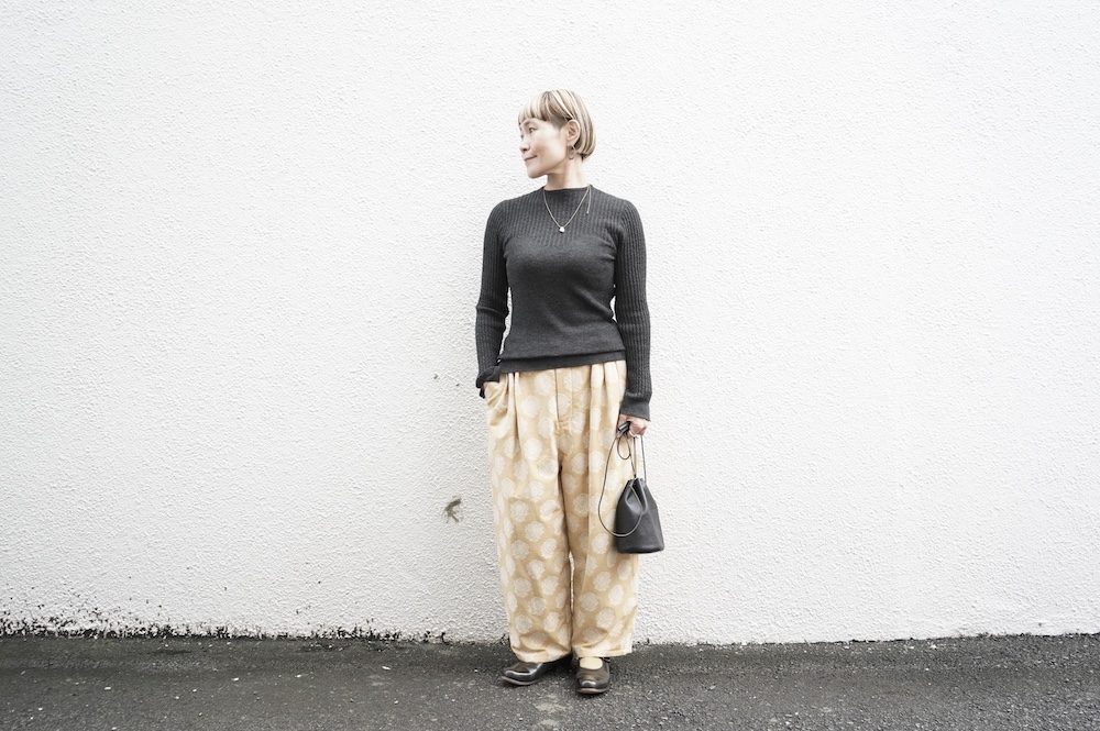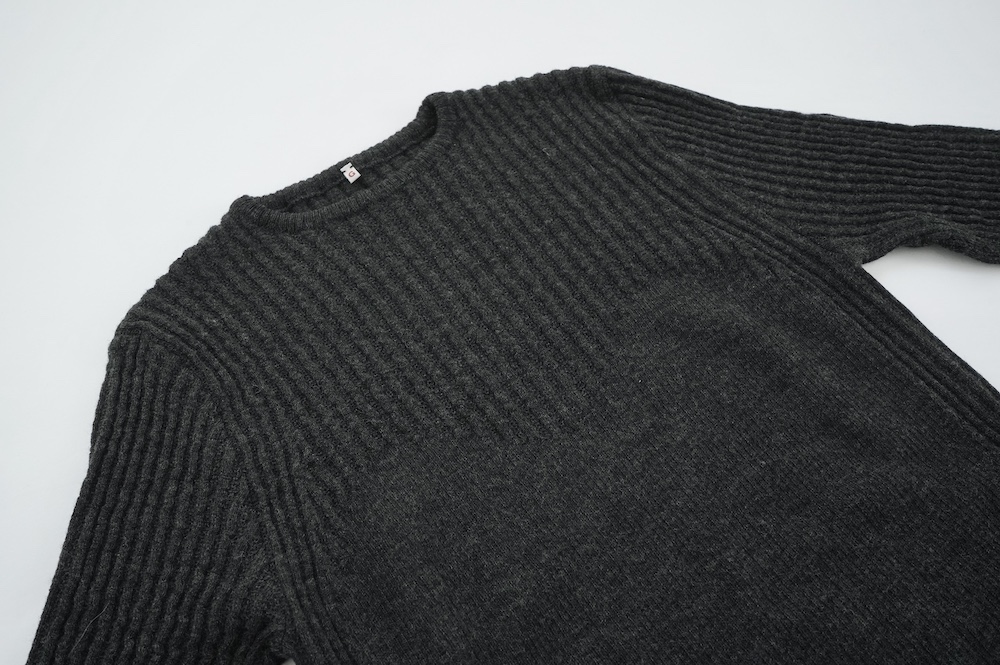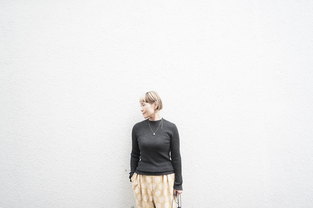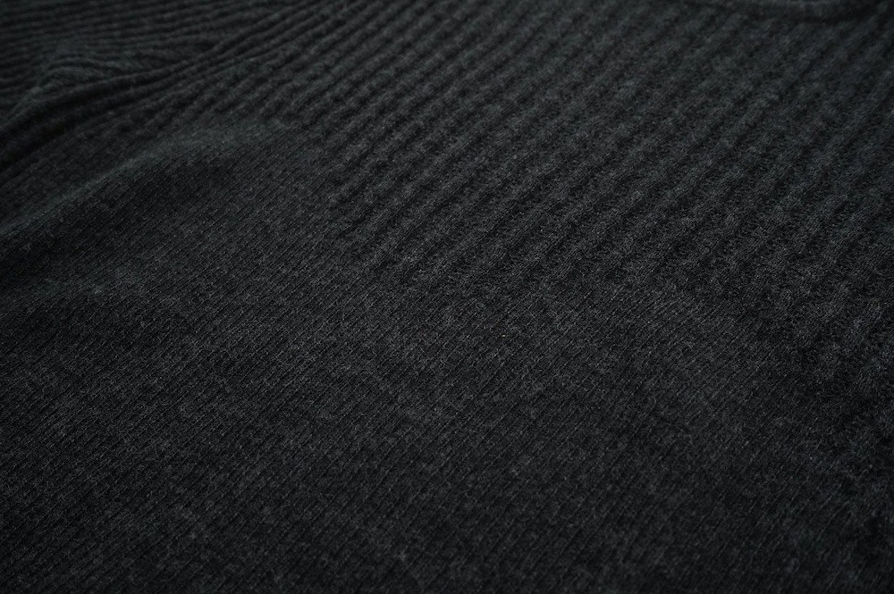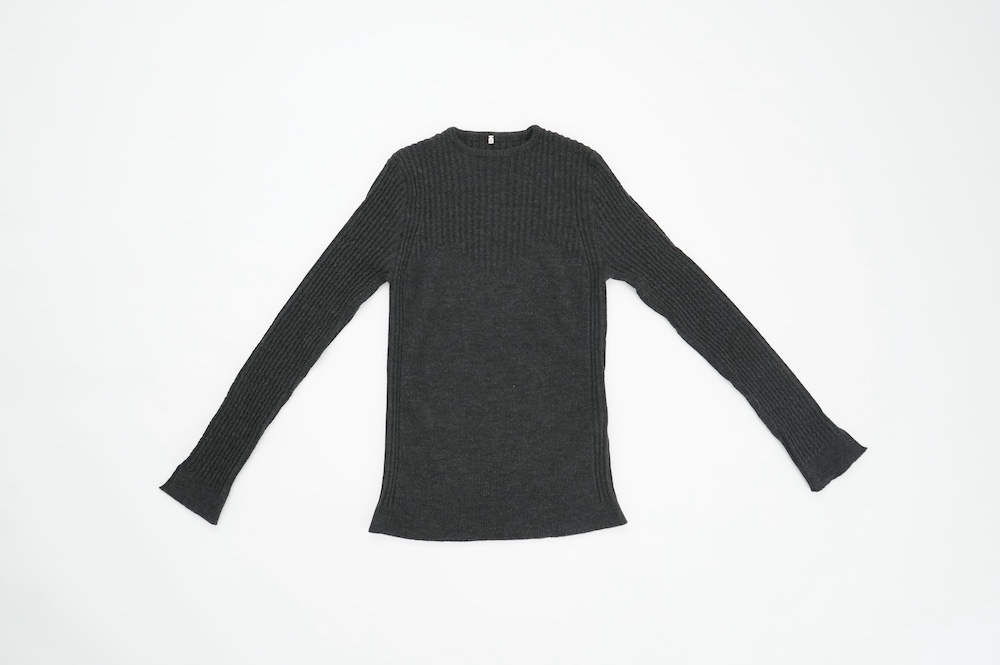 体へのフィッティングは高いものの、張り付く感じや線を強調することなくよいバランスで着用していただけるニットだと感じます。襟は小さめのクルーネックで袖、着丈はやや長めです。上から着る物に合わせてタックインもしていただけます。デザイン的にはバストラインの編み地の切り替えが特徴的で、女性らしいラインが素敵です。またサイドウィーブのような脇の切り替えも洋服好きの気持ちを揺さぶります。袖口は軽めのリブ編みで小さなスリットも効いています。ジャンパースカートやワンピースのインナーとして、またこの季節のブルゾンやジャケット、薄手の羽織のインナーとしても素敵です。カットソーとは一線を画した上質感をお楽しみください。