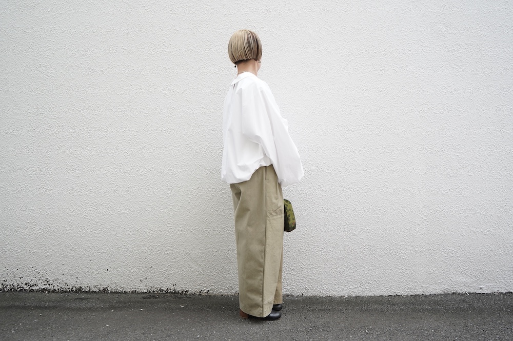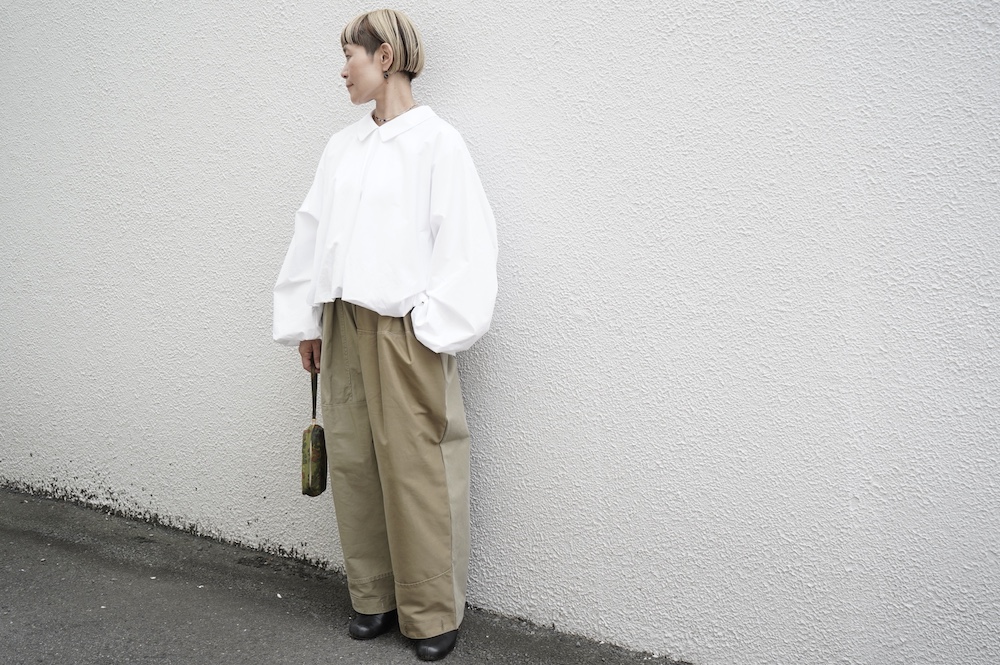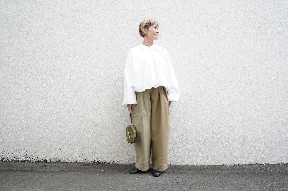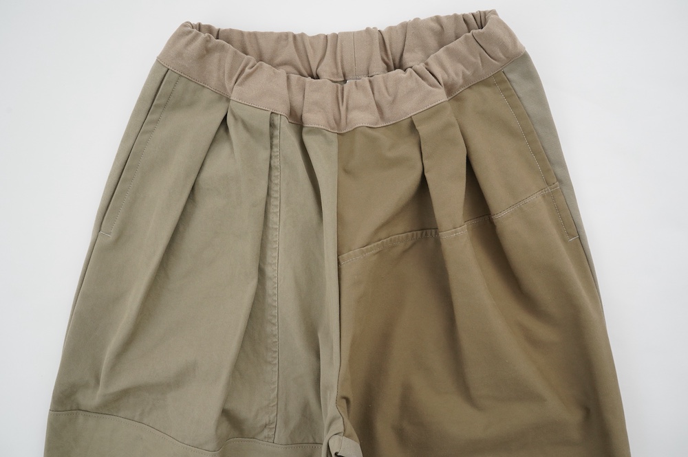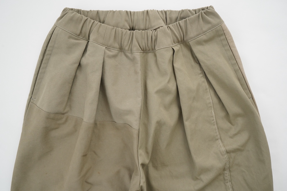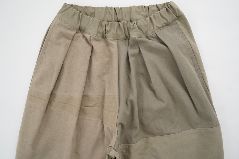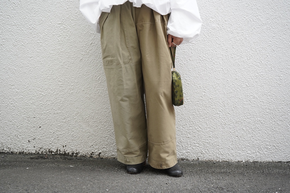 アルテポーヴェラのパンツ。イタリア軍の50年代チノシェラフケースを使用したリメイクパンツ。パーツをパッチワークしています。デザインは定番的に展開している2タックワイドパンツ。シルエットは、ワイドながらゆるやかにテーパードしています。ウエストにタックが入っているので、腰回りはゆったり。ハリのある素材感でワイドなシルエットを崩すことなく穿いていただけます。ウエストはゴムと紐の調節で楽に穿いていただけるイージーパンツ仕様です。パーツによって絶妙に違う色目がUSED素材を利用したリメイクならではの仕上がりです。一本一本違う表情で同じものが他にない愛着がわくパンツです。スウェットやTシャツでそのままカジュアルに着るのはもちろん、少し可愛らしいブラウスや革靴と合わせても面白い。通年通して穿いていただけるので、様々な季節のコーディネートをお楽しみいただけます。