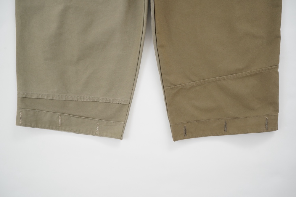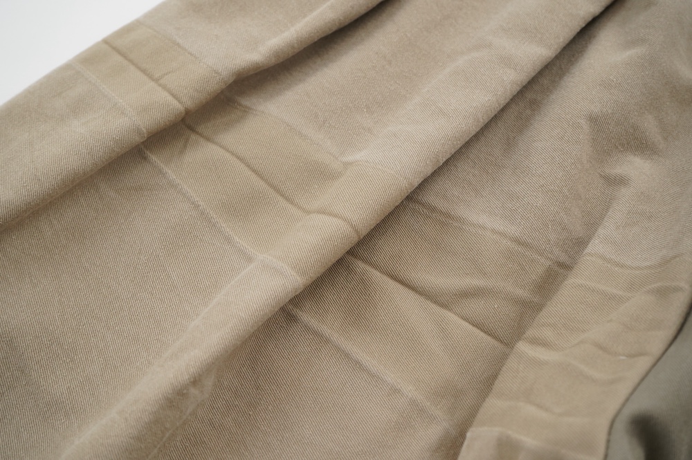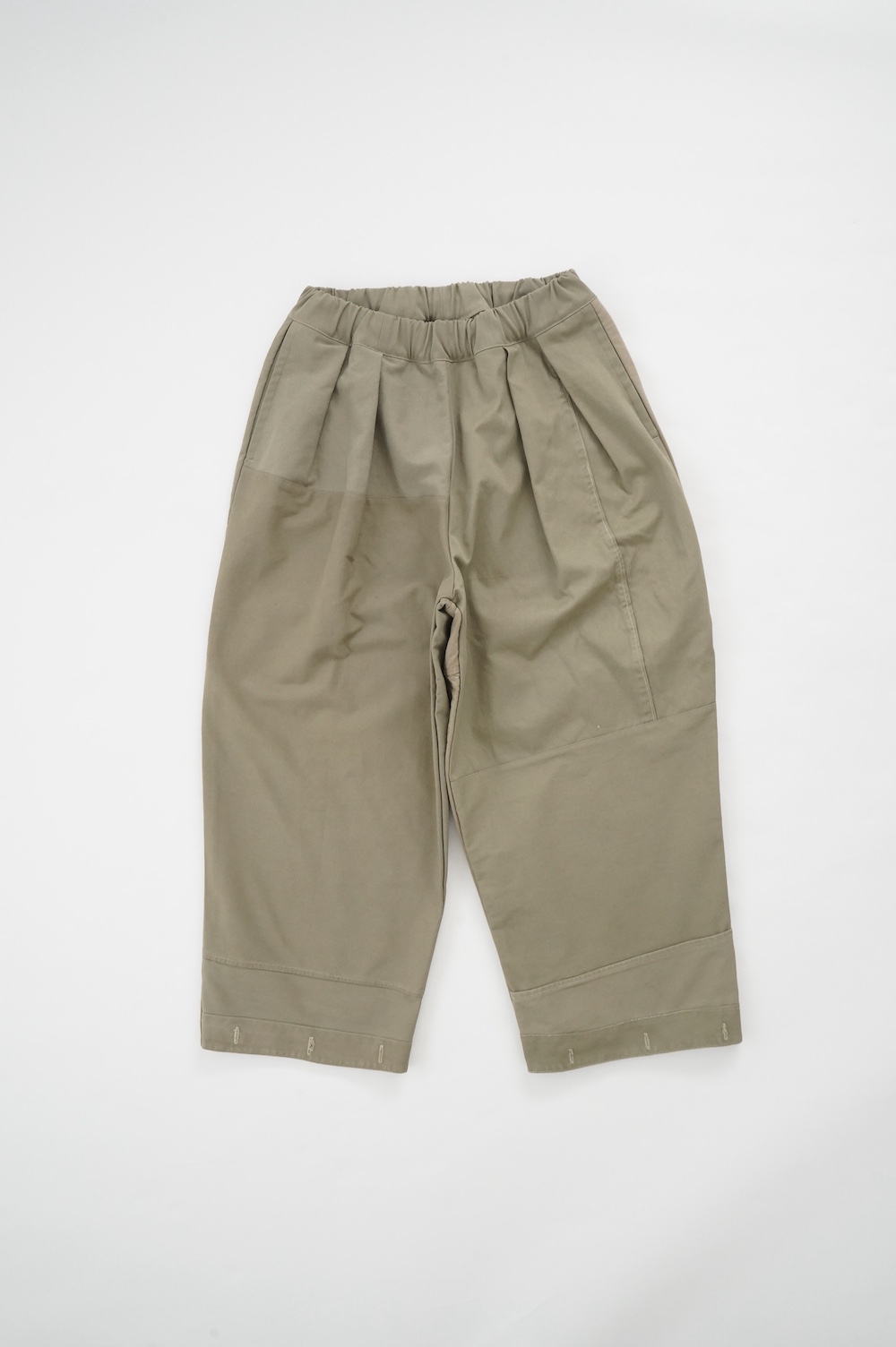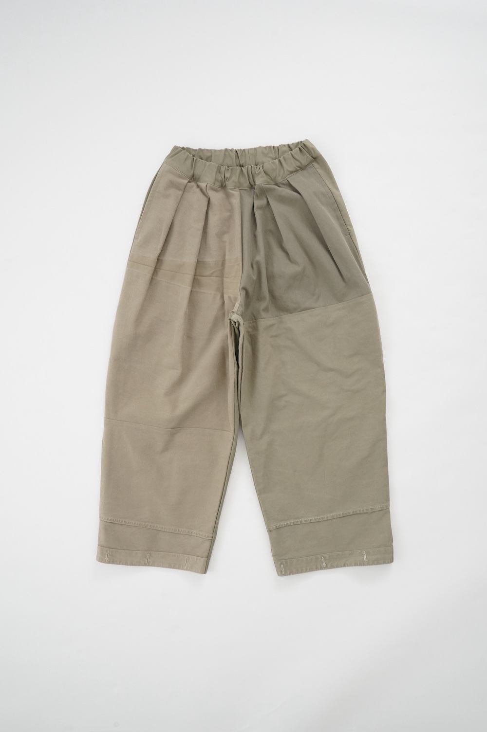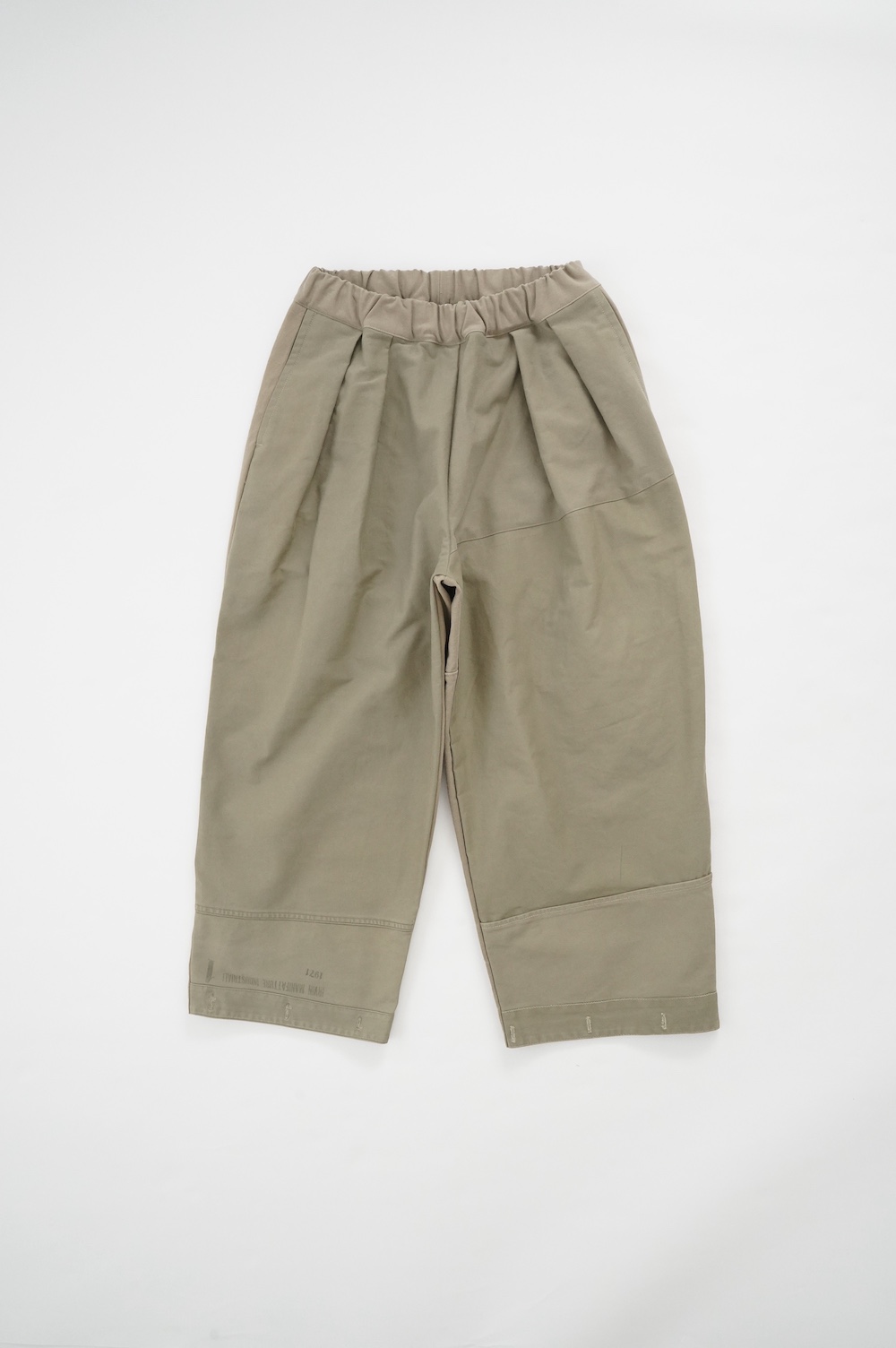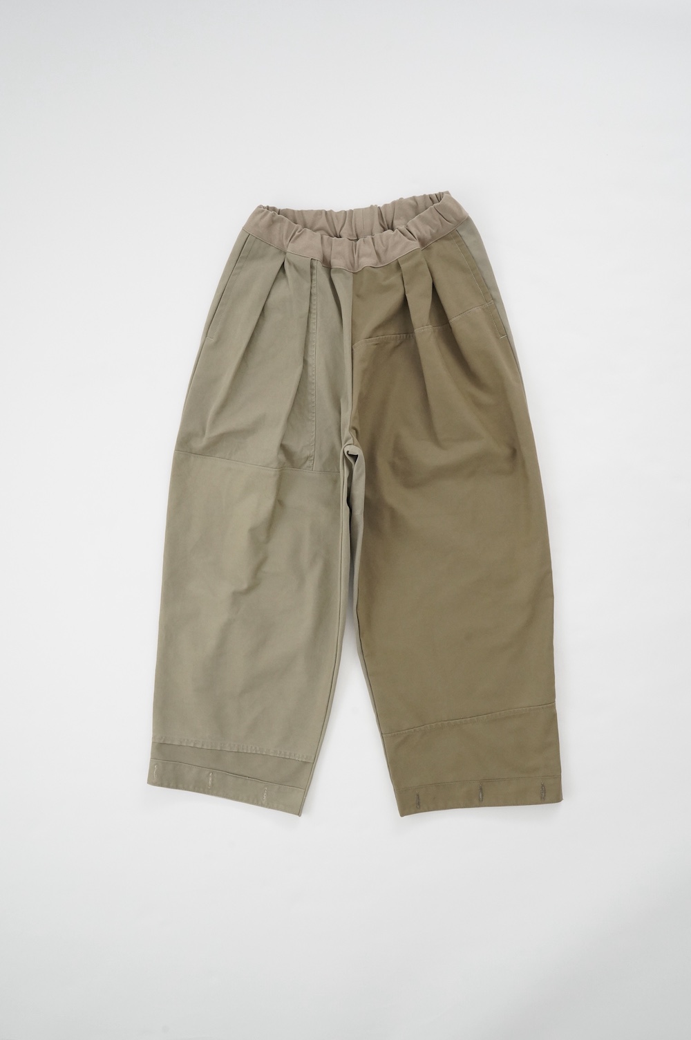 アルテポーヴェラのパンツ。イタリア軍の50年代チノシェラフケースを使用したリメイクパンツ。パーツをパッチワークしています。デザインは定番的に展開している2タックワイドパンツ。シルエットは、ワイドながらゆるやかにテーパードしています。ウエストにタックが入っているので、腰回りはゆったり。ハリのある素材感でワイドなシルエットを崩すことなく穿いていただけます。ウエストはゴムと紐の調節で楽に穿いていただけるイージーパンツ仕様です。パーツによって絶妙に違う色目がUSED素材を利用したリメイクならではの仕上がりです。一本一本違う表情で同じものが他にない愛着がわくパンツです。スウェットやTシャツでそのままカジュアルに着るのはもちろん、少し可愛らしいブラウスや革靴と合わせても面白い。通年通して穿いていただけるので、様々な季節のコーディネートをお楽しみいただけます。