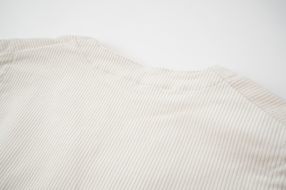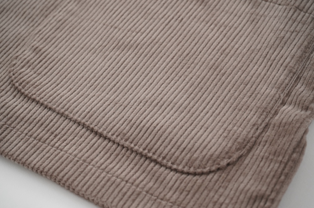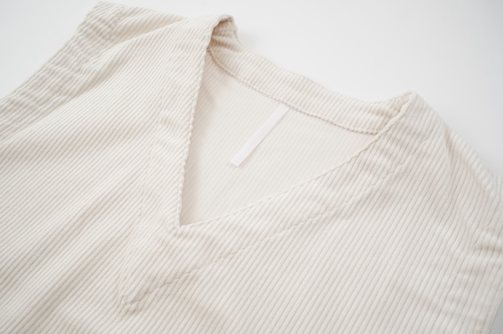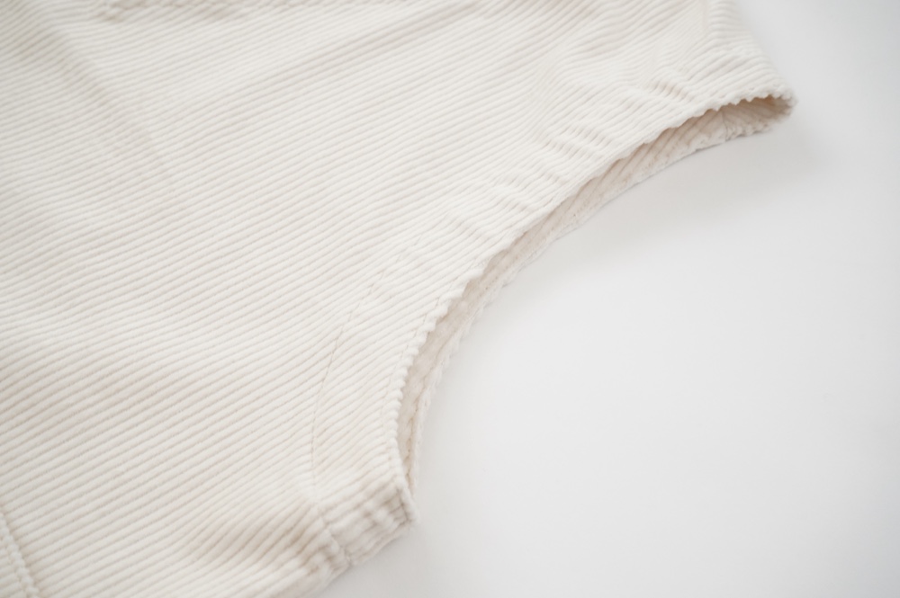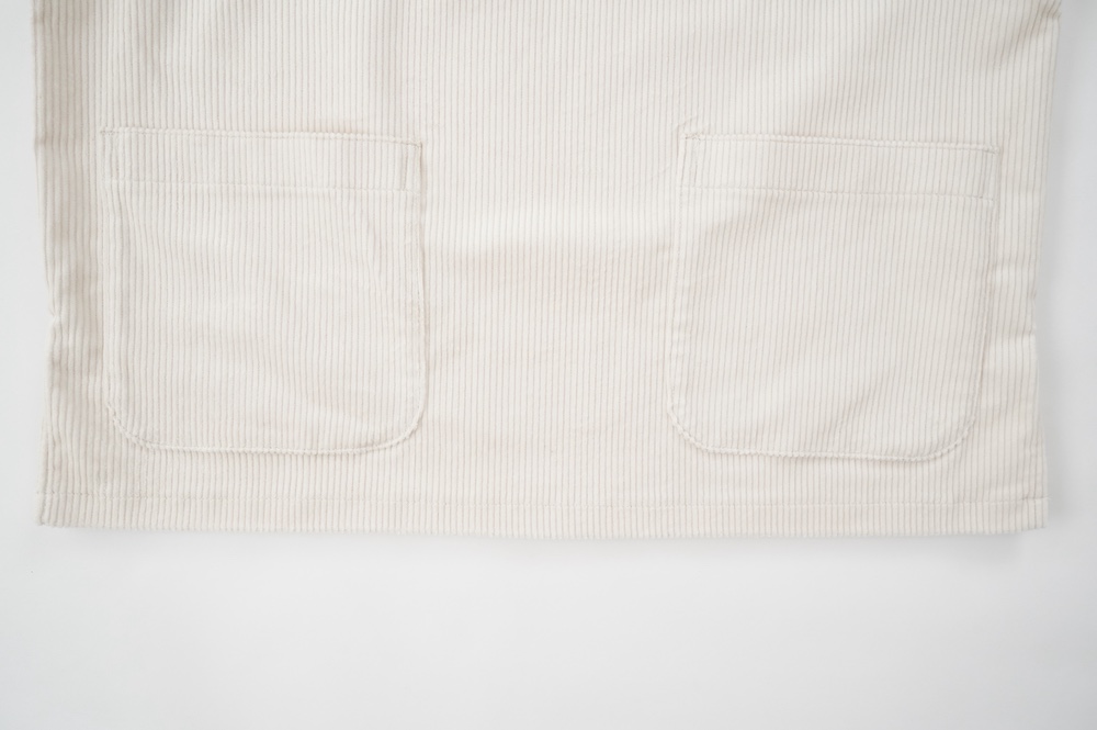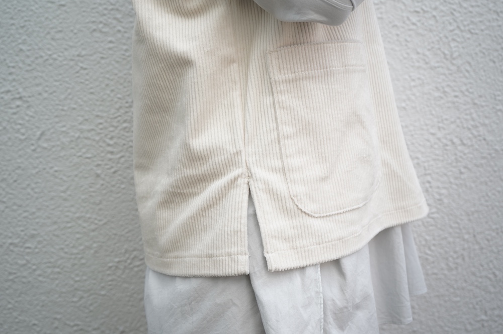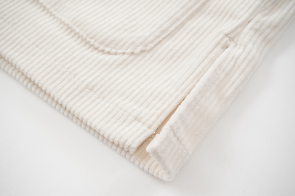 アルテポーヴェラのパンツ。ソフトな中畝のストレッチコーデュロイ生地を使用。しっかりした感触のコーデュロイは、ガシッとしながらもストレッチが効いて軽やかな履き心地です。着用でのごわつきは感じません。また、畝にクラッシュした跡のある少し荒々しさも見受けられる国産のコーデュロイは、他になかなか見られない表情で、個人的にひと目惚れでした。たいていのたたみジワはアイロンで整いますが、そうでない箇所もございます。生地の特性上、キレイめのコーデュロイをご希望の方にはお勧めできませんが、ハードにカジュアルにオシャレに穿いていただけるおすすめのコーデュロイです。ホワイトは特製の跡は目立ちませんし、じっくり見てもあまりわかりません。