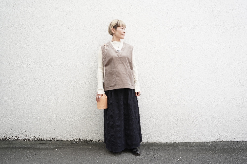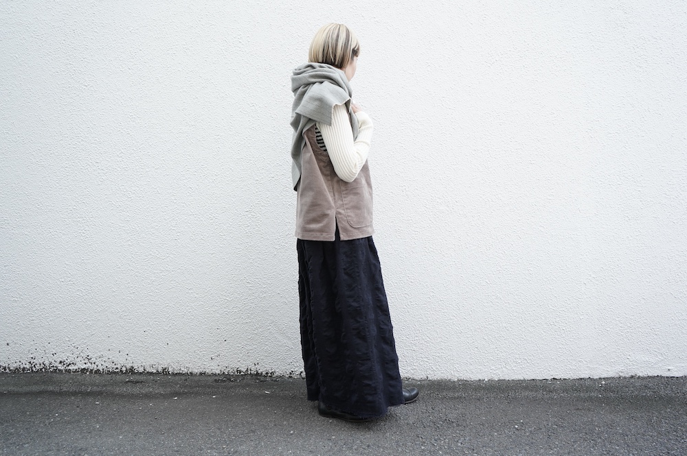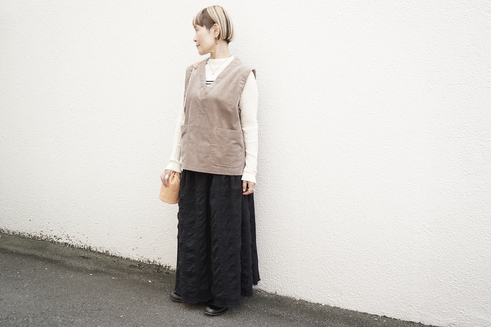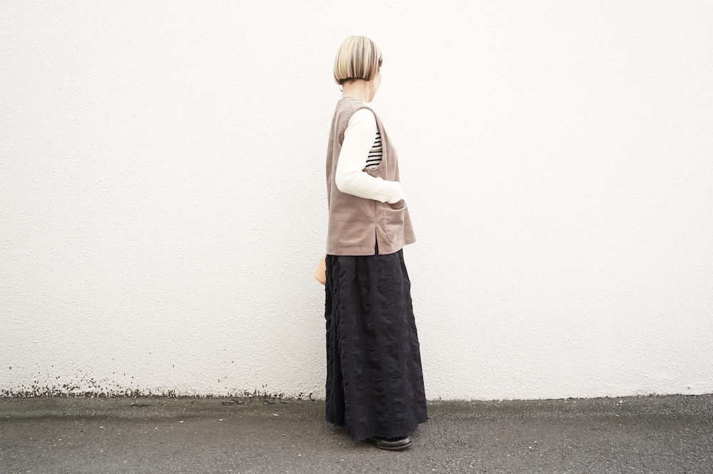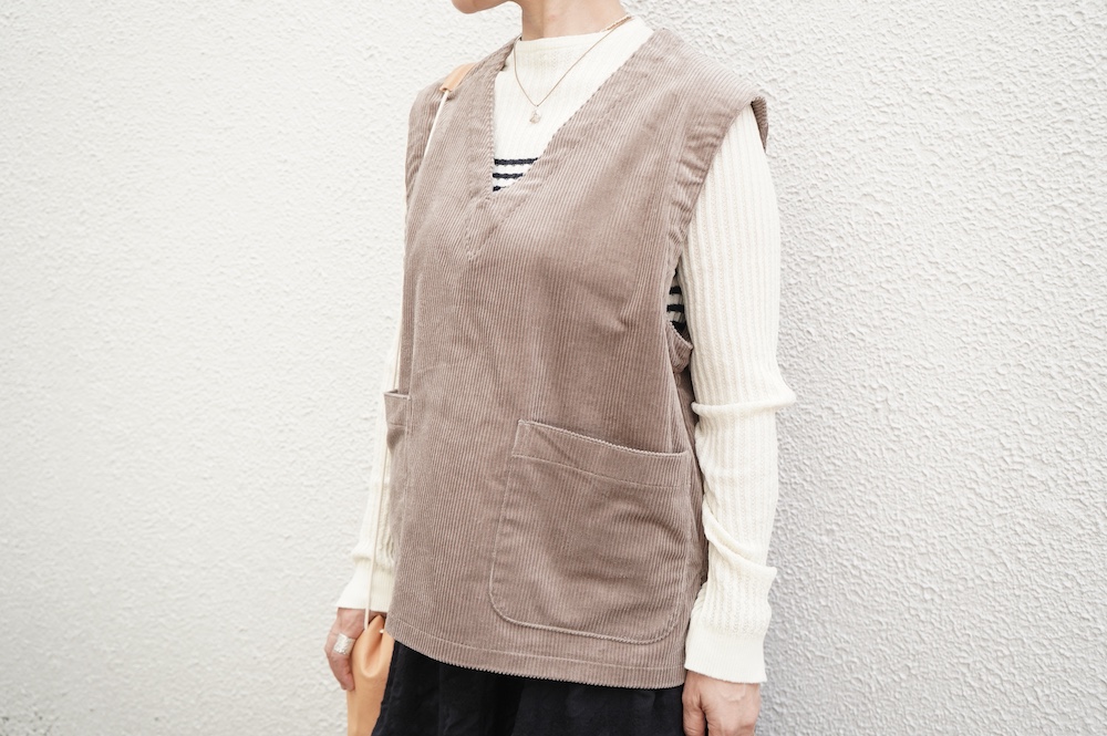 デザインはゆったりしたVネックベスト。フランス50年代のベストを参考にサイズバランスをワイドにしてポケットを付けたシンプルなベストです。インナーに長袖カットソーを着たり、またブラウスや薄手のニットを合わせたりと、インナー次第で長い期間お楽しみいただけます。同素材のパンツとセットアップも素敵です。スタイリングの幅が広いアイテムです。