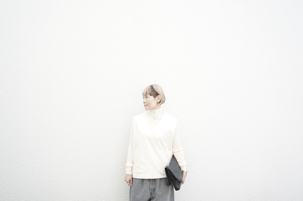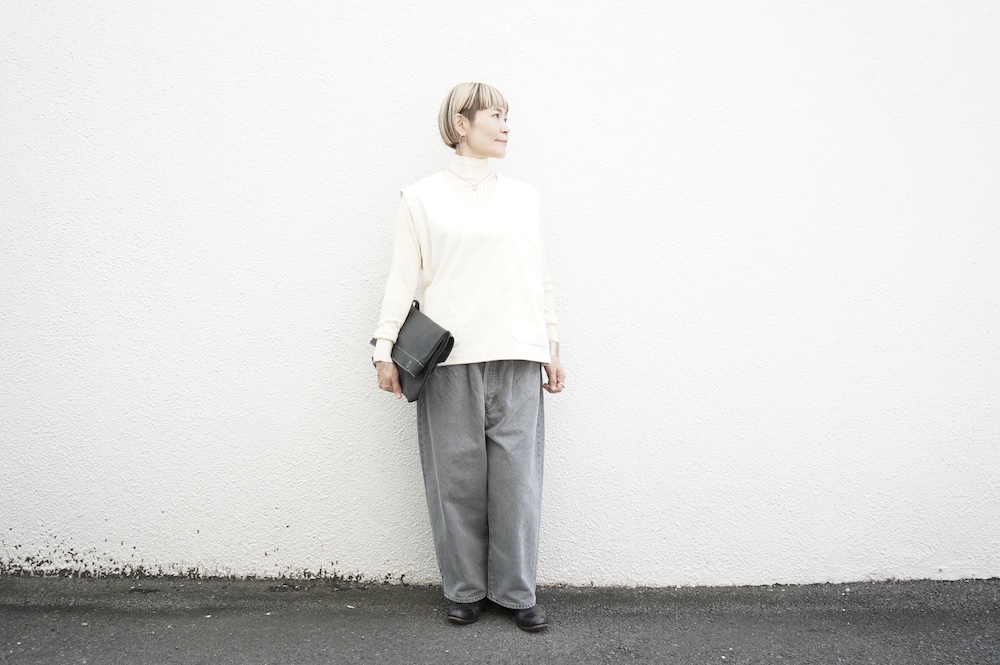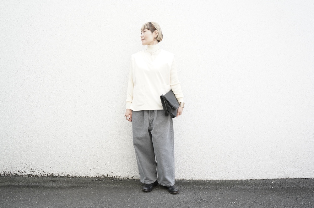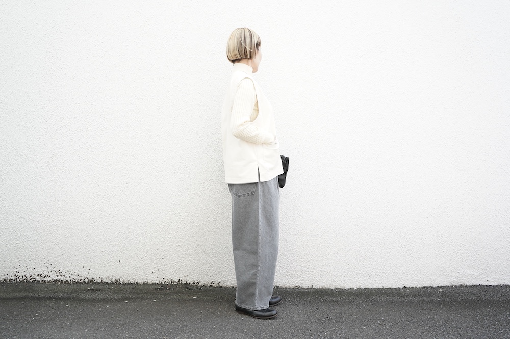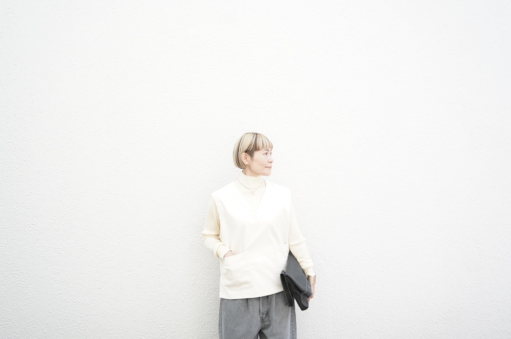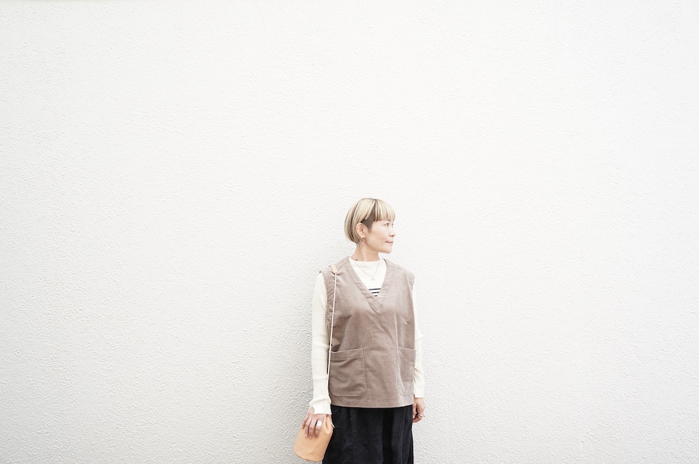 デザインはゆったりしたVネックベスト。フランス50年代のベストを参考にサイズバランスをワイドにしてポケットを付けたシンプルなベストです。インナーに長袖カットソーを着たり、またブラウスや薄手のニットを合わせたりと、インナー次第で長い期間お楽しみいただけます。同素材のパンツとセットアップも素敵です。スタイリングの幅が広いアイテムです。