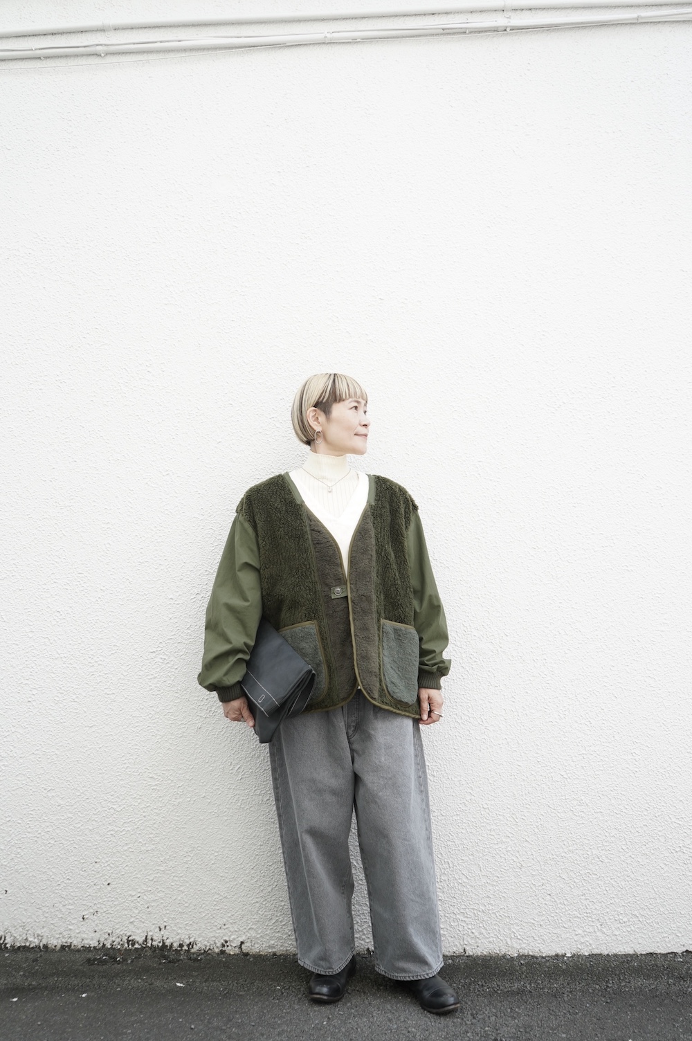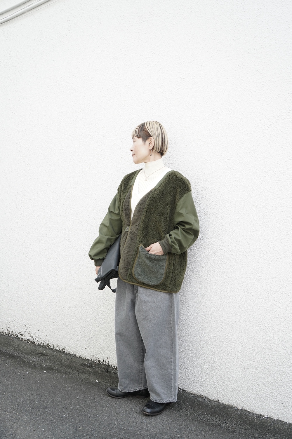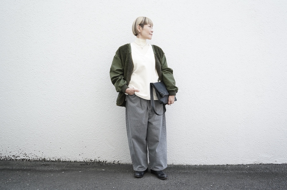 ARTE POVERAのボアカーディガンを羽織って
