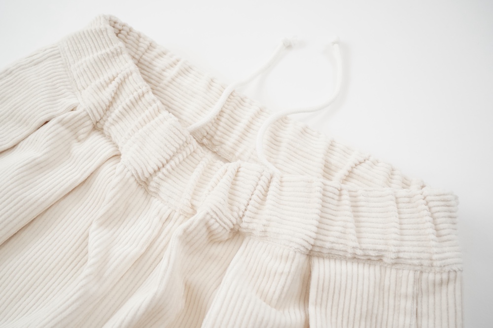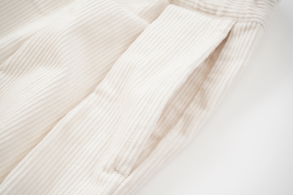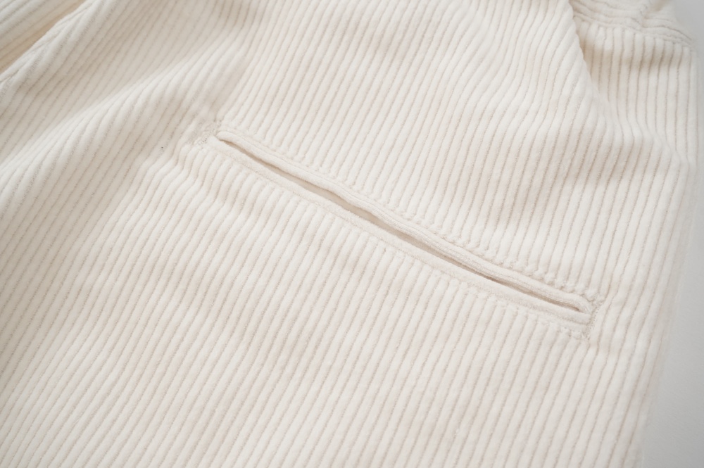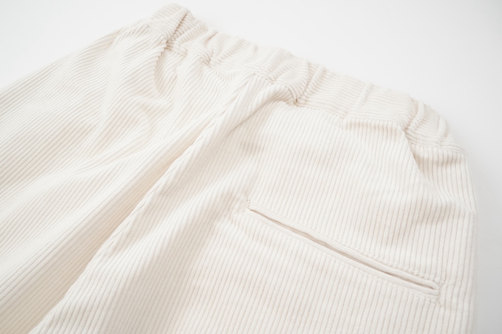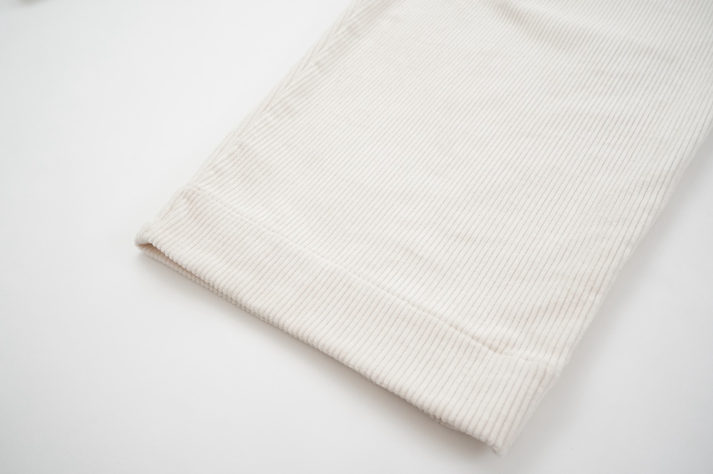 アルテポーヴェラのパンツ。ソフトな中畝のストレッチコーデュロイ生地を使用。しっかりした感触のコーデュロイは、ガシッとしながらもストレッチが効いて軽やかな履き心地です。着用でのごわつきは感じません。また、畝にクラッシュした跡のある少し荒々しさも見受けられる国産のコーデュロイは、他になかなか見られない表情で、個人的にひと目惚れでした。たいていのたたみジワはアイロンで整いますが、そうでない箇所もございます。生地の特性上、キレイめのコーデュロイをご希望の方にはお勧めできませんが、ハードにカジュアルにオシャレに穿いていただけるおすすめのコーデュロイです。ホワイトは特製の跡は目立ちませんし、じっくり見てもあまりわかりません。