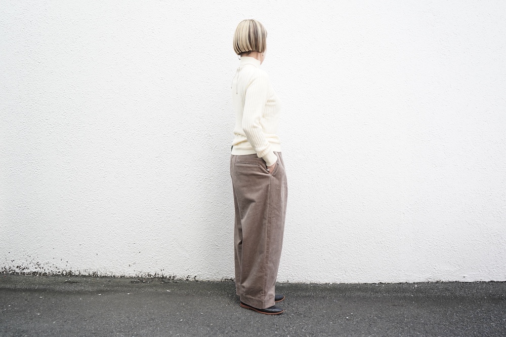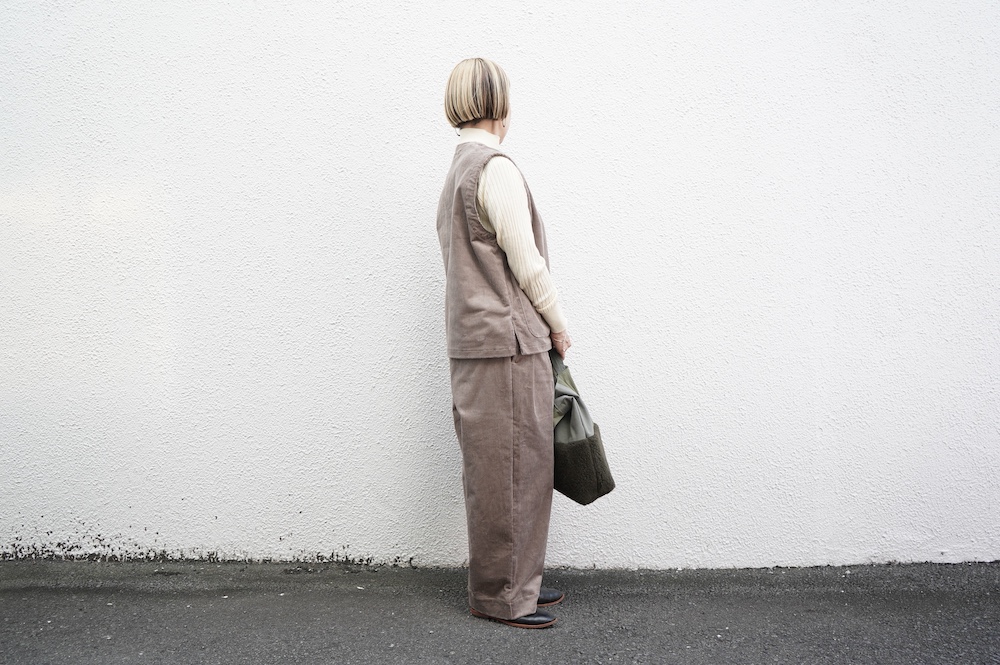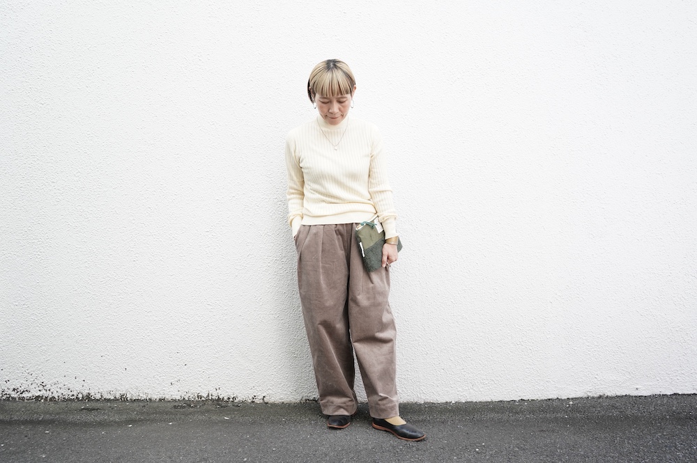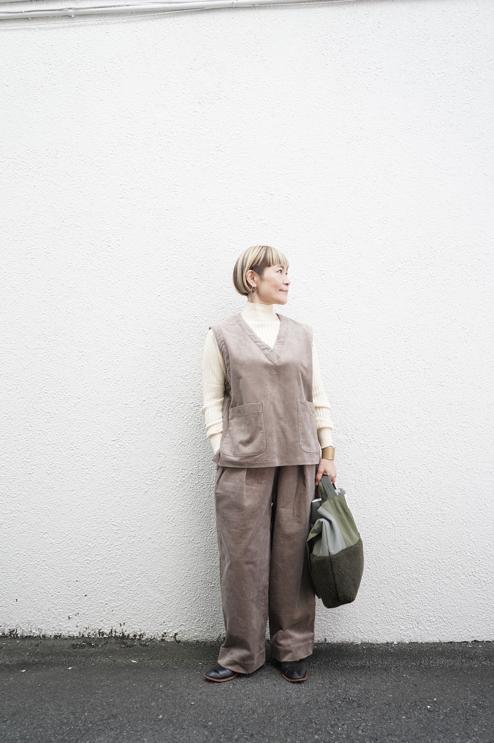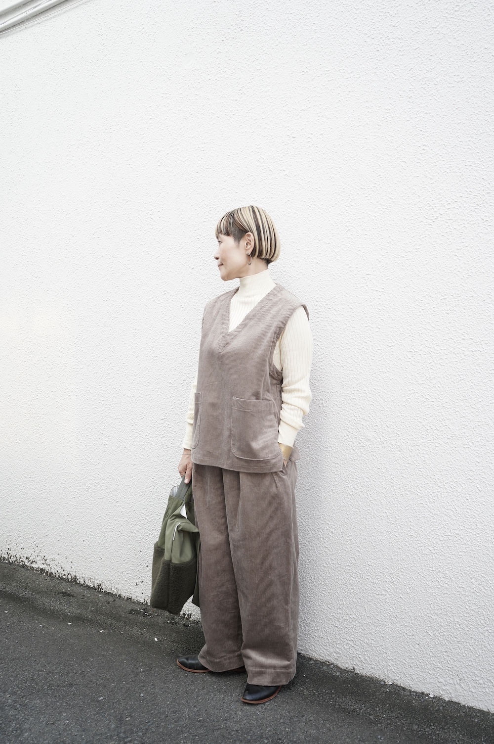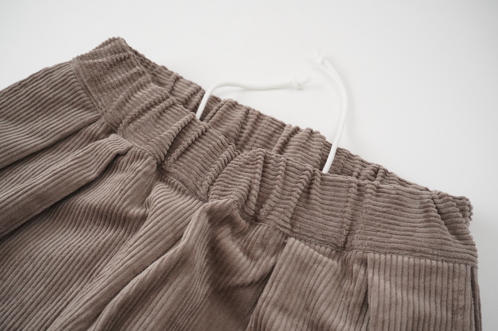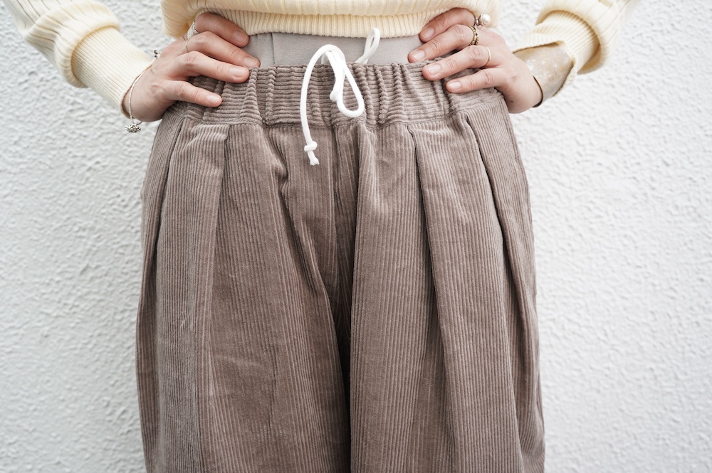 デザインはワイドながらゆるやかにテーパードしたイージーパンツ。ウエストに2タック入っているので、腰回りはゆったり。ハリのある素材感でワイドなシルエットを崩すことなく穿いていただけます。ウエストはゴムと紐の調節で楽に穿いていただけるイージーパンツ仕様。同素材でベストもございますので、セットアップもお勧めです。フルレングスなのも秋冬は嬉しいポイント。コーデュロイ 特有のゴワっと感がなく、ストレッチ性もあり穿き心地抜群のコーデュロイパンツです。