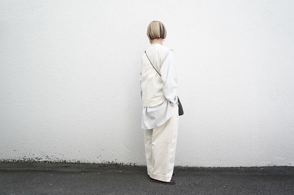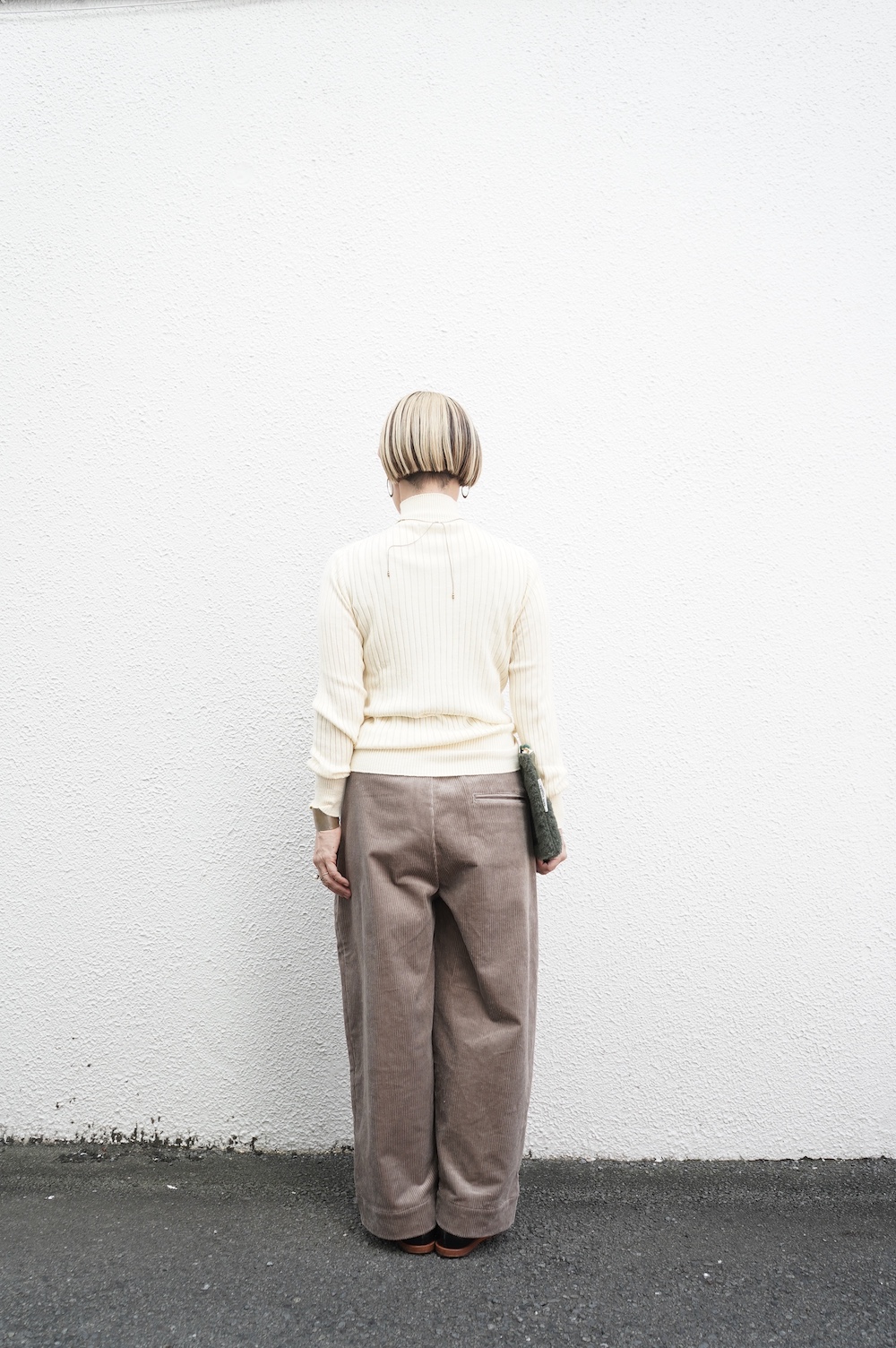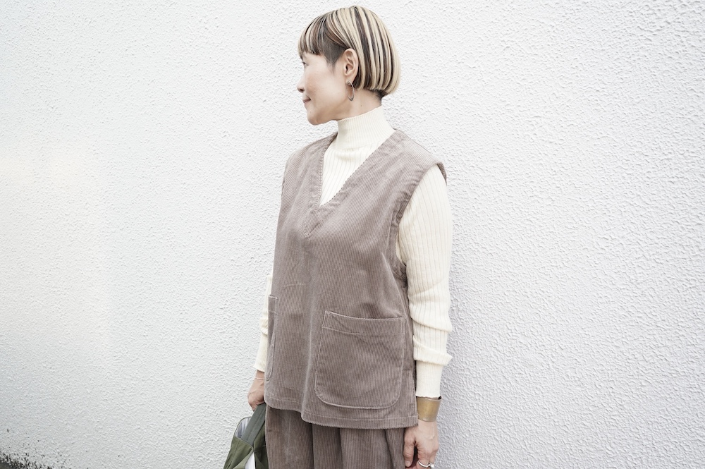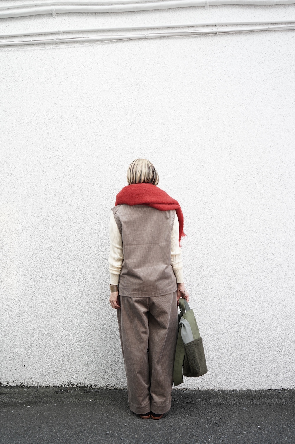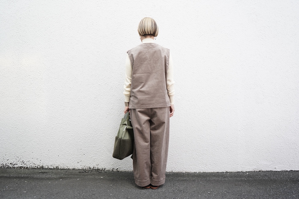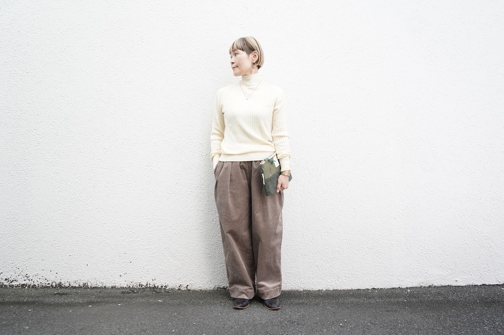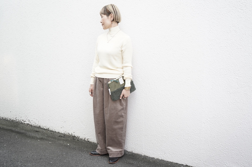 デザインはワイドながらゆるやかにテーパードしたイージーパンツ。ウエストに2タック入っているので、腰回りはゆったり。ハリのある素材感でワイドなシルエットを崩すことなく穿いていただけます。ウエストはゴムと紐の調節で楽に穿いていただけるイージーパンツ仕様。同素材でベストもございますので、セットアップもお勧めです。フルレングスなのも秋冬は嬉しいポイント。コーデュロイ 特有のゴワっと感がなく、ストレッチ性もあり穿き心地抜群のコーデュロイパンツです。