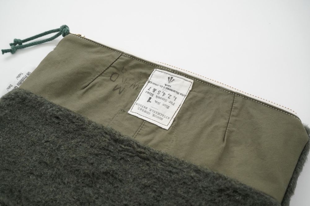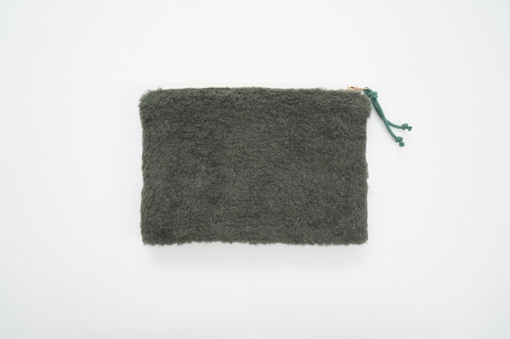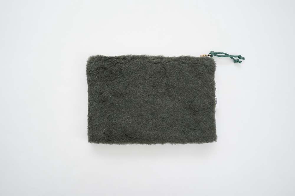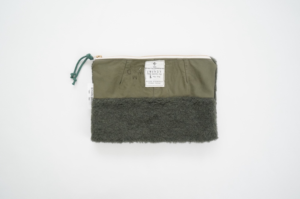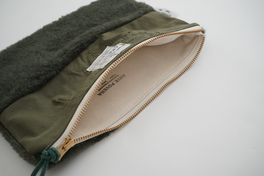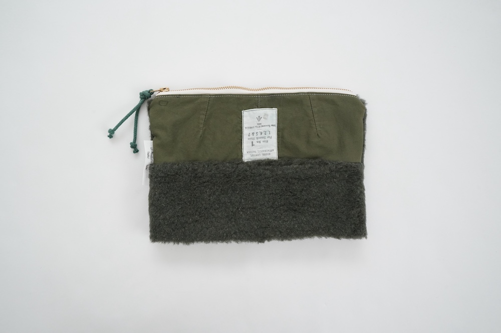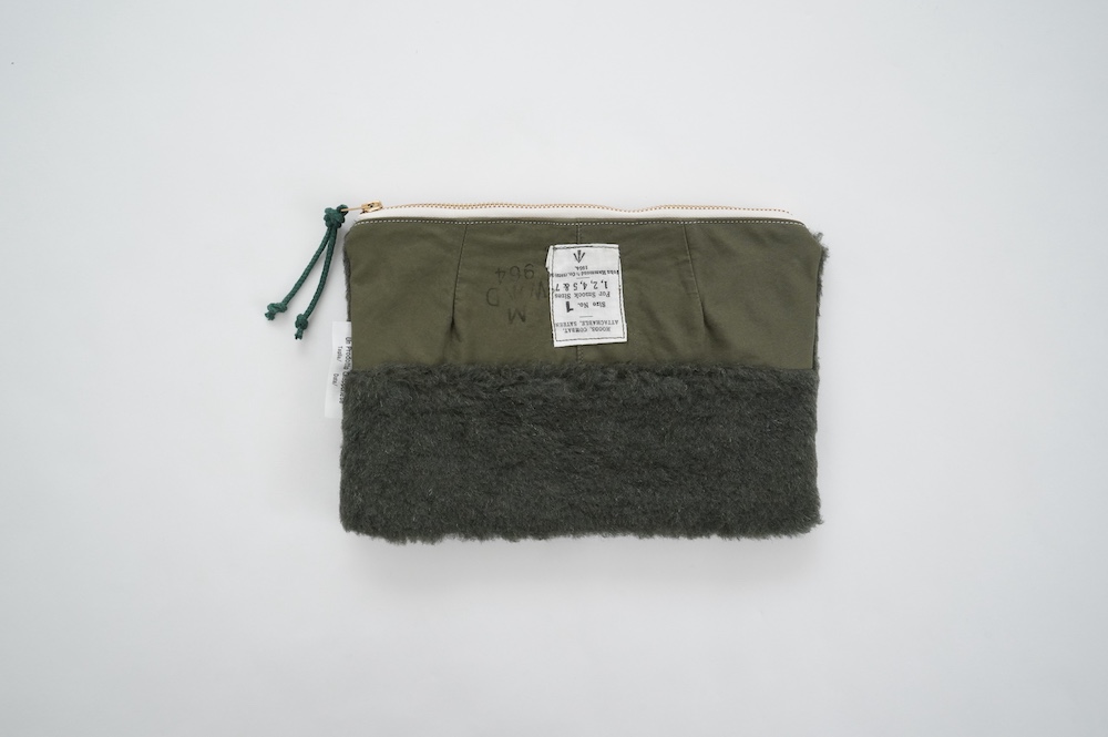 "アルテポーヴェラ"のポーチ。50年代のイギリス軍のフード素材と、フランス軍のボア素材をミックスして作成したポーチ。マチなしですが、大きめサイズなので収納力があります。ポーチとしてだけではなく、クラッチバッグのように持ったり、バッグインバッグにもおすすめです。もふもふのボアがテンションの上がる、バッグの中でも存在感を放つポーチです。
