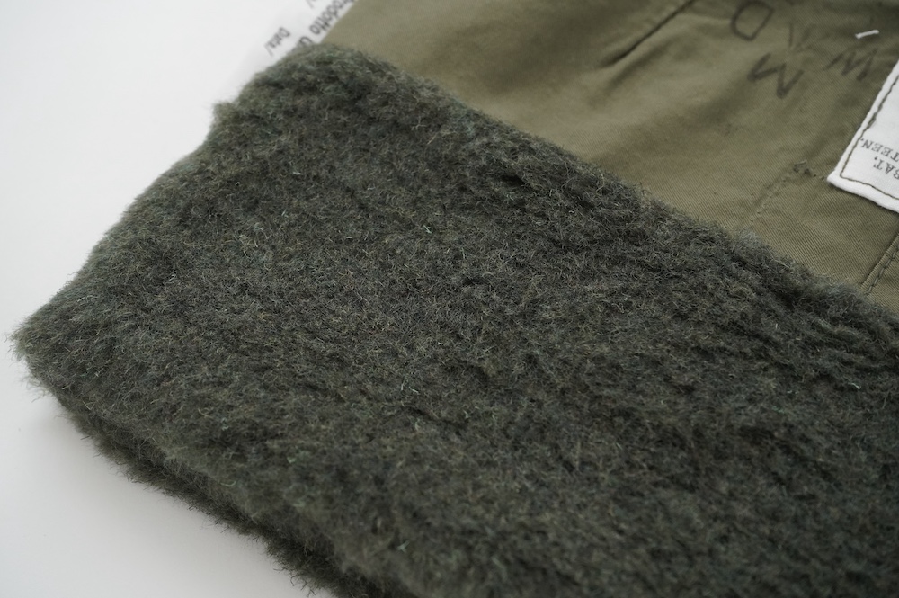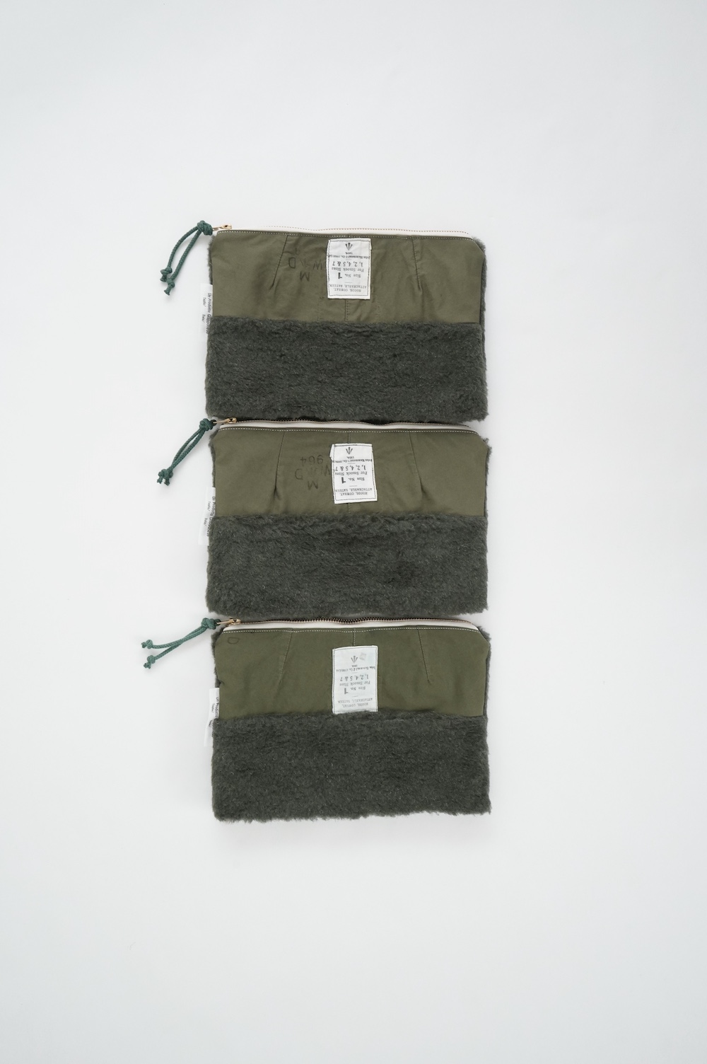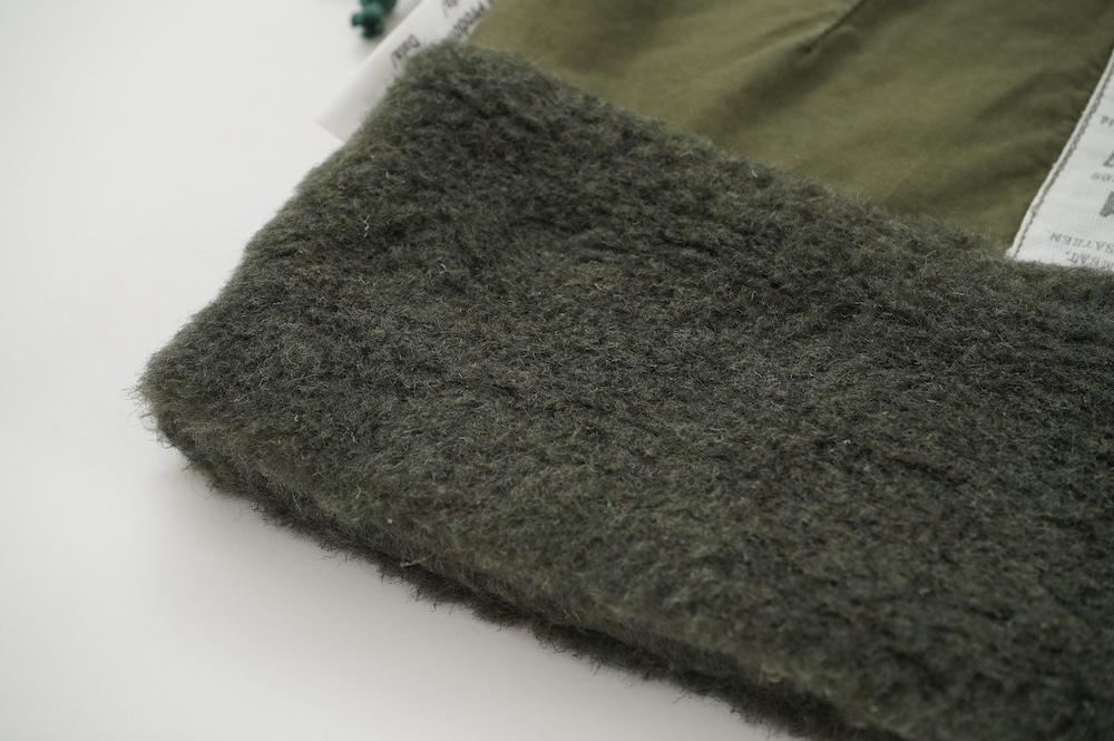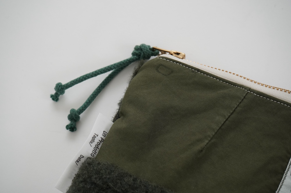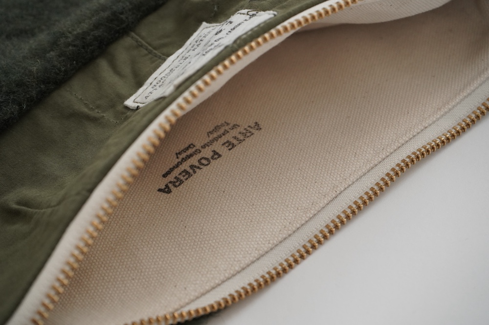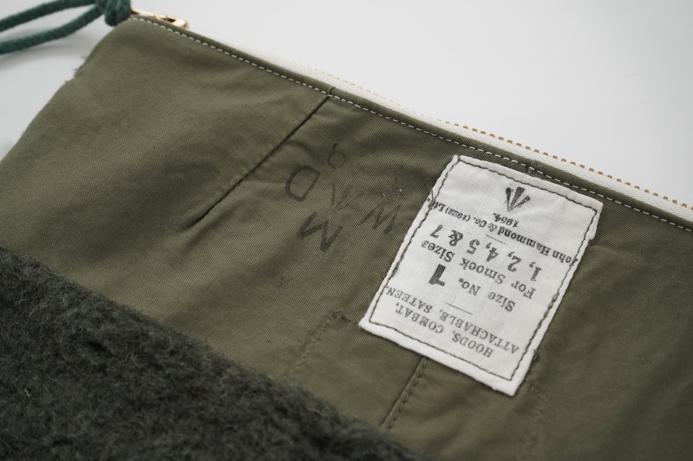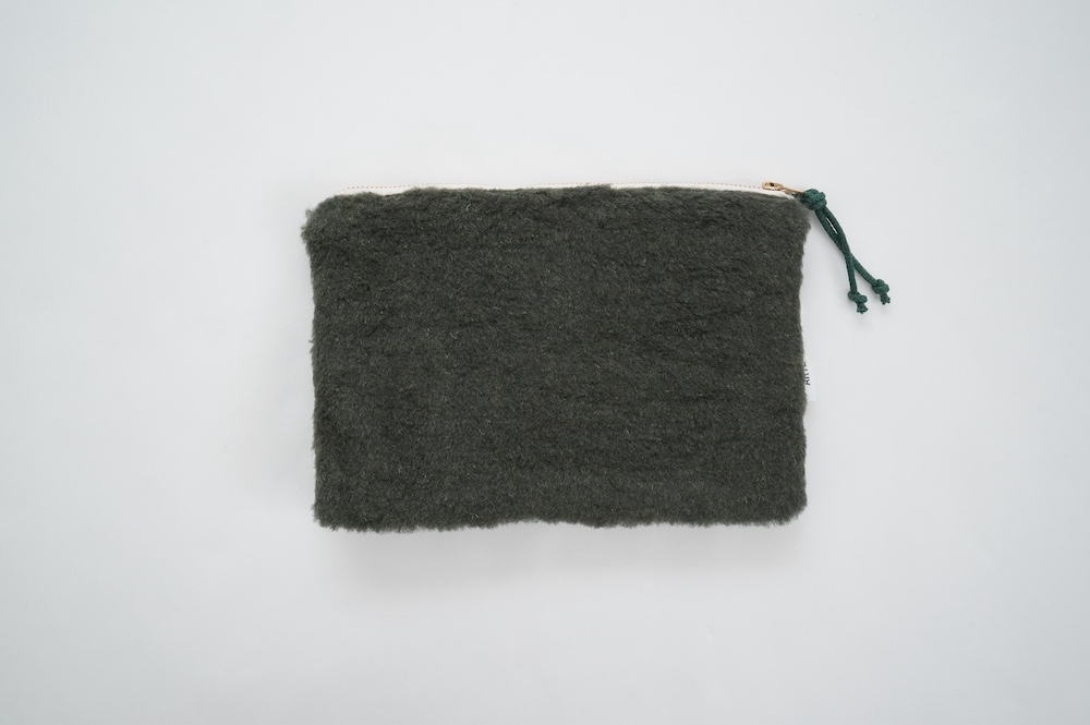"アルテポーヴェラ"のポーチ。50年代のイギリス軍のフード素材と、フランス軍のボア素材をミックスして作成したポーチ。マチなしですが、大きめサイズなので収納力があります。ポーチとしてだけではなく、クラッチバッグのように持ったり、バッグインバッグにもおすすめです。もふもふのボアがテンションの上がる、バッグの中でも存在感を放つポーチです。