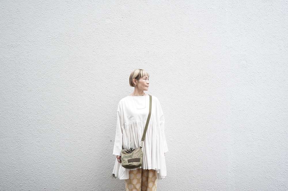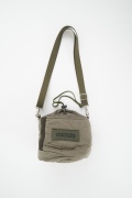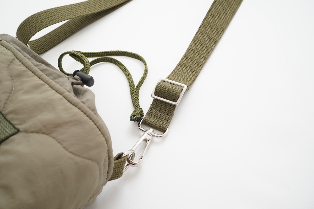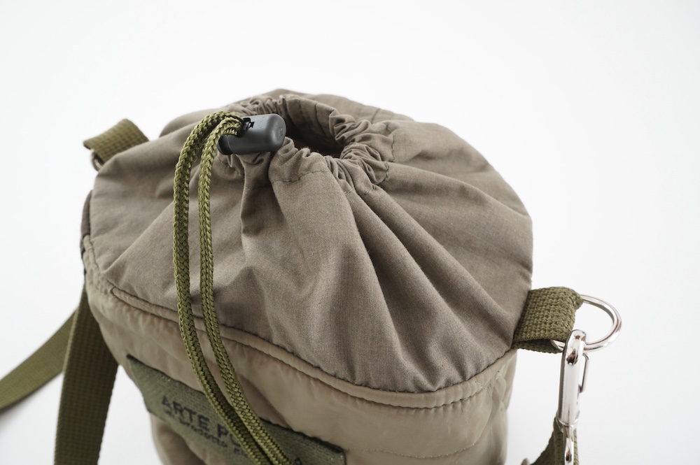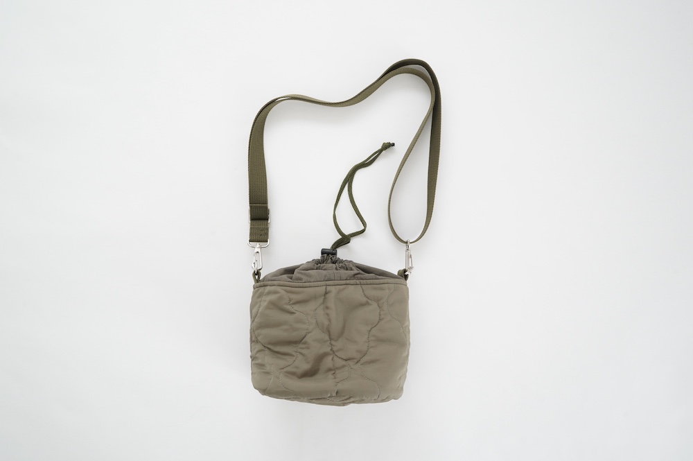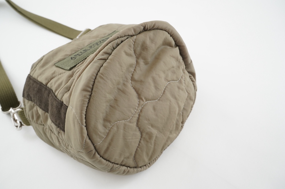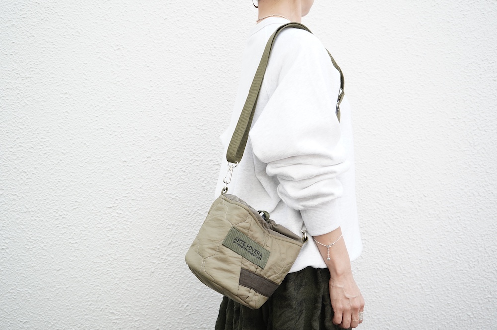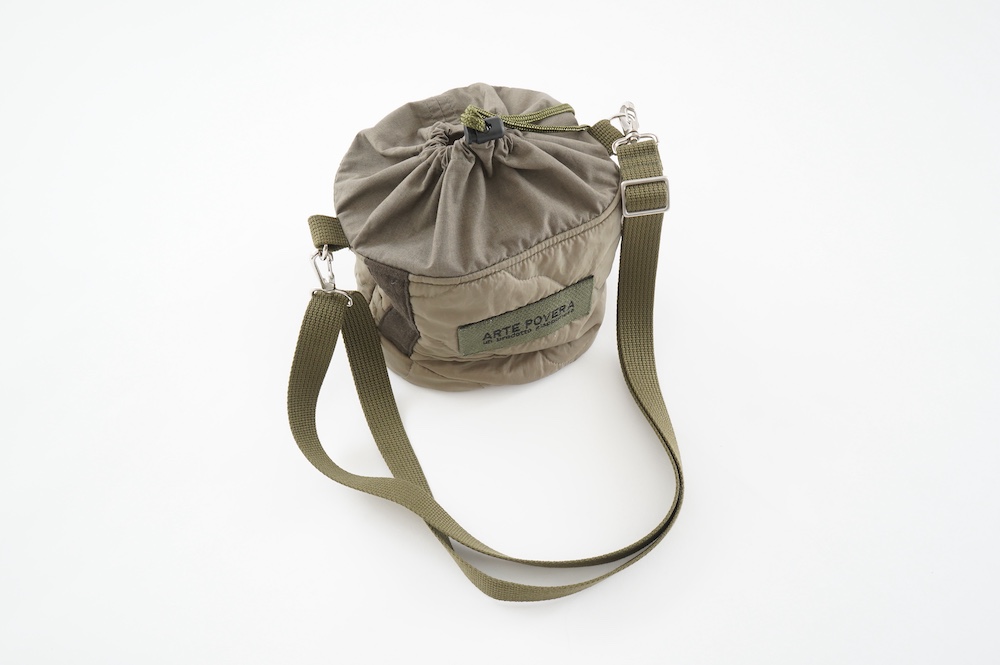 "アルテポーヴェラ"のバッグ。チェコ軍のキルトライナーをリメイク素材として使用した巾着バッグ。丸底で、コロンと丸いシルエットが可愛らしい。長財布・ポーチ・携帯などを収納してもまだ余裕のある収納力で、内側にはポケットもついています。取り外し可能なショルダーベルトで長さ調整可能。ベルトを外して大きめの巾着としても使えます。キルト素材で軽く、季節を問わずに活躍しそうな万能巾着バッグです。