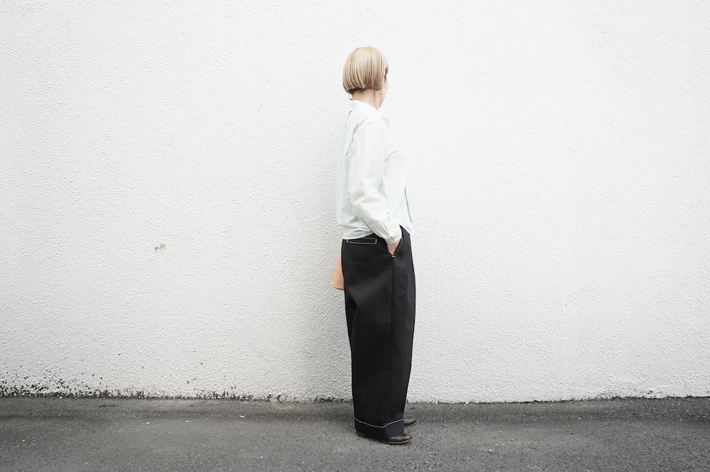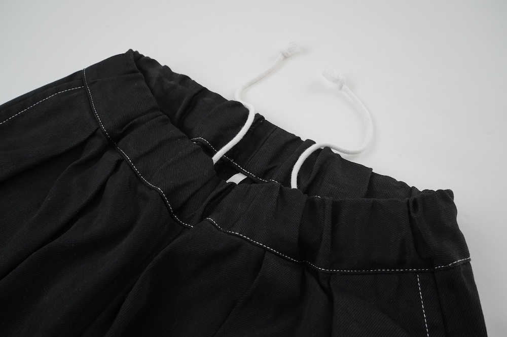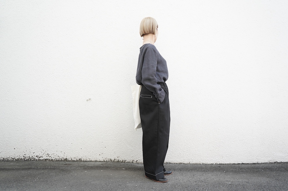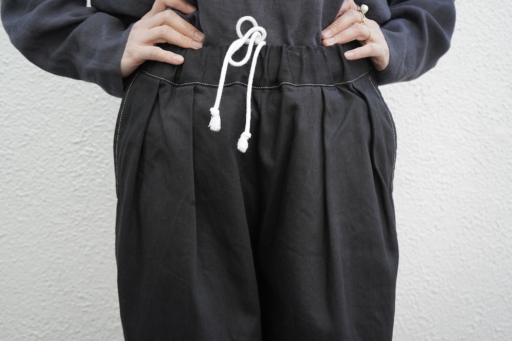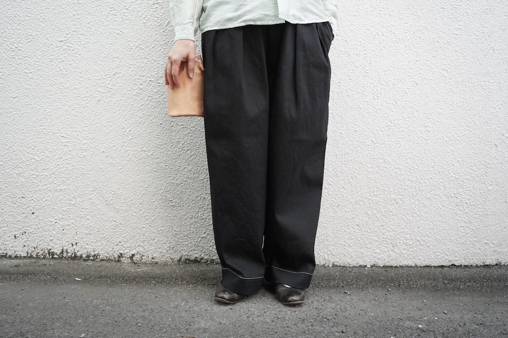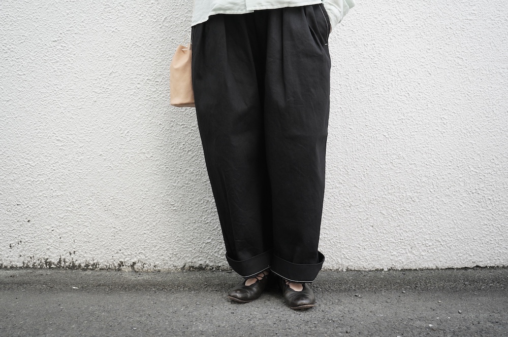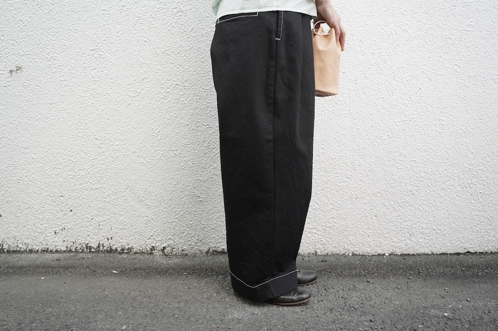 シルエットは、ワイドながらゆるやかにテーパードした同ブランドの定番的存在の2タックワイドテーパーパンツ。ウエストに2タック入っているので、腰回りはゆったり。ハリのある素材感でワイドなシルエットを崩すことなく穿いていただけます。ウエストはゴムと紐の調節で楽に穿いていただける仕様です。