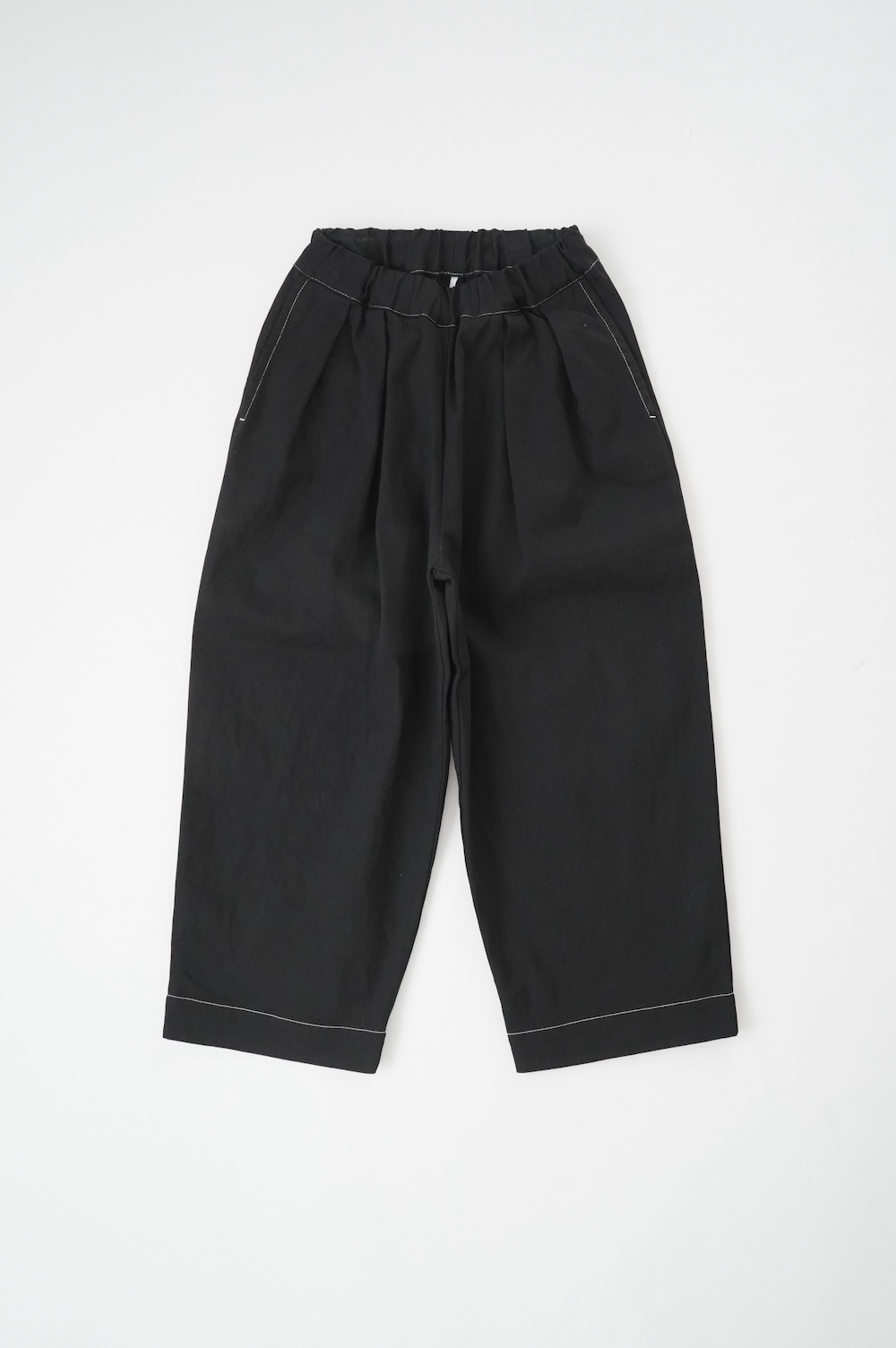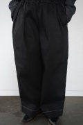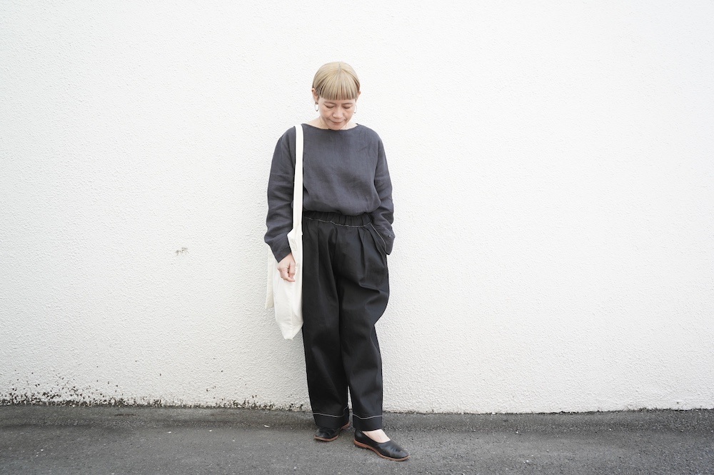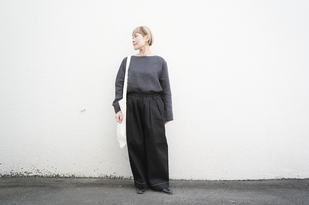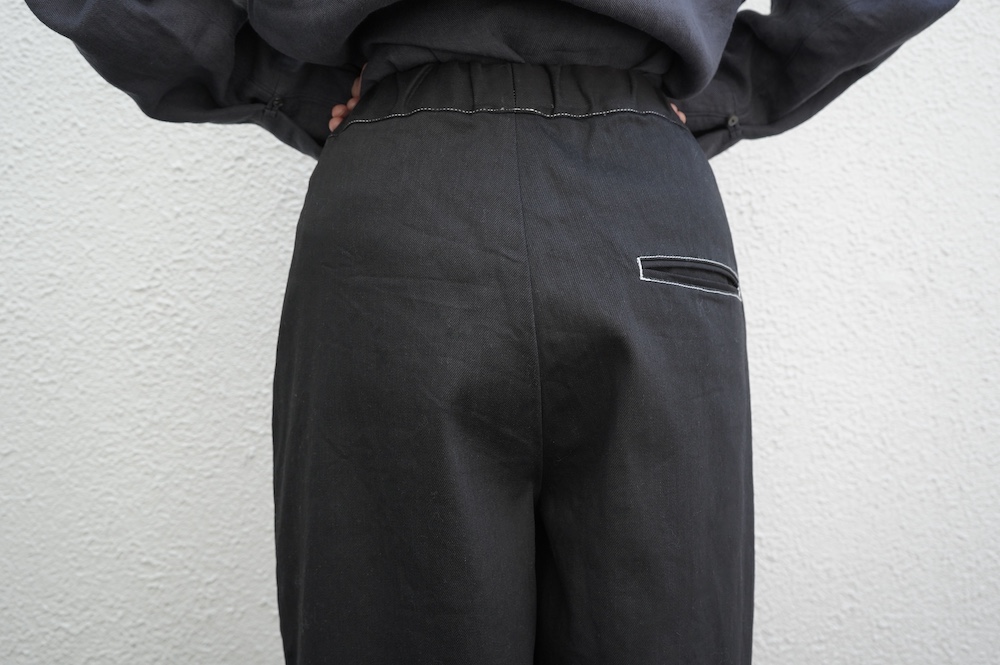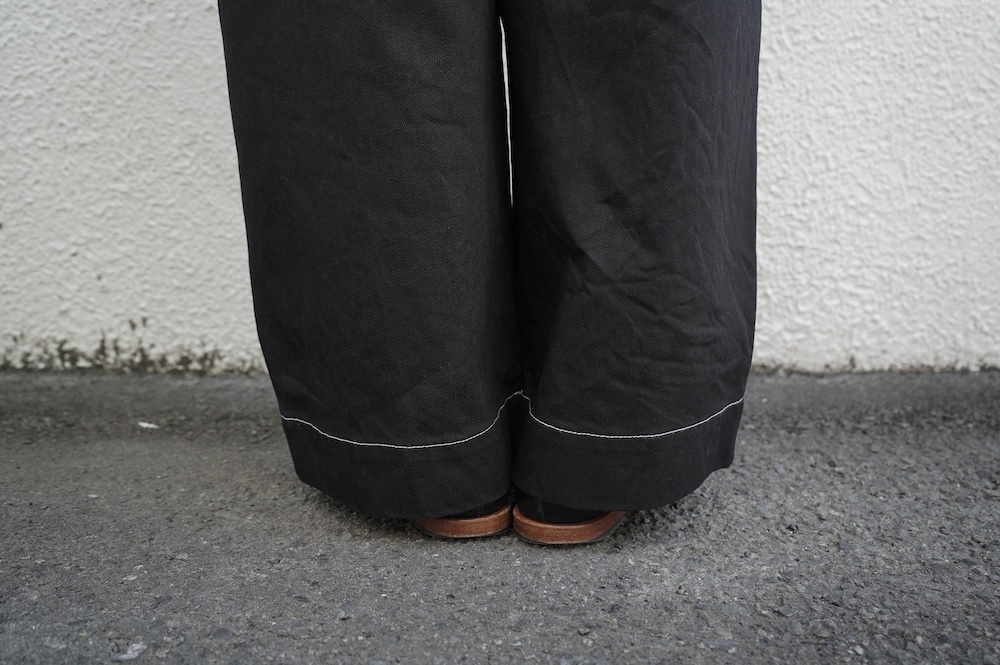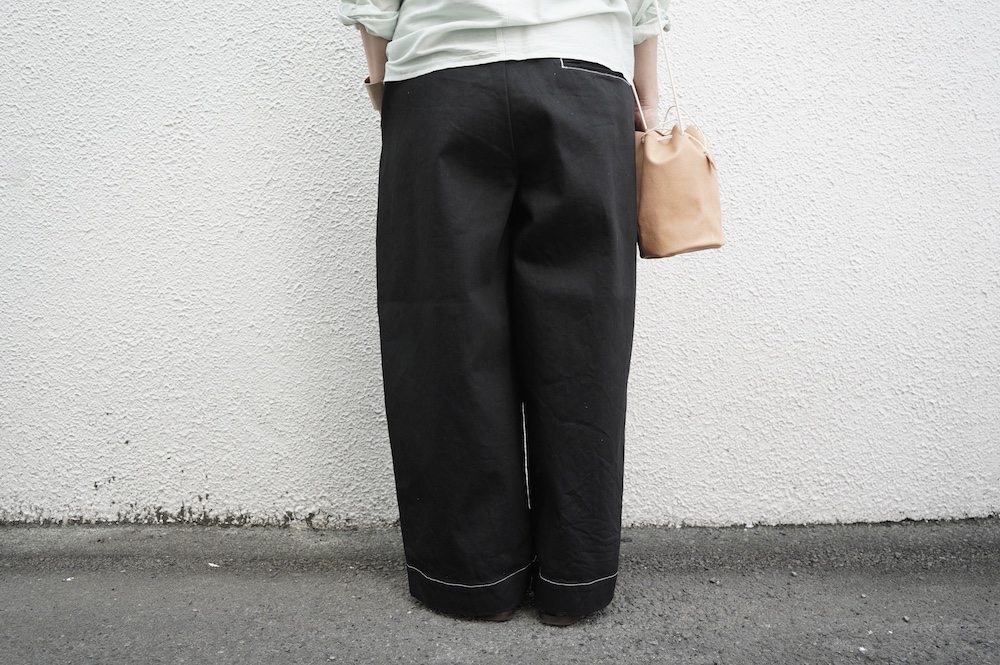 シルエットは、ワイドながらゆるやかにテーパードした同ブランドの定番的存在の2タックワイドテーパーパンツ。ウエストに2タック入っているので、腰回りはゆったり。ハリのある素材感でワイドなシルエットを崩すことなく穿いていただけます。ウエストはゴムと紐の調節で楽に穿いていただける仕様です。