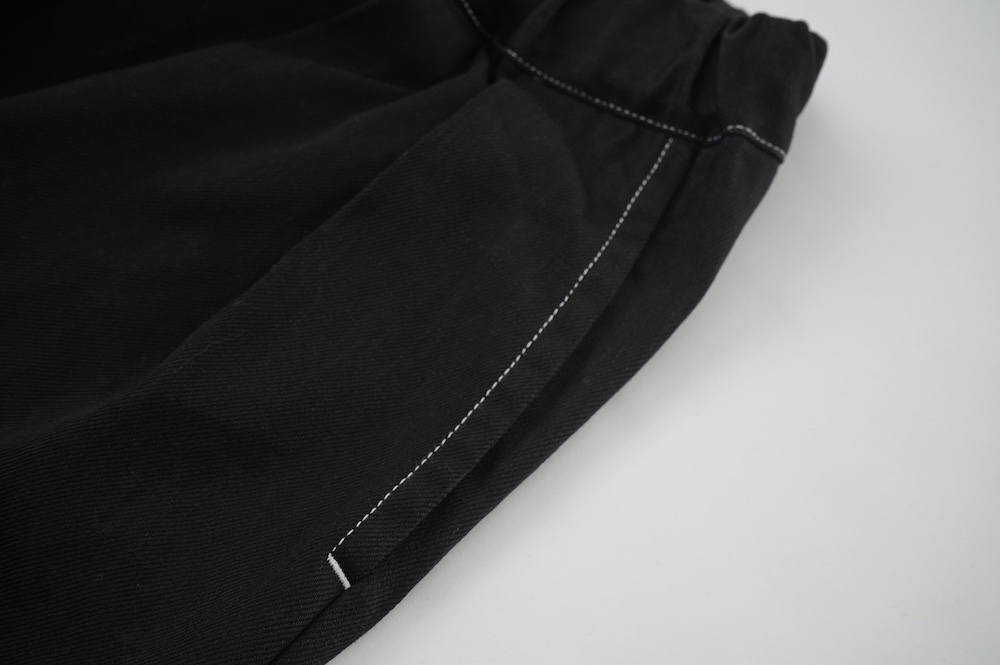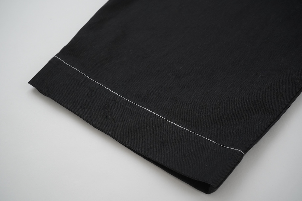 しっかりとしたストレッチ混のデニムを使用しています。触った感触はガシッとしていますが、ストレッチ性があって馴染みやすいデニムかと思います。ブラックは白ステッチの配色が効いています。