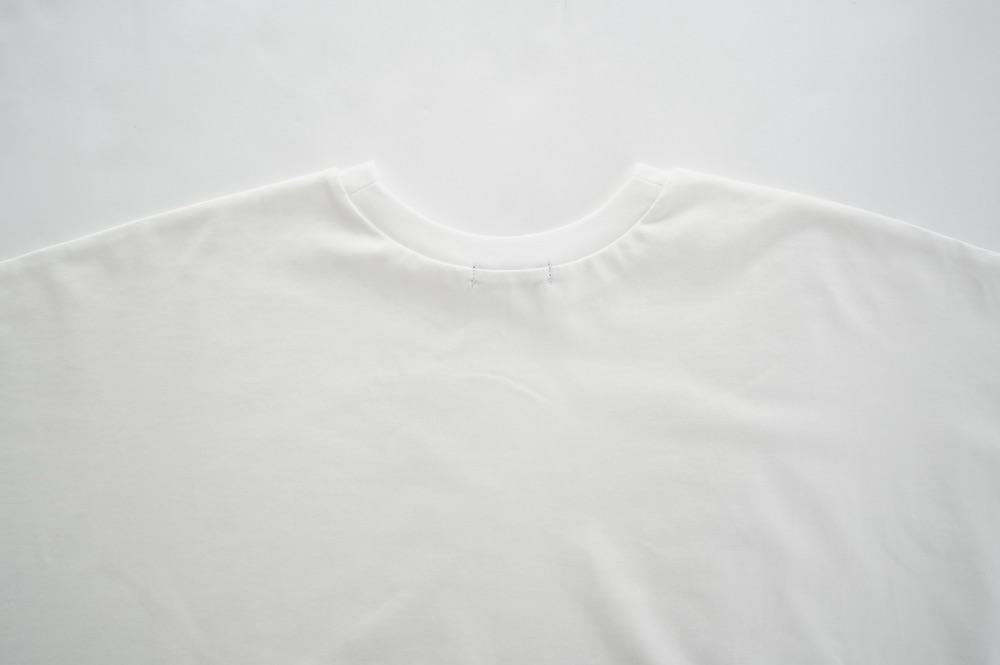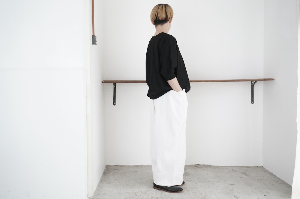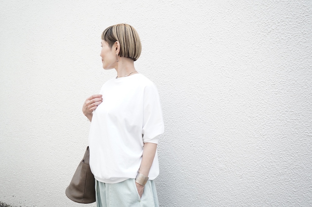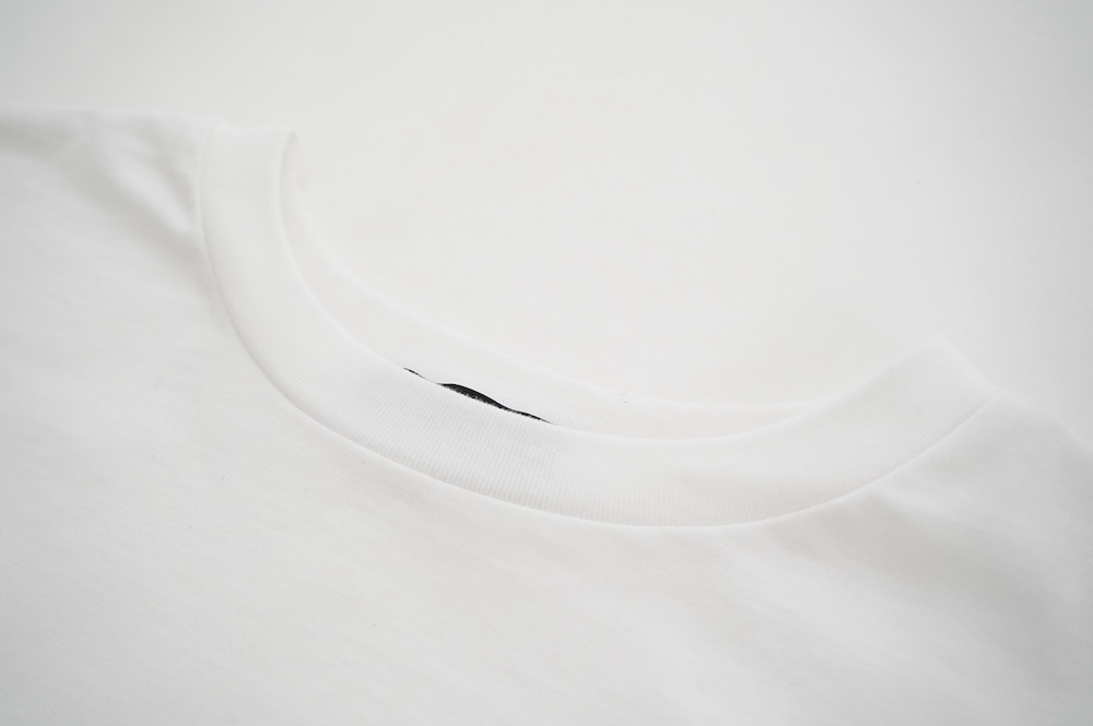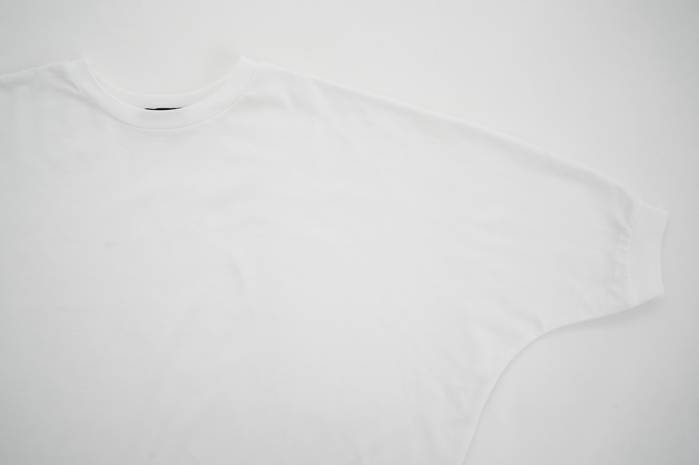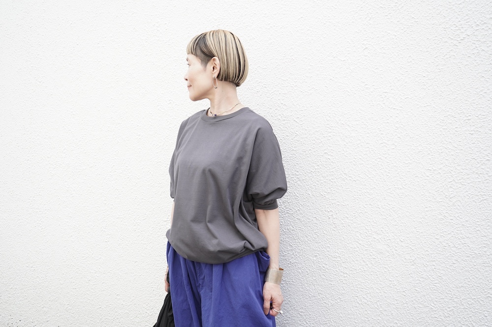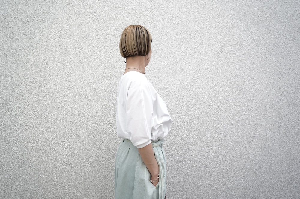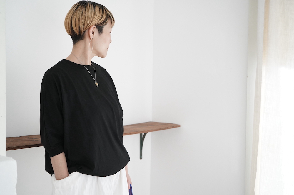 トラバイユマニュアルのカットソー。環境に配慮した染色方法を用いた天竺生地を使用。程よい厚みで透け感も少なく、また身体の線を拾いにくい生地感です。長年展開していたクラシック天竺と比べるとやや薄手で、柔らかな肌触りです。