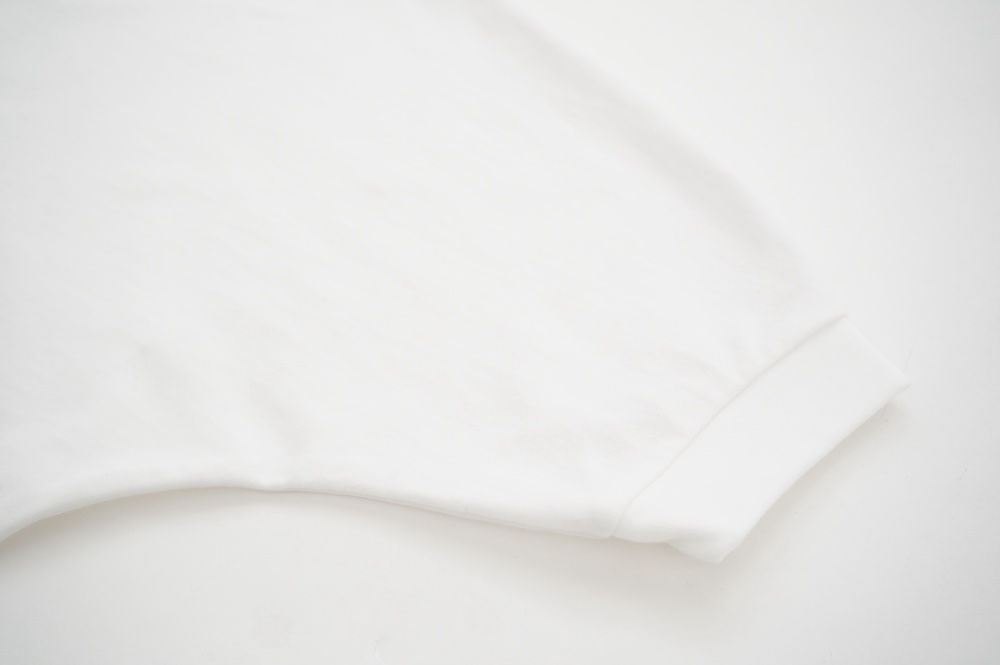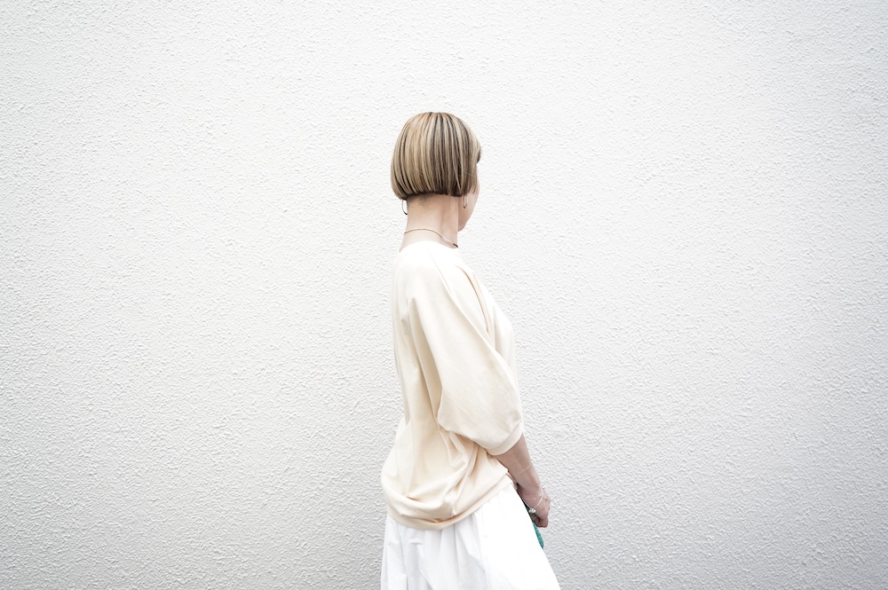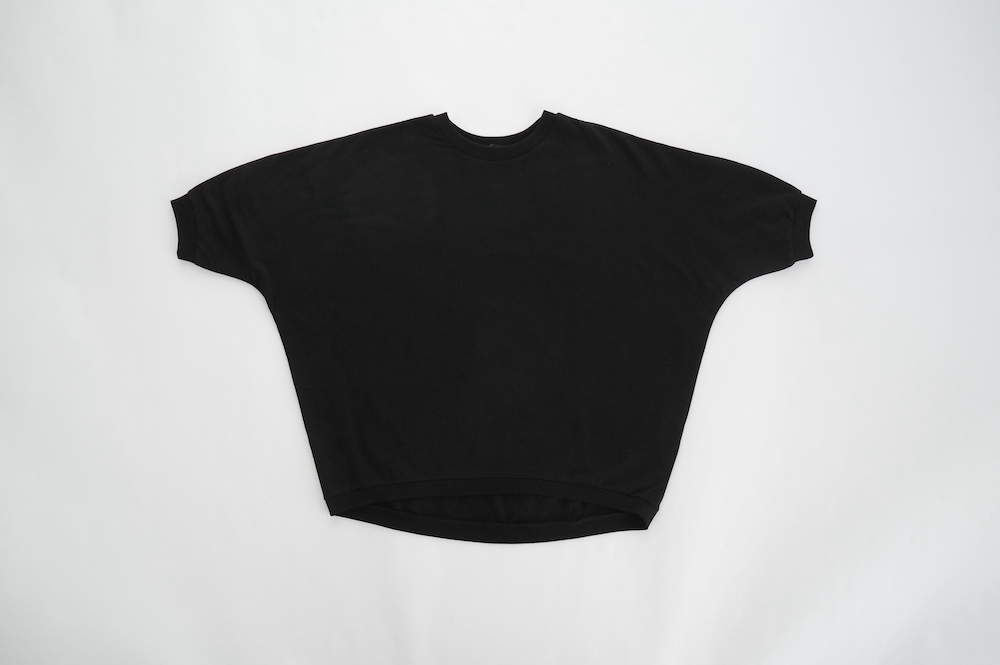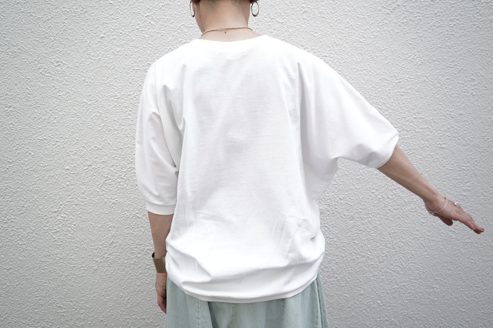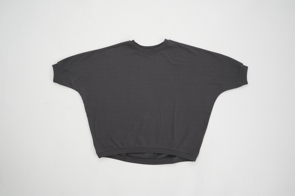 デザインはドルマンスリーブのゆとりがあるシルエットのプルオーバー。袖口のリブが肘あたりにくるので、袖周りが程よくゆとりあるシルエットに。着丈は前後差があり、後ろが少し長めになっています。デザイン性があり一枚でサマになるプルオーバーです。