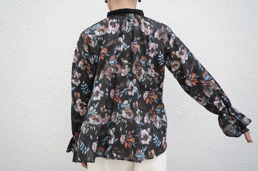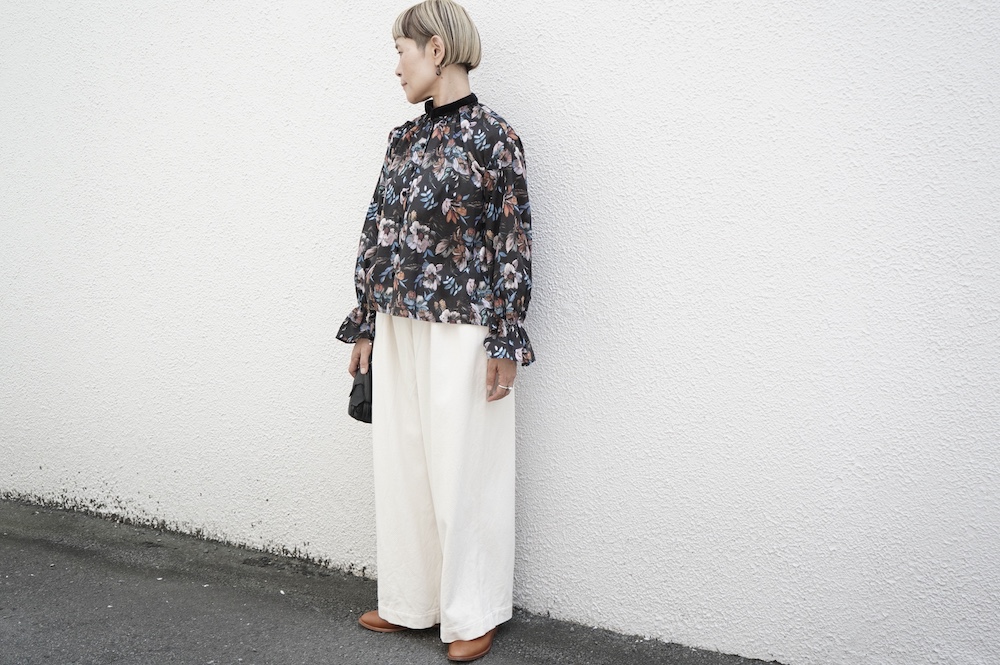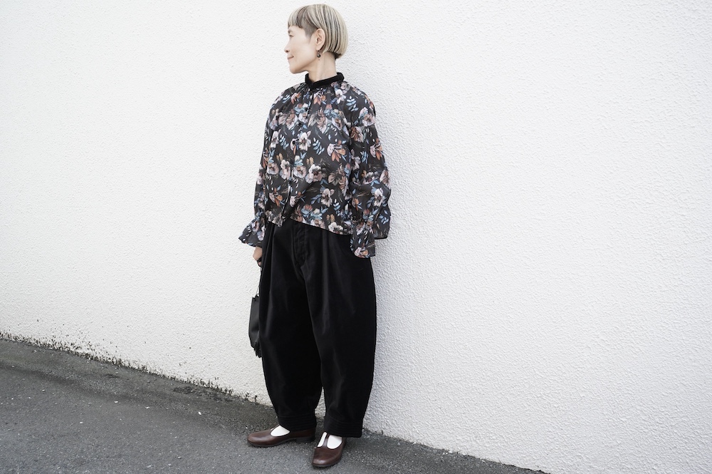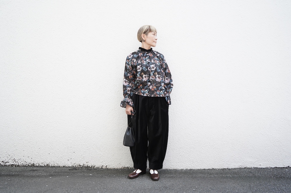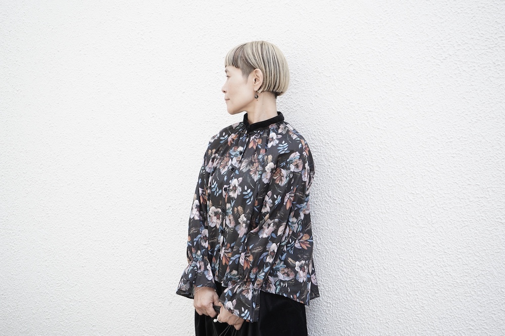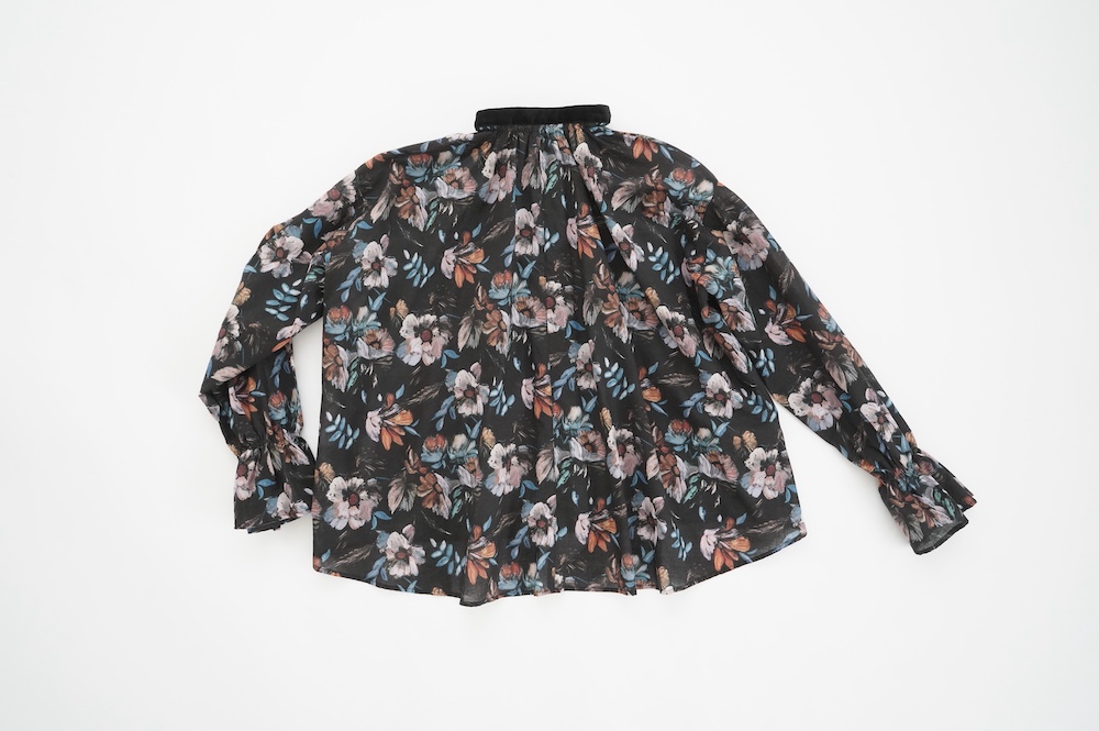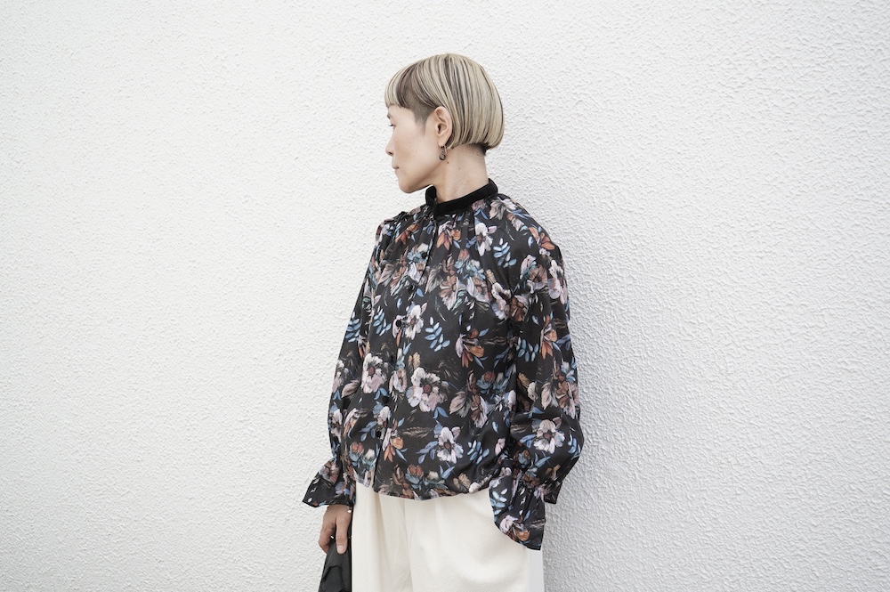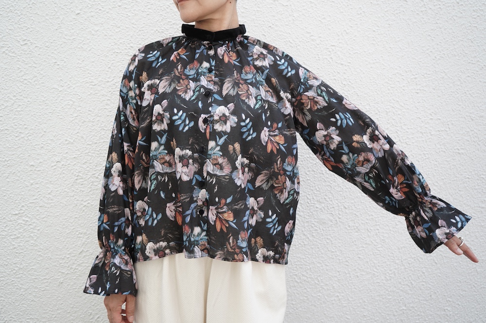 デザインはシンプルなバンドカラーに、1本のゴムシャーリングで印象付けるデザインがとても特徴的です。バンドカラー部分と、フロントの包みボタンはコットンのベルベット生地を使用しており、秋冬らしいシックな印象に。袖口にゴムを入れたフレアなデザインは袖を捲ることで違った表情を生み、着る楽しさが増してきます。一枚で季節感のあるシックなスタイリングになる素敵なブラウスです。