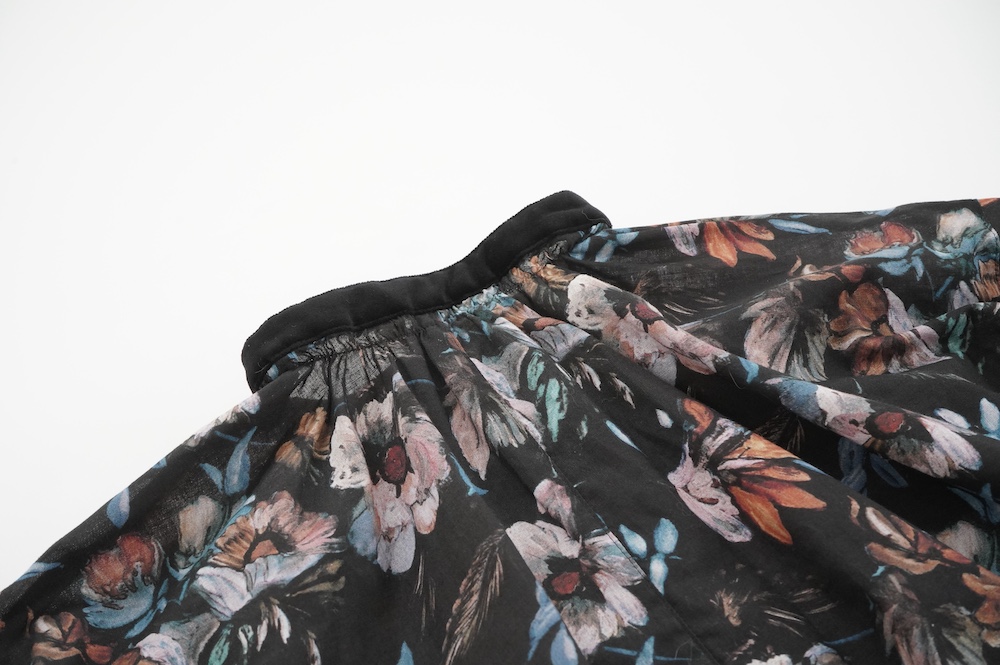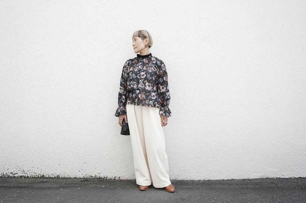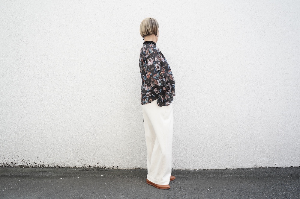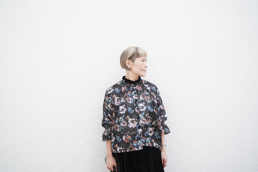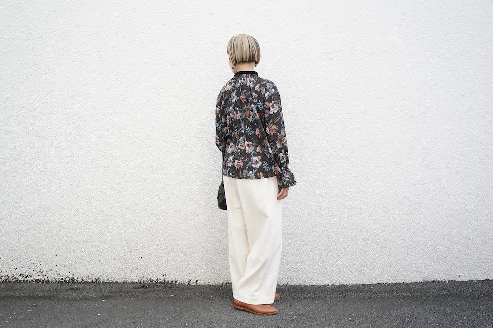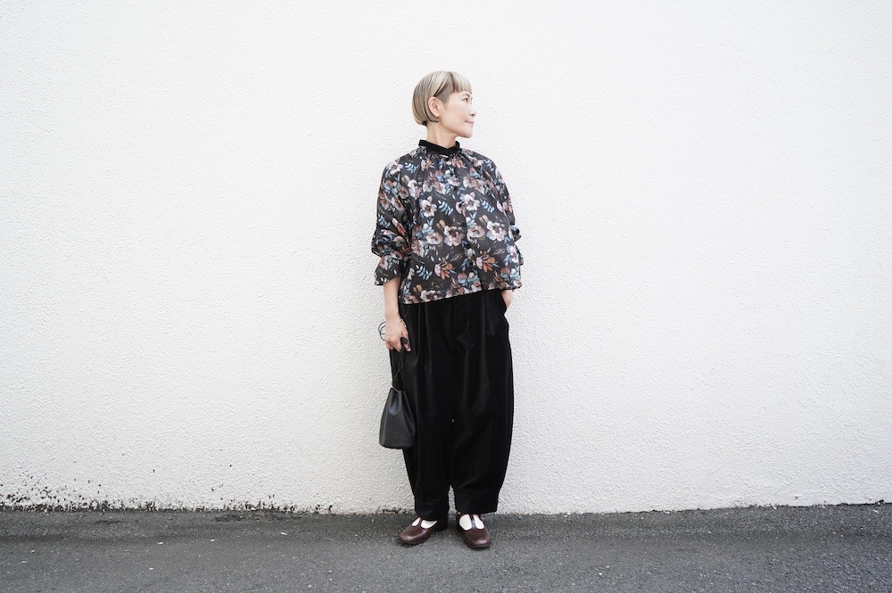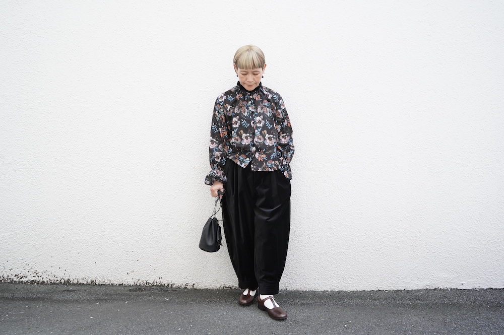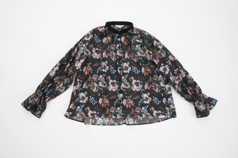 デザインはシンプルなバンドカラーに、1本のゴムシャーリングで印象付けるデザインがとても特徴的です。バンドカラー部分と、フロントの包みボタンはコットンのベルベット生地を使用しており、秋冬らしいシックな印象に。袖口にゴムを入れたフレアなデザインは袖を捲ることで違った表情を生み、着る楽しさが増してきます。一枚で季節感のあるシックなスタイリングになる素敵なブラウスです。