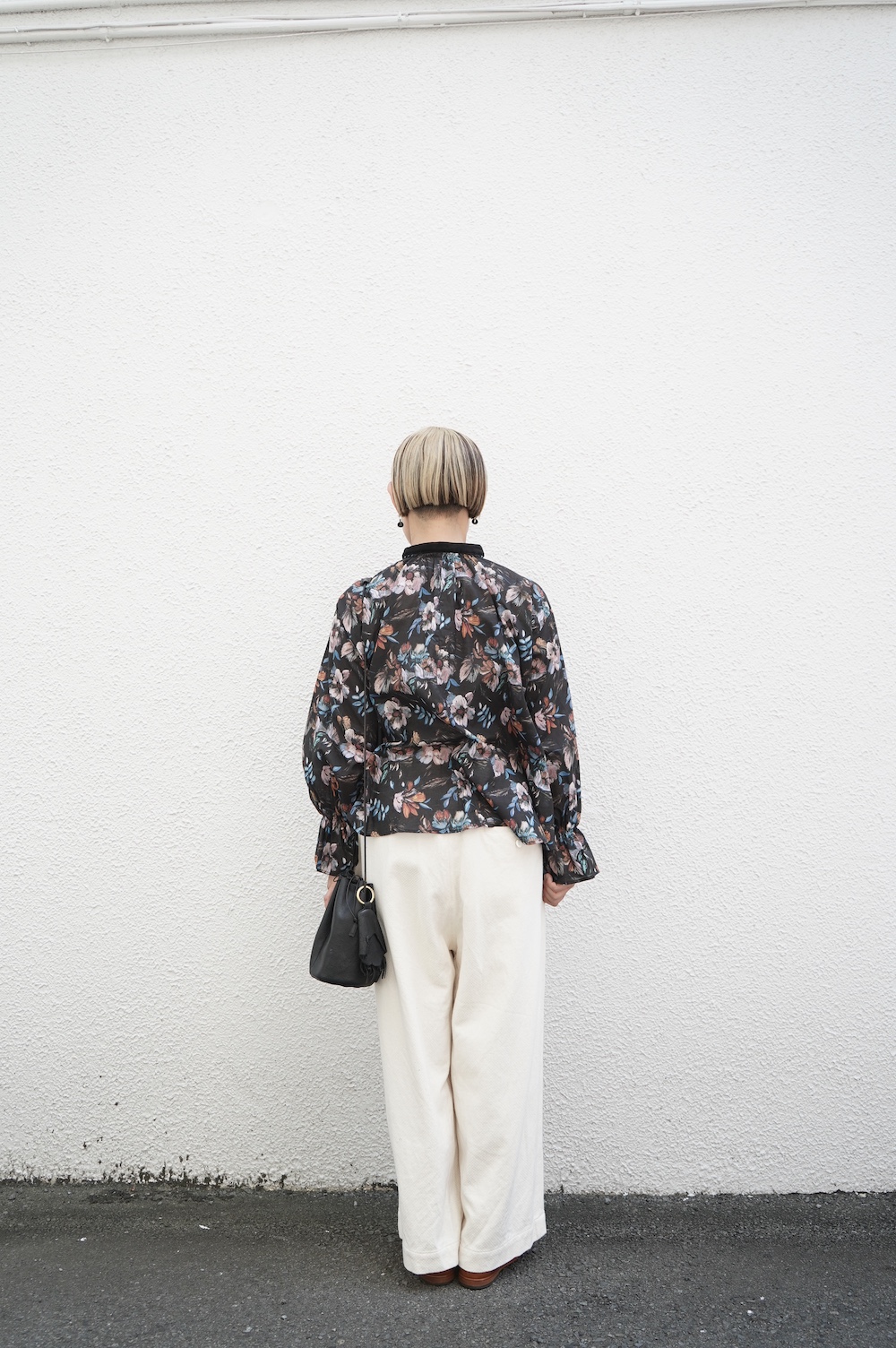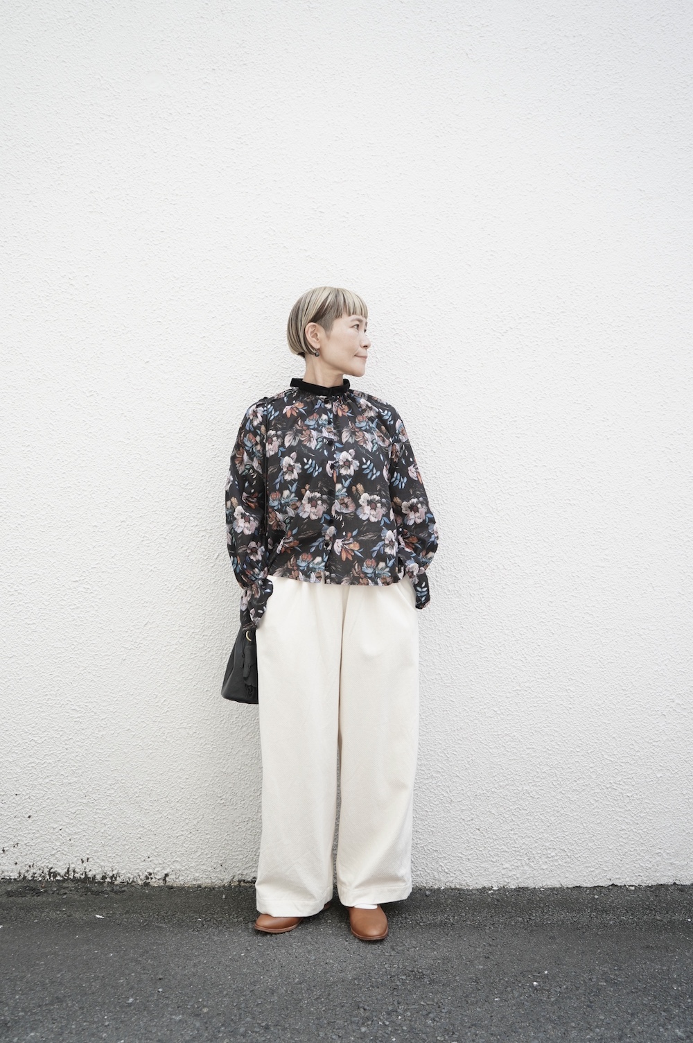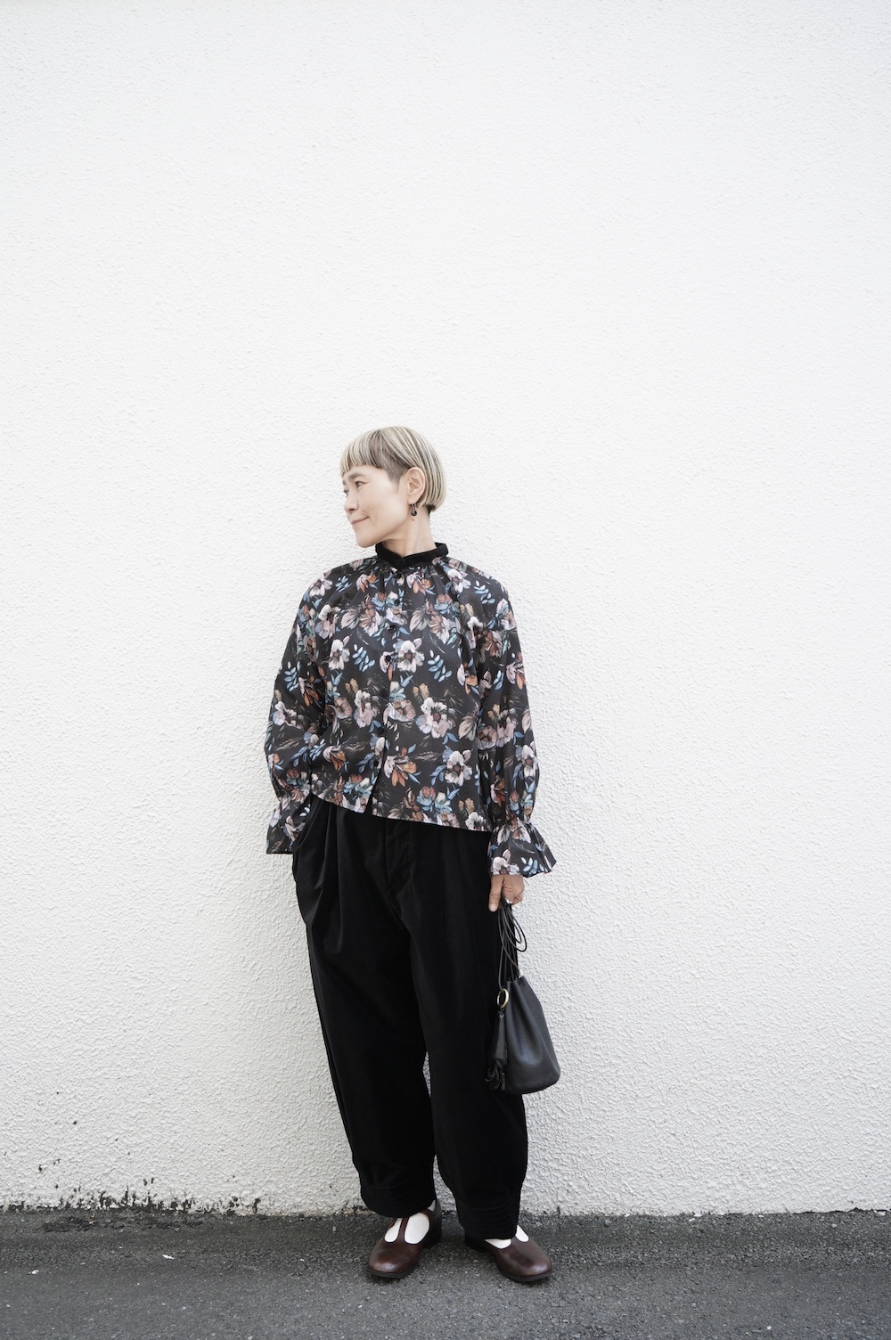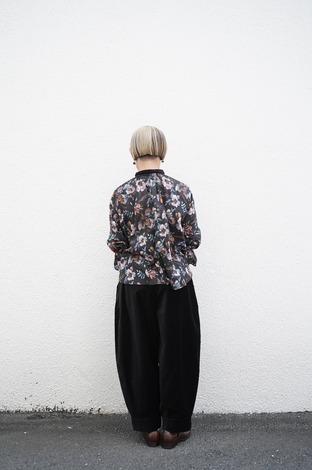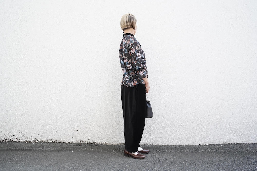 デザインはシンプルなバンドカラーに、1本のゴムシャーリングで印象付けるデザインがとても特徴的です。バンドカラー部分と、フロントの包みボタンはコットンのベルベット生地を使用しており、秋冬らしいシックな印象に。袖口にゴムを入れたフレアなデザインは袖を捲ることで違った表情を生み、着る楽しさが増してきます。一枚で季節感のあるシックなスタイリングになる素敵なブラウスです。