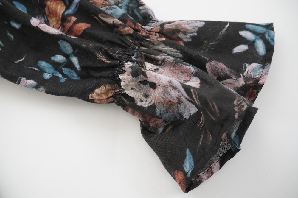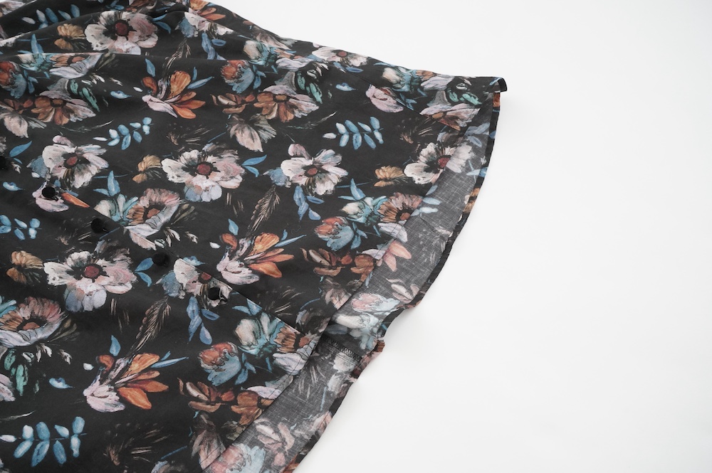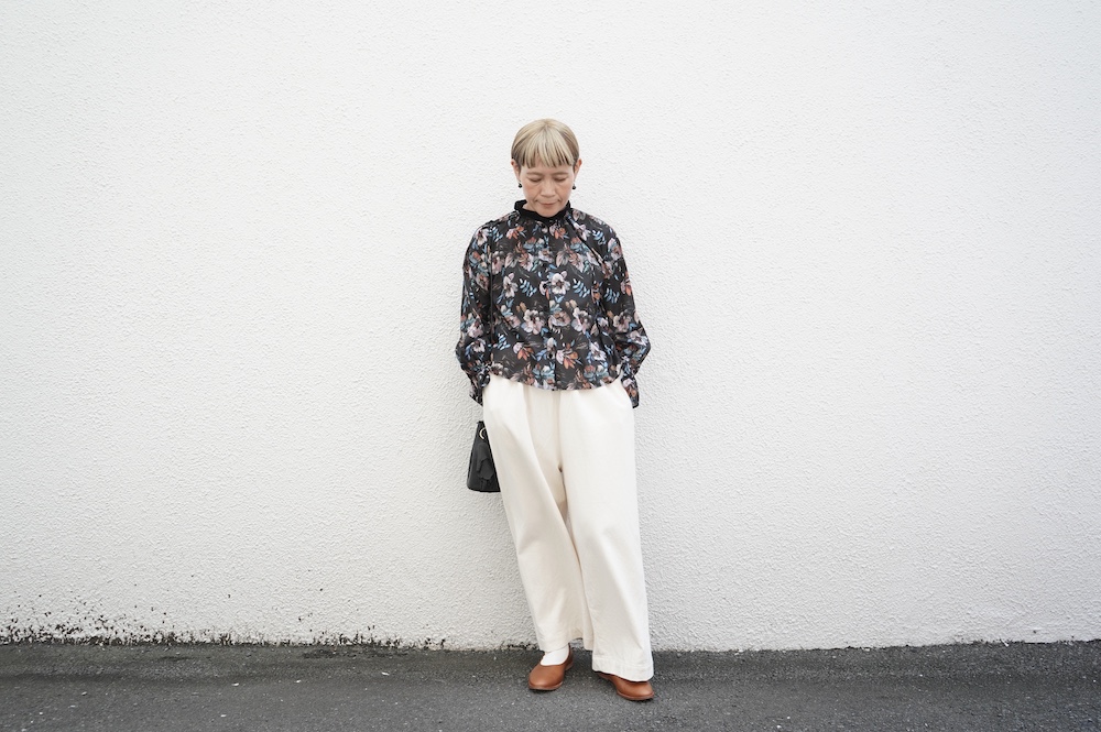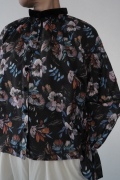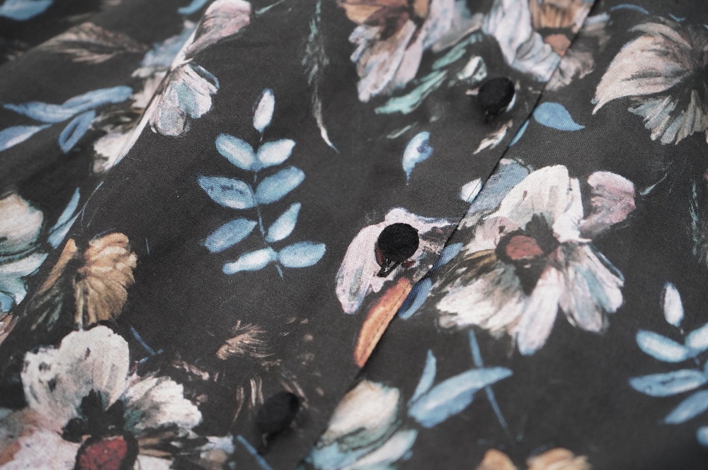 "ススリ"のブラウス。植物の図案の古いドローイングから柄を起こした、オリジナルのフラワープリント生地を使用。ガーゼのようなやや甘めの織りのコットン生地なので、晩夏からすぐに着ていただきやすい素材です。筆の刷毛目のタッチや絵の具の色の重なりなどもしっかりと表現された、シックな色使いの中に力強さも感じられるフラワープリント。甘くない、大人な女性のフラワープリントです。