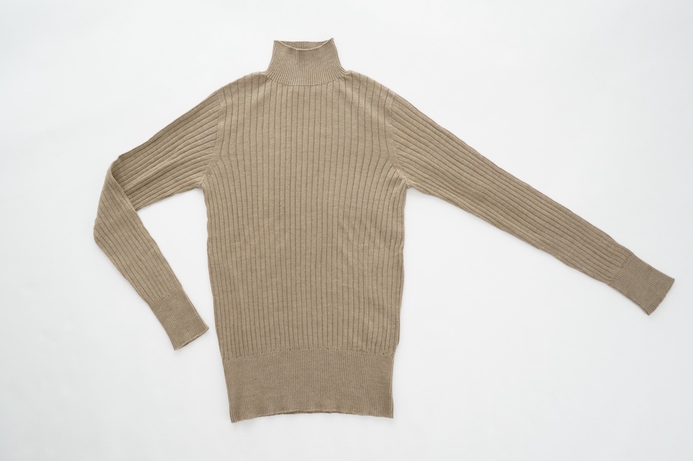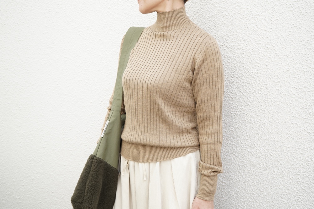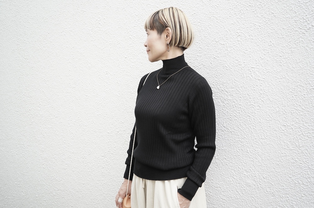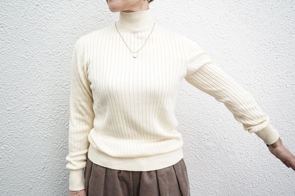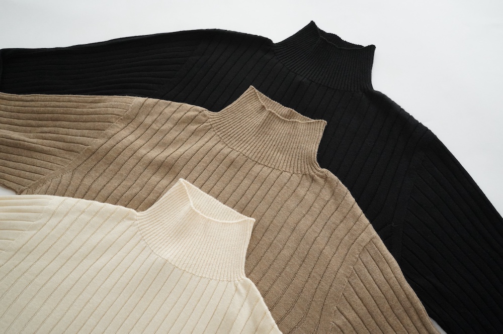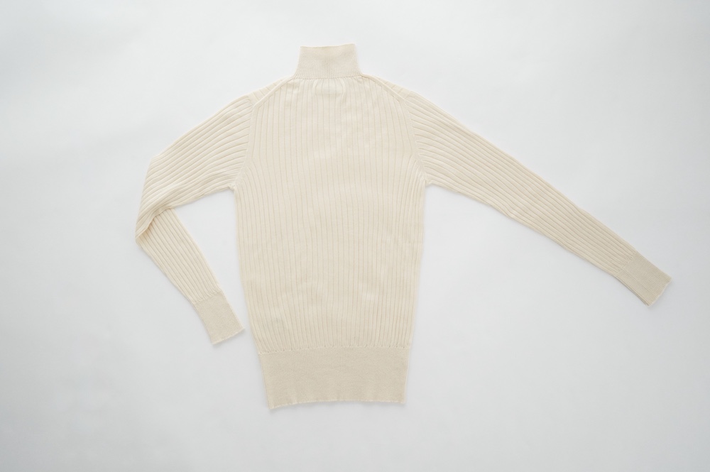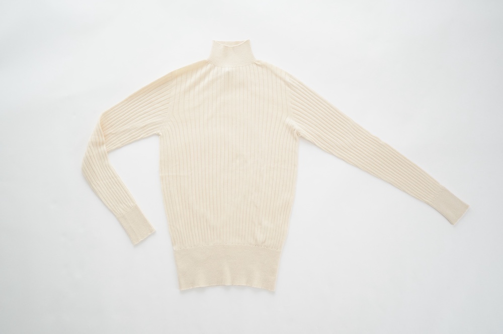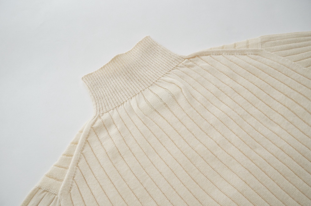 デザインは、首元がすっきりと見える低めのハイネックの針抜きリブセーター。リブ編みなのでフィット感はもちろんありますが、緩めのキックバックで一枚でもラインを気にせず着ていただけます。脇は縫い目のないホールガーメント仕様になっており、シルエットもより綺麗に見せてくれます。秋口から一枚で冬は保温性抜群のインナーとして、そしてまだ寒さの残る春先にもシルク素材は活躍してくれます。機能性、デザインともに抜群なSUSURI定番のセーターです。