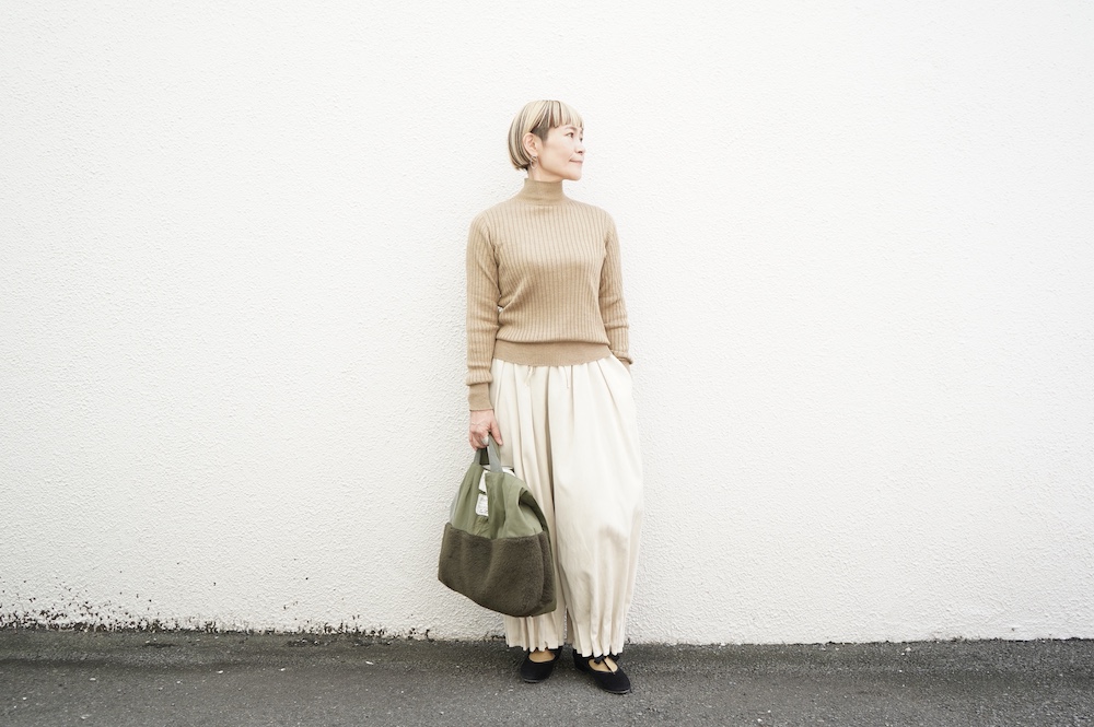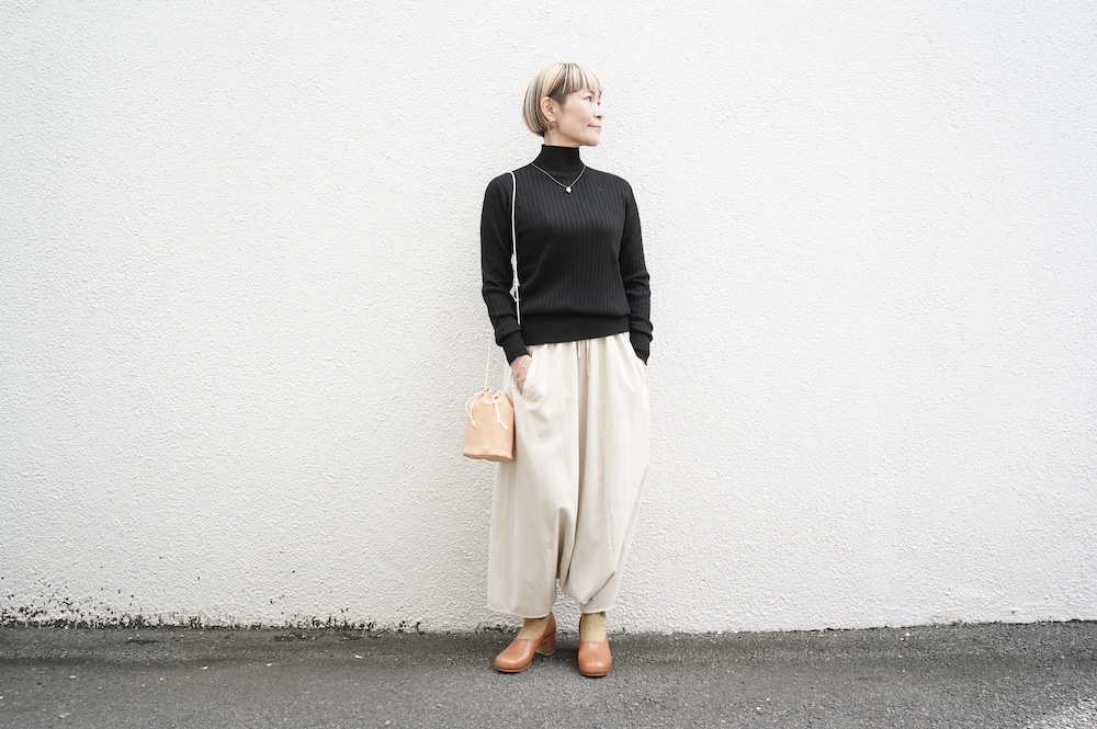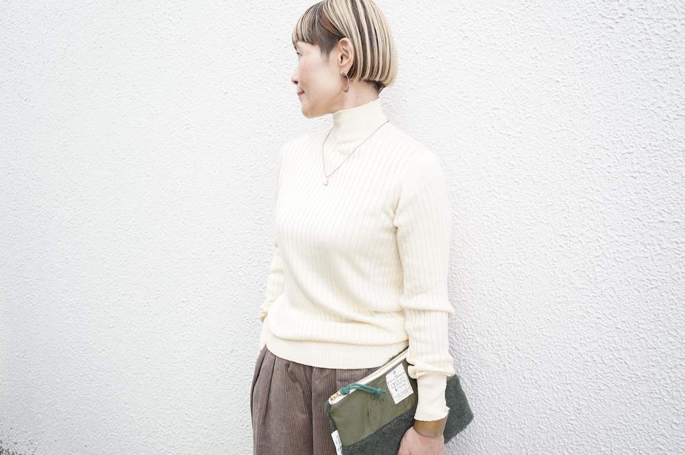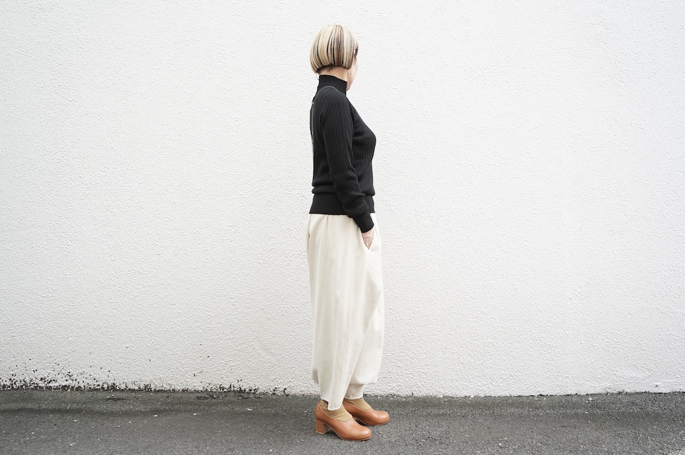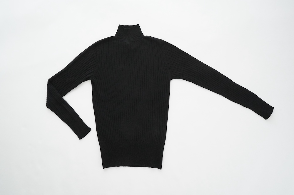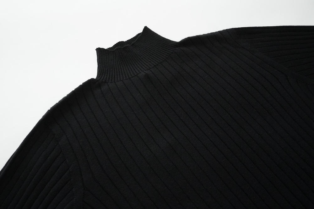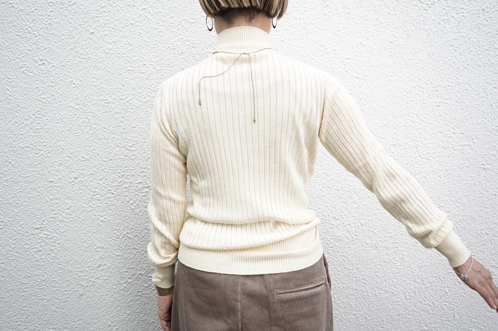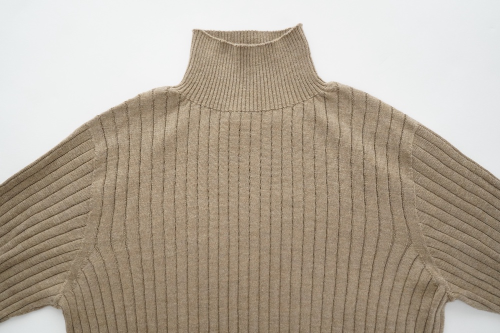 デザインは、首元がすっきりと見える低めのハイネックの針抜きリブセーター。リブ編みなのでフィット感はもちろんありますが、緩めのキックバックで一枚でもラインを気にせず着ていただけます。脇は縫い目のないホールガーメント仕様になっており、シルエットもより綺麗に見せてくれます。秋口から一枚で冬は保温性抜群のインナーとして、そしてまだ寒さの残る春先にもシルク素材は活躍してくれます。機能性、デザインともに抜群なSUSURI定番のセーターです。