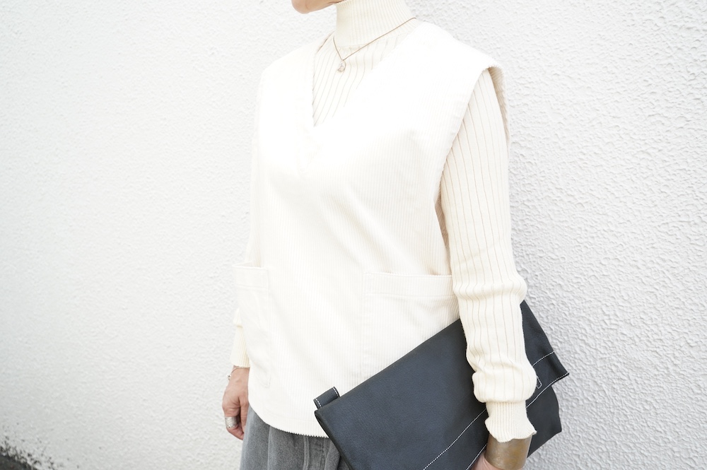 上からパンツと同素材のコーデュロイベストを