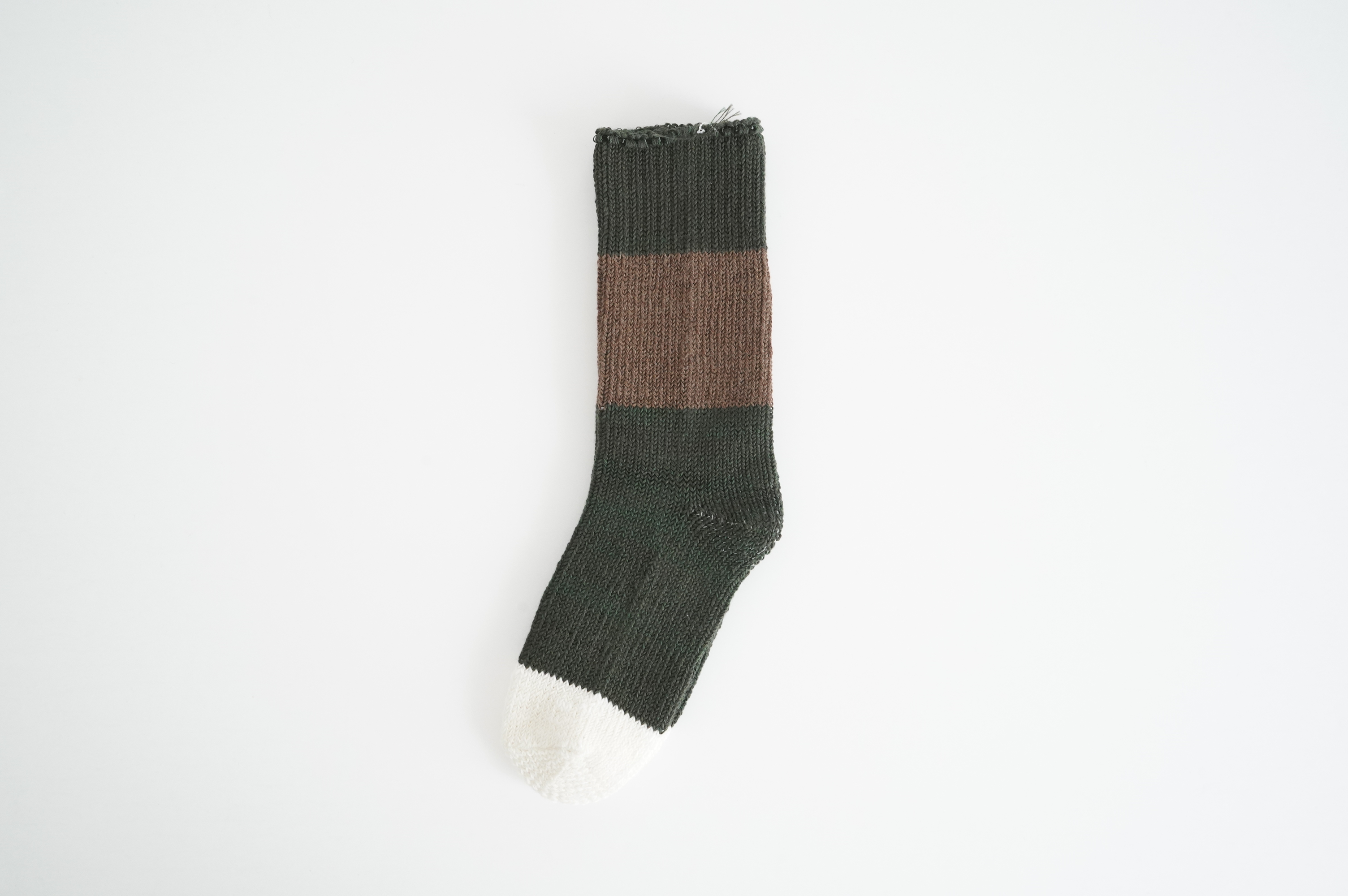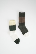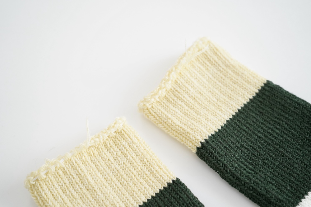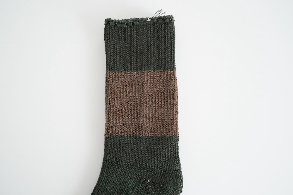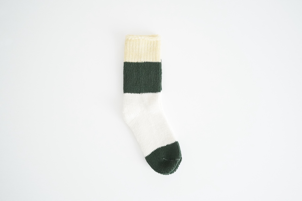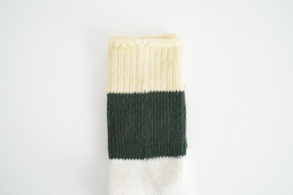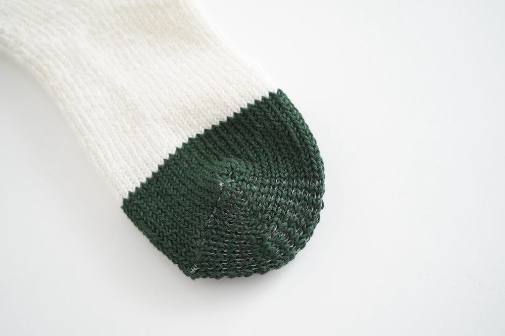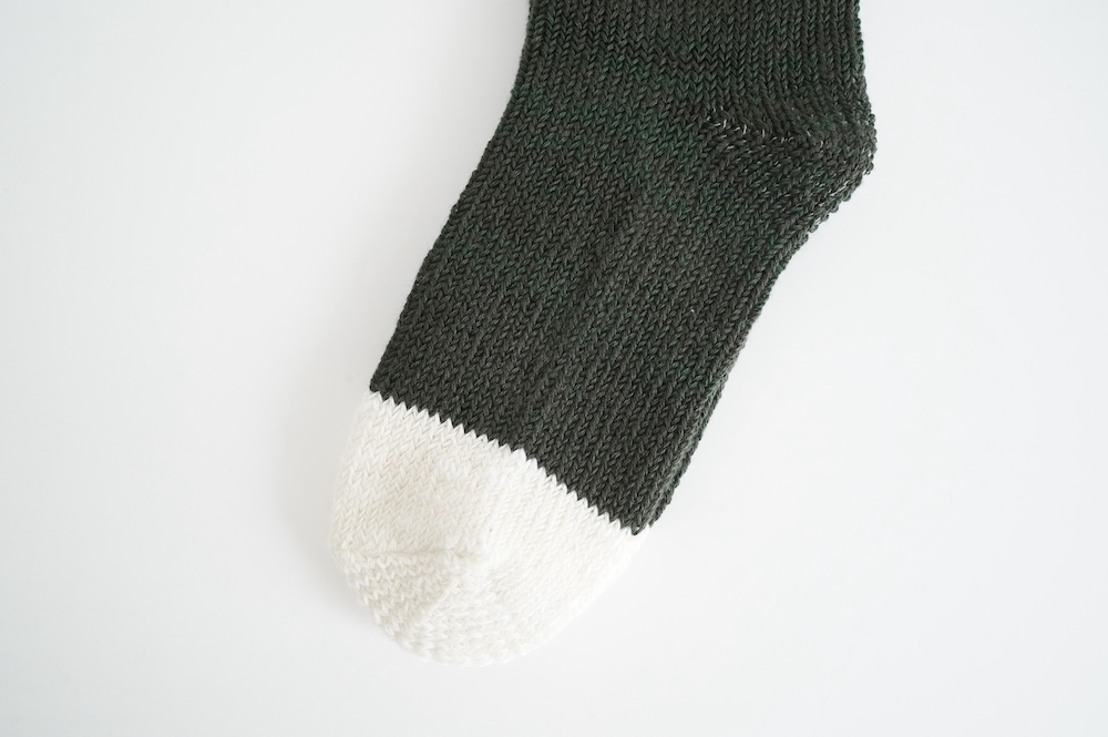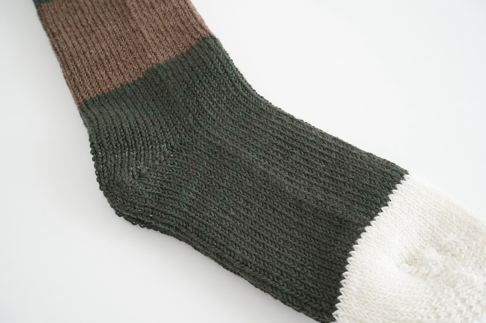 数年前からこの靴下のファンになり、毎年色違いで購入し続けています。写真はオーダー会で手に入れたR.U.のメンズに合わせた感じ。僕の個人的な感想では、まったく問題なく革靴に履けるソックスです。見た目はすごく厚みがありそうですが、薄手の伸びるタオルのような感触です。薄い靴下ではもちろんないのですが、ぜひ革靴にもお試しください