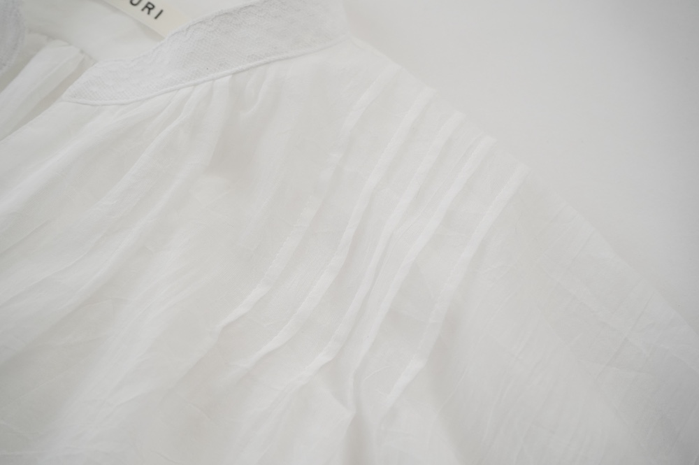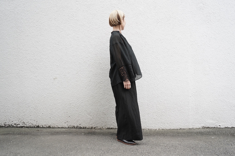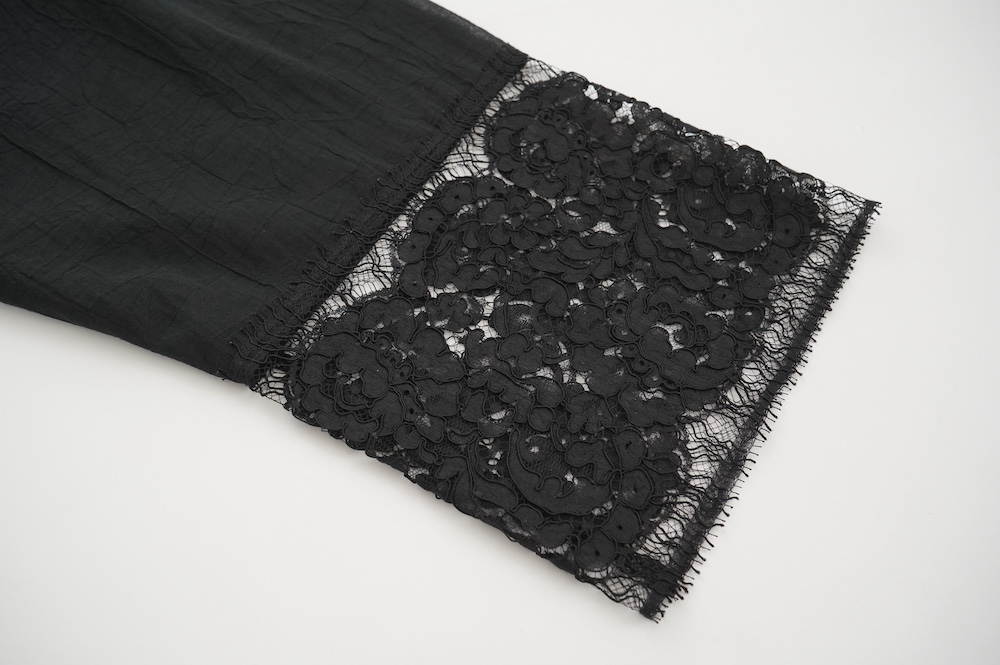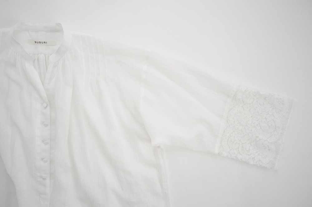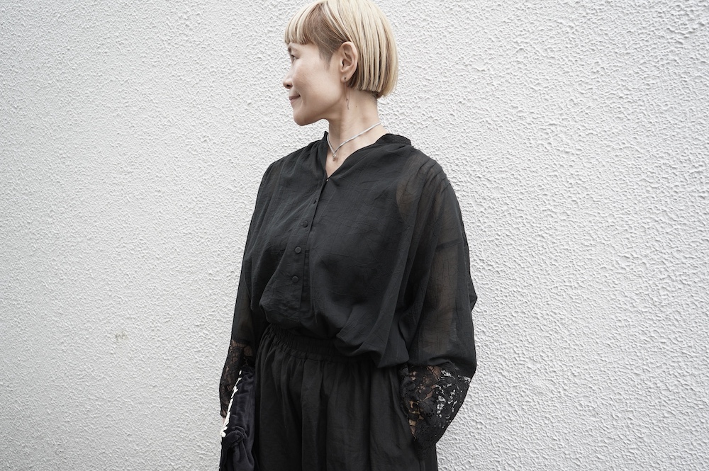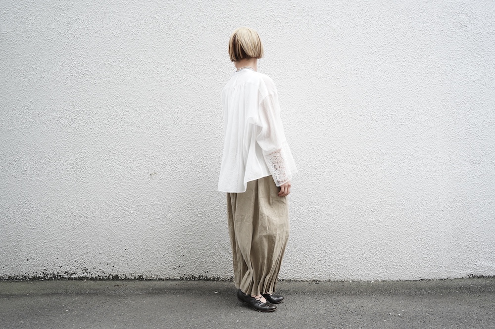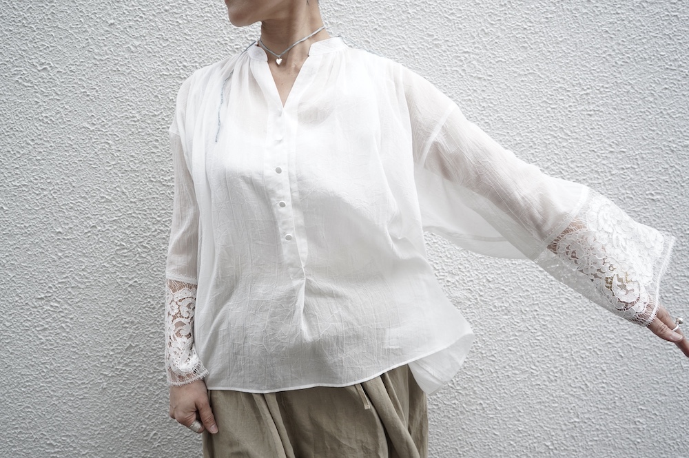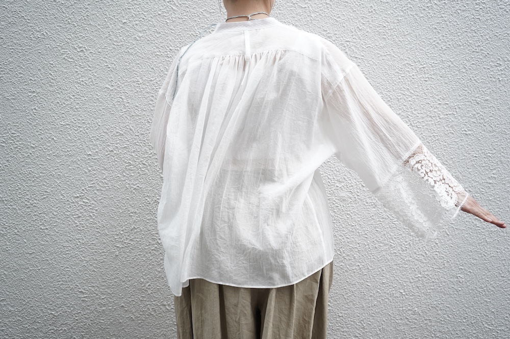 デザインは袖と襟にあしらわれたレースが目を引く、清涼感のあるプルオーバーブラウス。ボタンは一番上は付いておらず、着用するとV開きのような女性らしい印象に。前開きではなくプルオーバーです。使用しているレースはフランスのもので、繊細で複雑な模様が特徴的なリバーレースを使用。立体的で美しくとても華やかになります。肩ヨークはピンタック、後ろはギャザーが施されており、風が抜けるゆとりのあるシルエットです。見た目にも軽やかな、レースが美しいブラウスです。